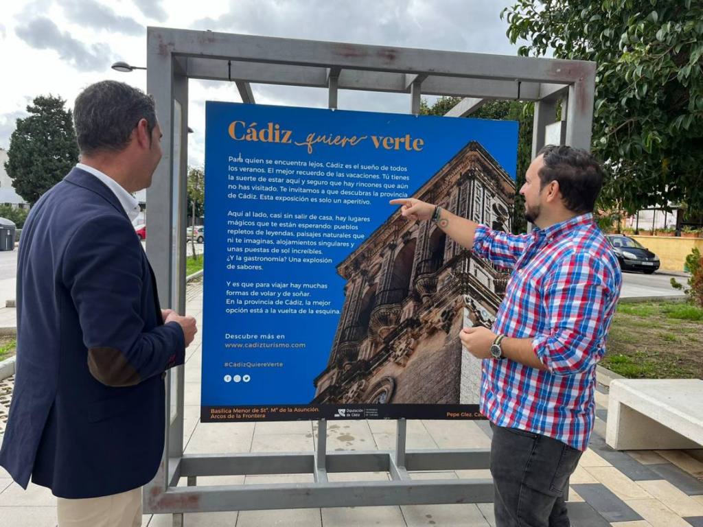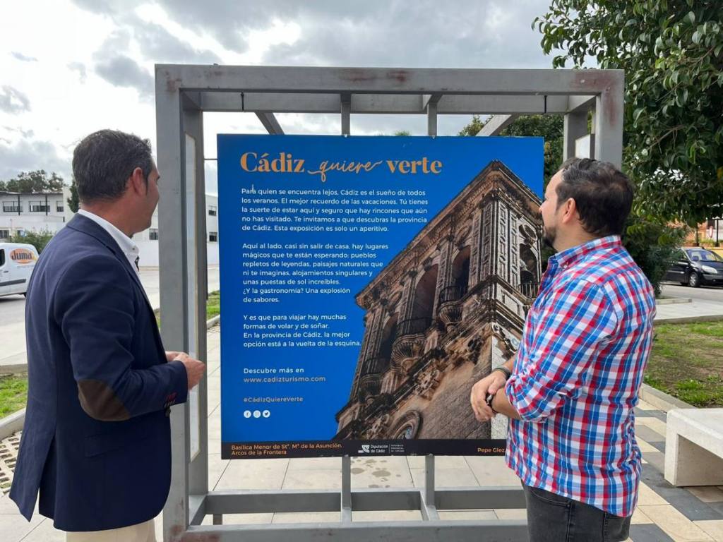 El concejal de Turismo, Pablo García; y el delegado de Cultura, Daniel Pérez Cumbre, han visitado esta muestra de con 19 fotografías en estructuras de gran formato, donde se reflejan diversos lugares de la provincia gaditana.