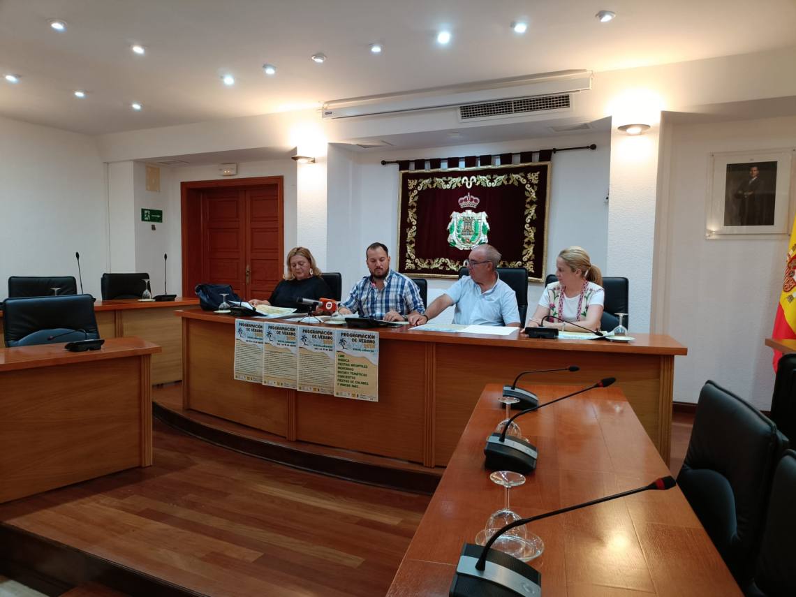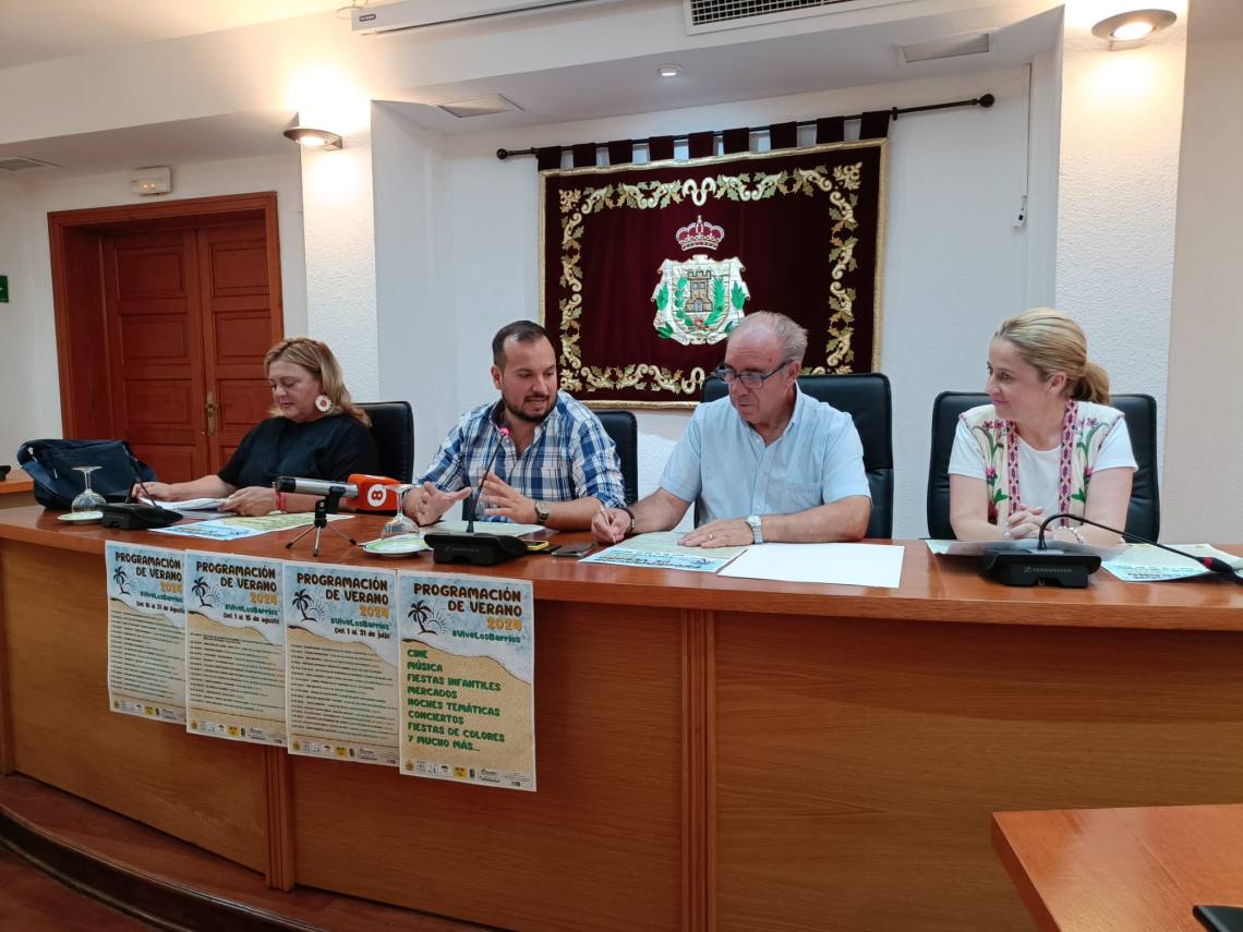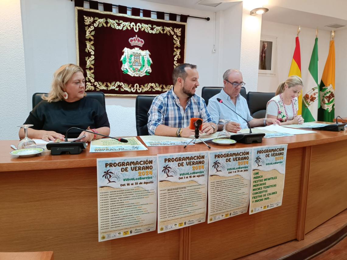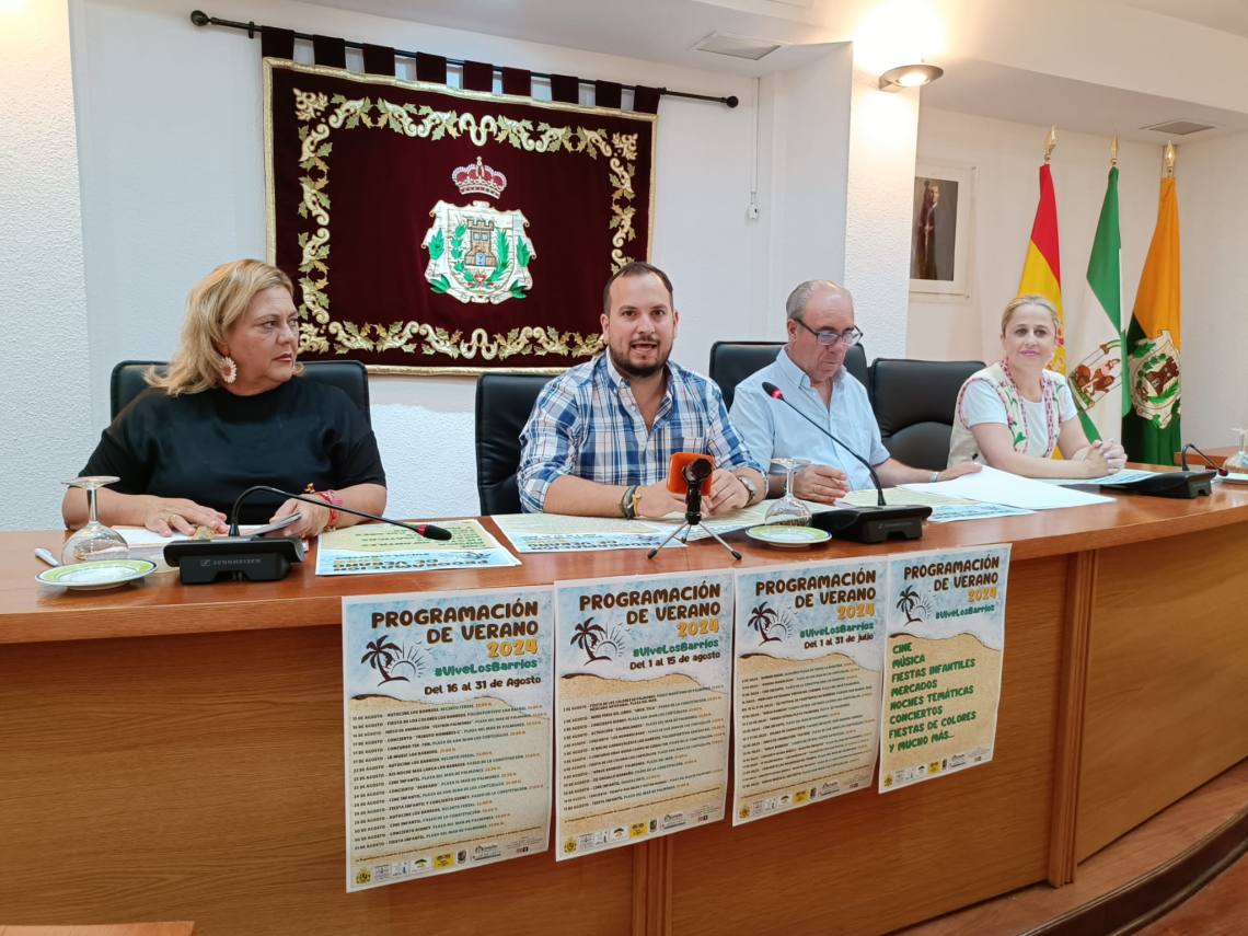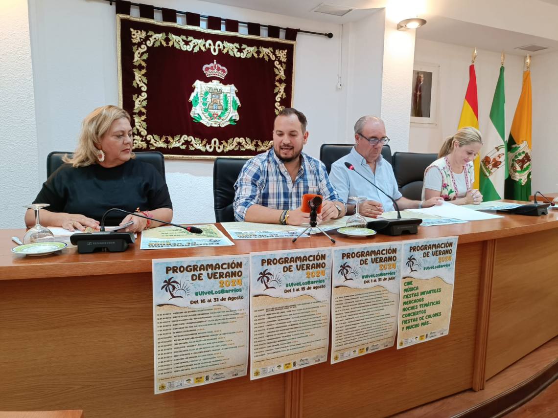 El concejal delegado de Festejos, Daniel Pérez Cumbre, la delegada de Los Cortijillos, May Gallego; el concejal delegado de Palmones, José Antonio Gómez; y la concejala de Guadacorte, Geli Ferral, han presentado en rueda de prensa el contenido de la programación de verano 2024 organizada por el Ayuntamiento barreño y que se desarrollará durante los meses de julio y agosto en el municipio.