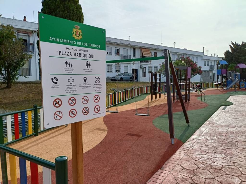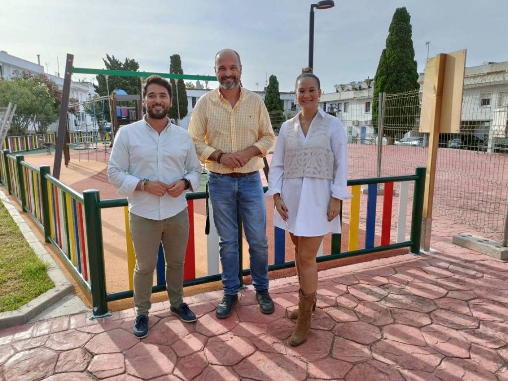 El alcalde de Los Barrios, Miguel Alconchel, la delegada de Urbanismo, Sara Lobato; y el concejal de Seguridad Ciudadana, Antonio Dávila, han visitado esta mañana el nuevo parque infantil de la Plaza Mariquiqui, que se abre al público este lunes.