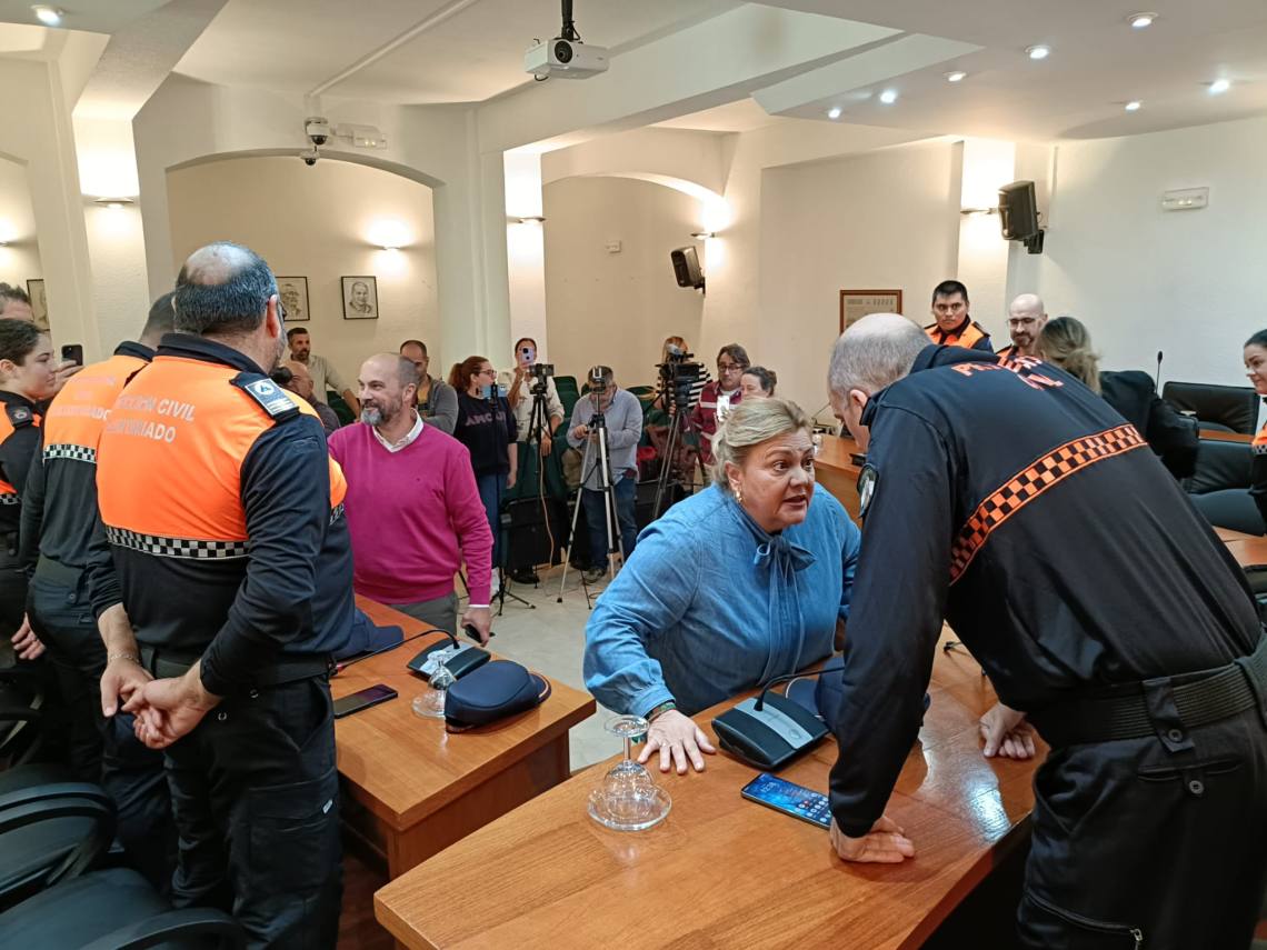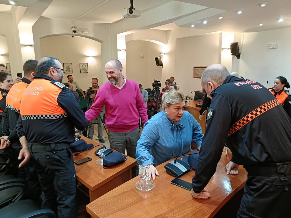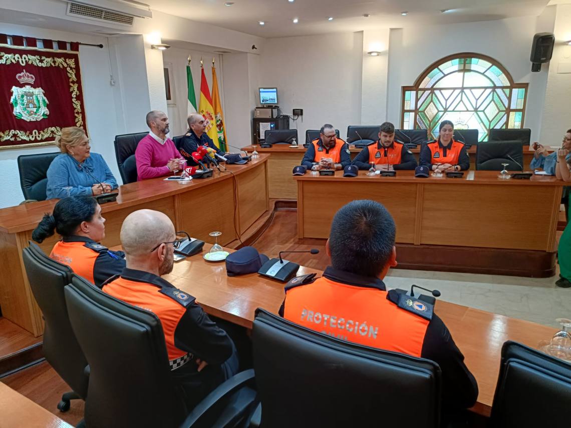 El alcalde de Los Barrio, Miguel Alconchel; y la delegada de Protección Civil, Geli Ferral, han recibido en el salón de plenos a los 7 voluntarios de Protección Civil de Los Barrios que han prestado su ayuda a los damnificados por los efectos de la DANA en Valencia.