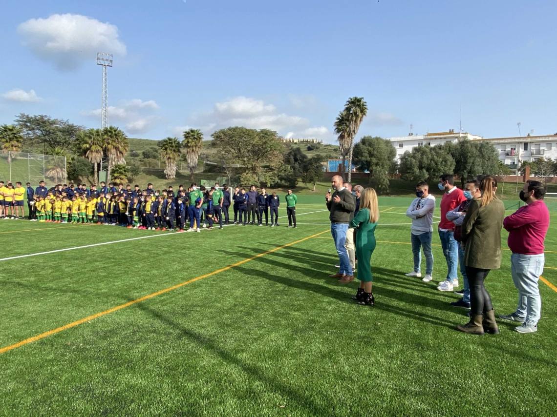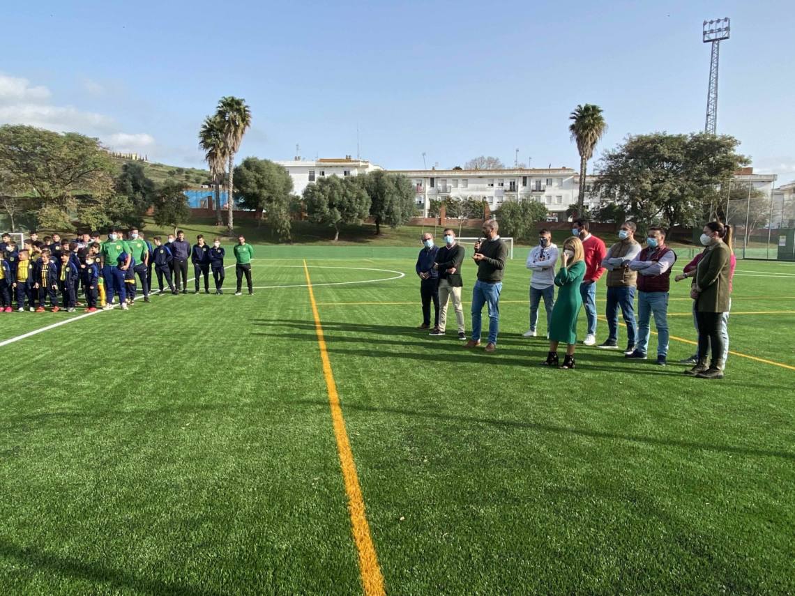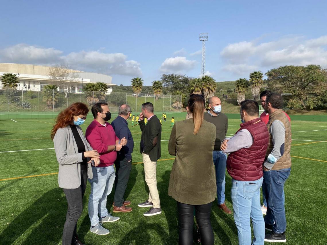 El alcalde de Los Barrios, Miguel Alconchel, la delegada de Deportes, May Gallego, y el delegado de Urbanismo, Pablo García, han acudido esta tarde al estreno del campo de fútbol 11 anexo al polideportivo San Rafael, una vez finalizadas las primeras obras de mejora que se han llevado a cabo en esta instalación y que han supuesto una inversión de 183.985 euros, más los costes de dirección de los trabajos, por parte del Ayuntamiento.
