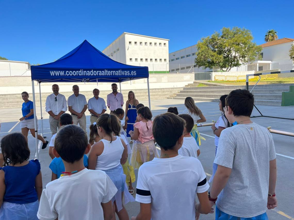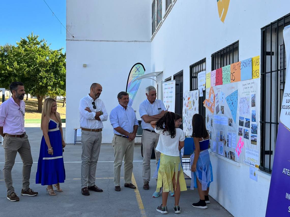 El alcalde, Miguel Alconchel, y el delegado territorial de Inclusión Social, Juventud, Familias e Igualdad del gobierno de la Junta de Andalucía en Cádiz, Alfonso Candón Adán, han asistido esta mañana a los actos de finalización del campamento infantil de verano que la Coordinadora ‘Alternativas’ ha estado ofreciendo desde el pasado mes de julio en las instalaciones del colegio público ‘Maestro Juan González’, en Los Barrios.