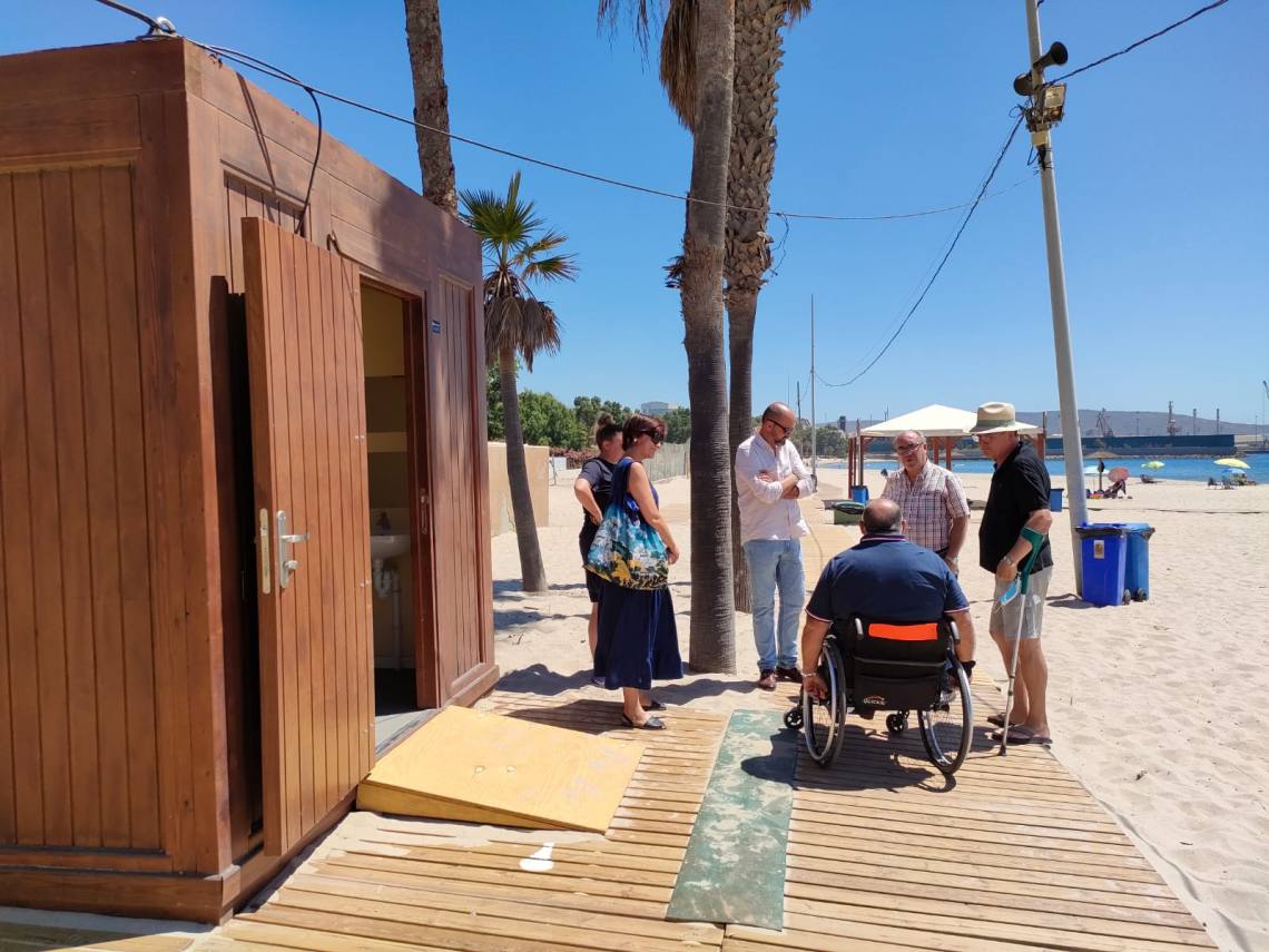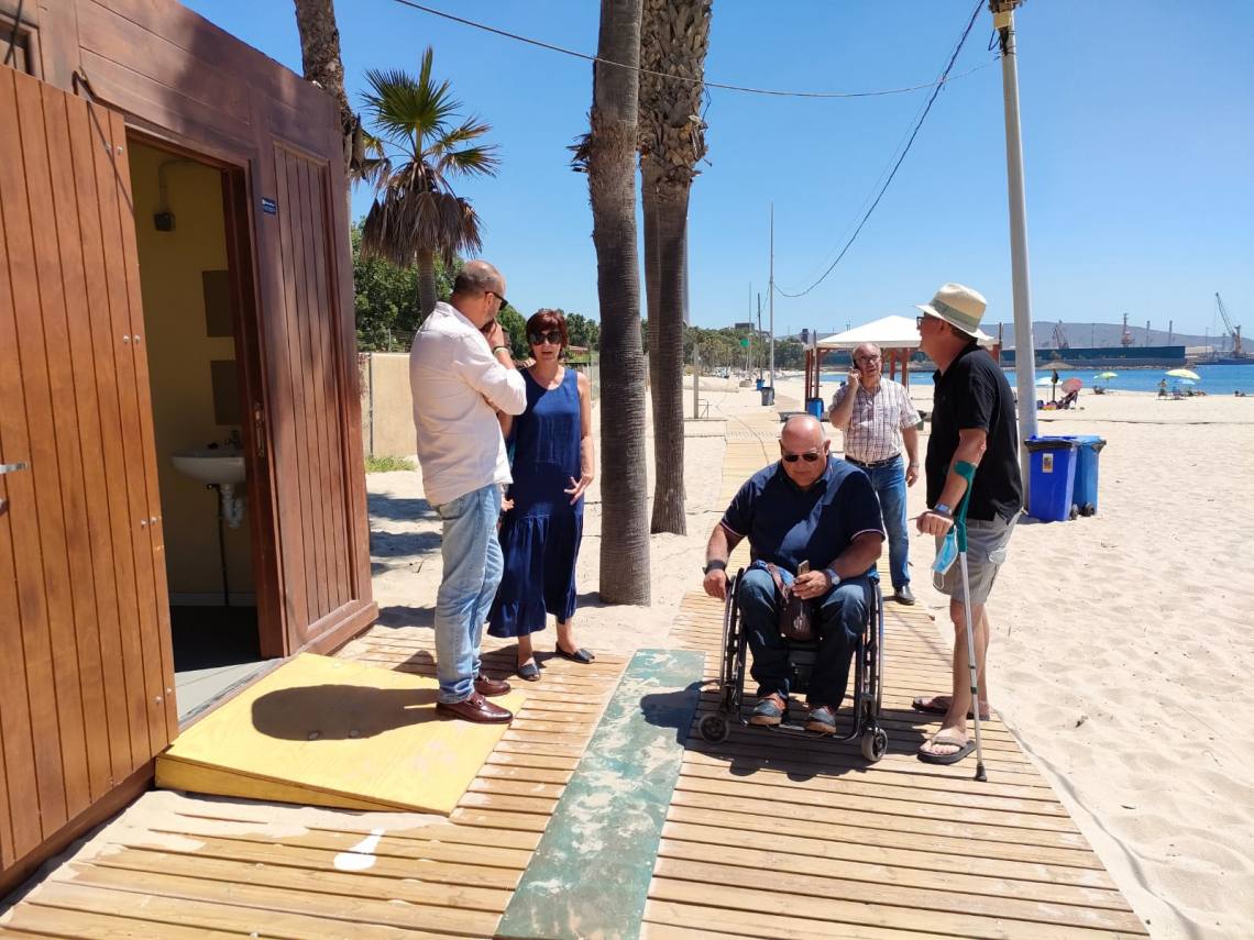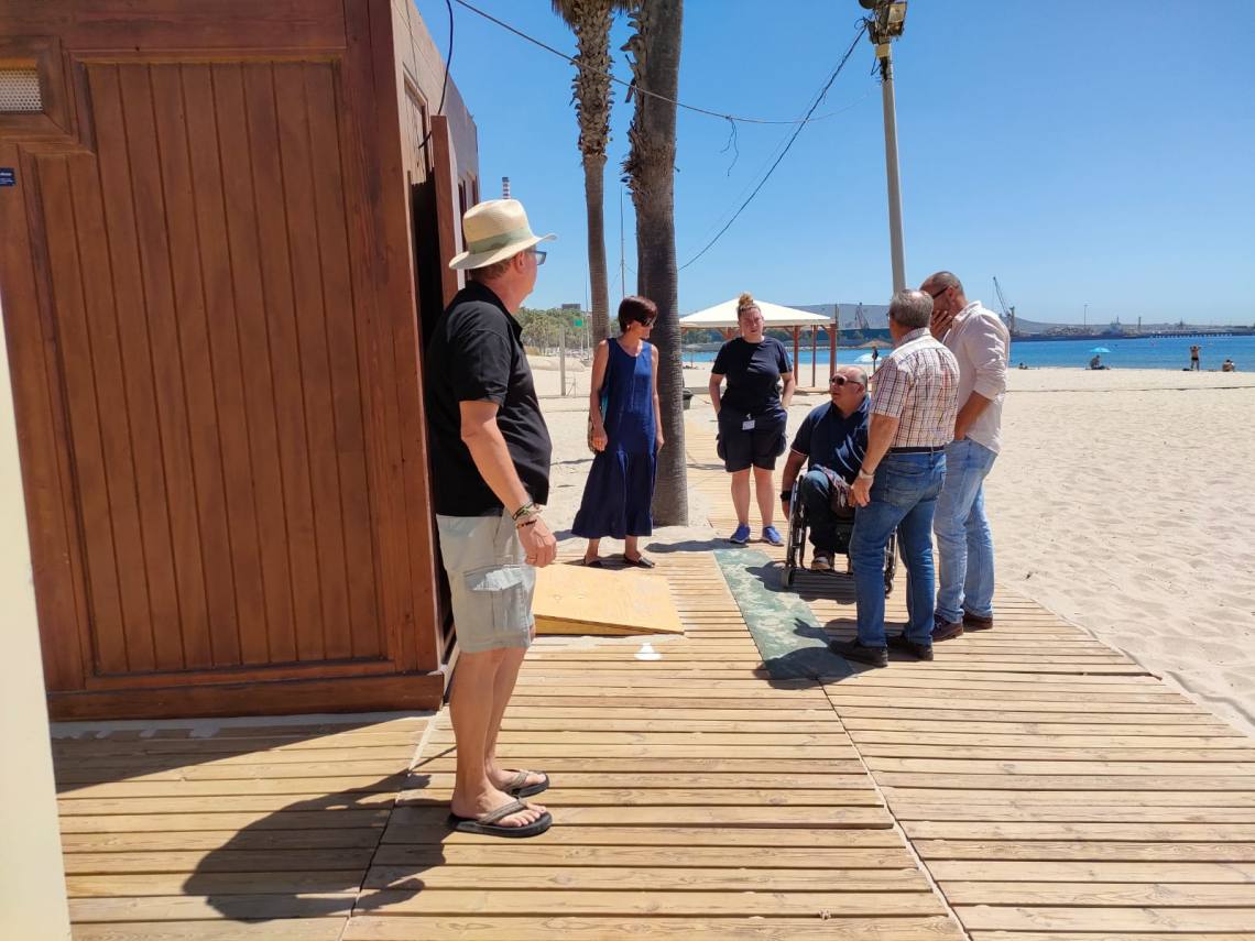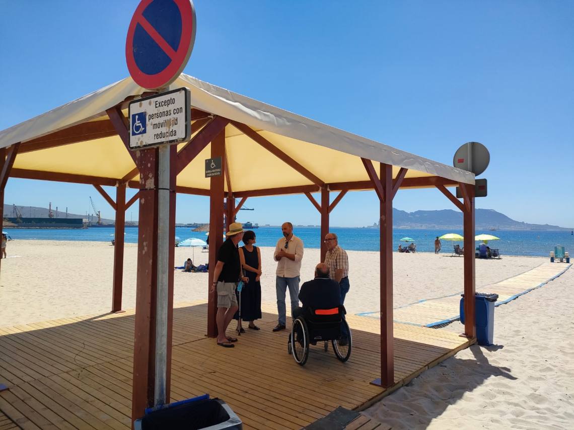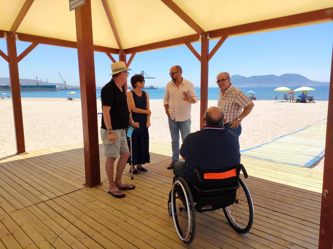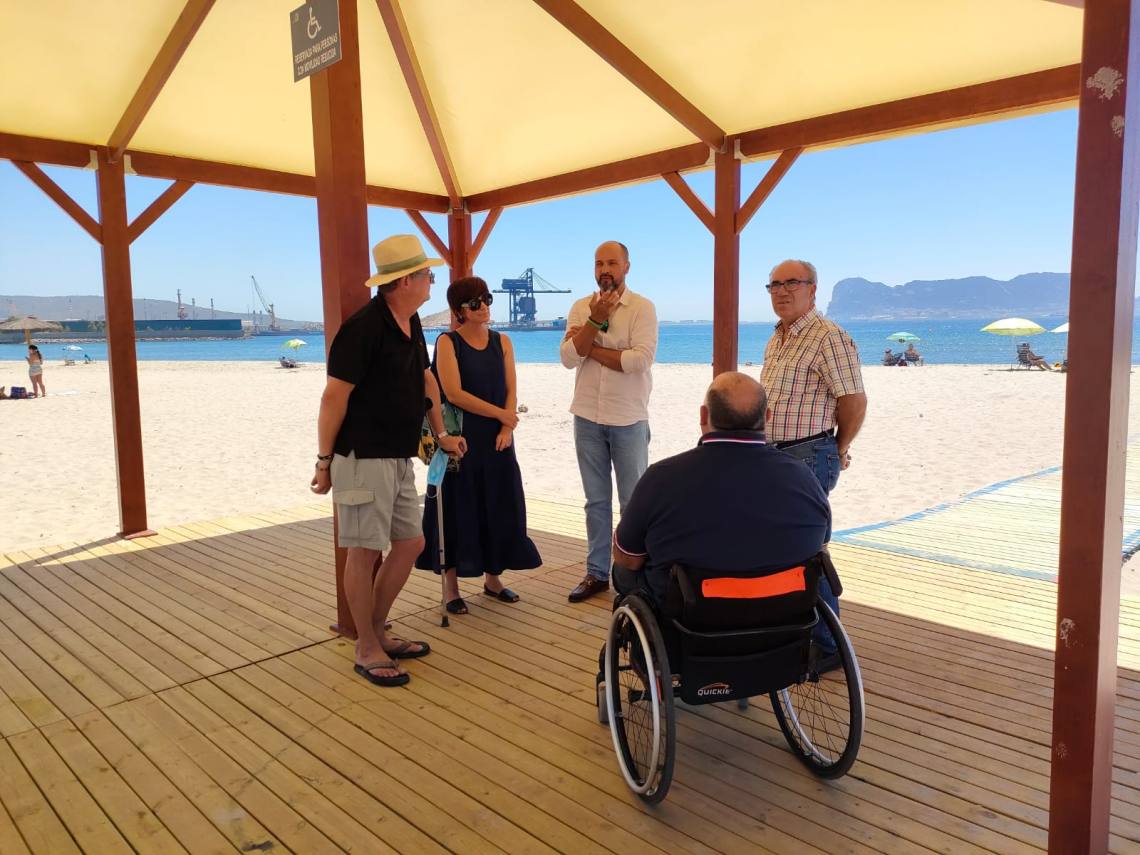 El alcalde de Los Barrios, Miguel Alconchel, y el concejal de Playas, José Antonio Gómez, han visitado este mediodía con miembros de la Asociación de Discapacitados La Montera, con su presidente, Juan Antonio Muñoz, y representantes de la APBA la zona que se ha adaptado un año más para personas con movilidad reducida en la playa de Palmones.