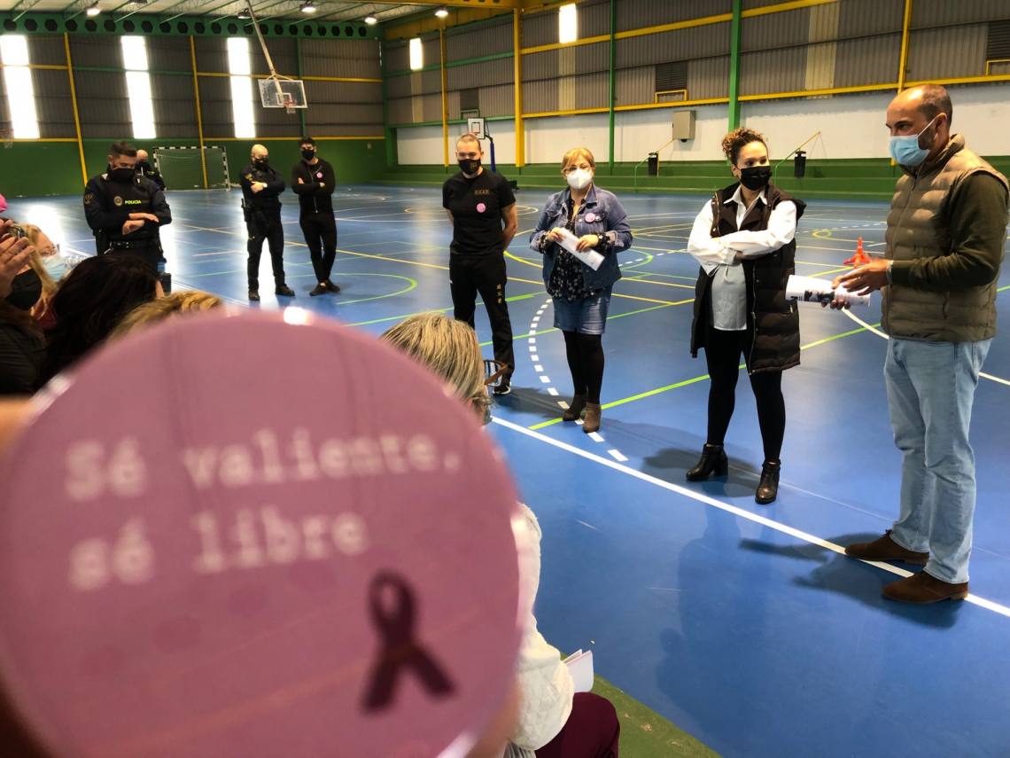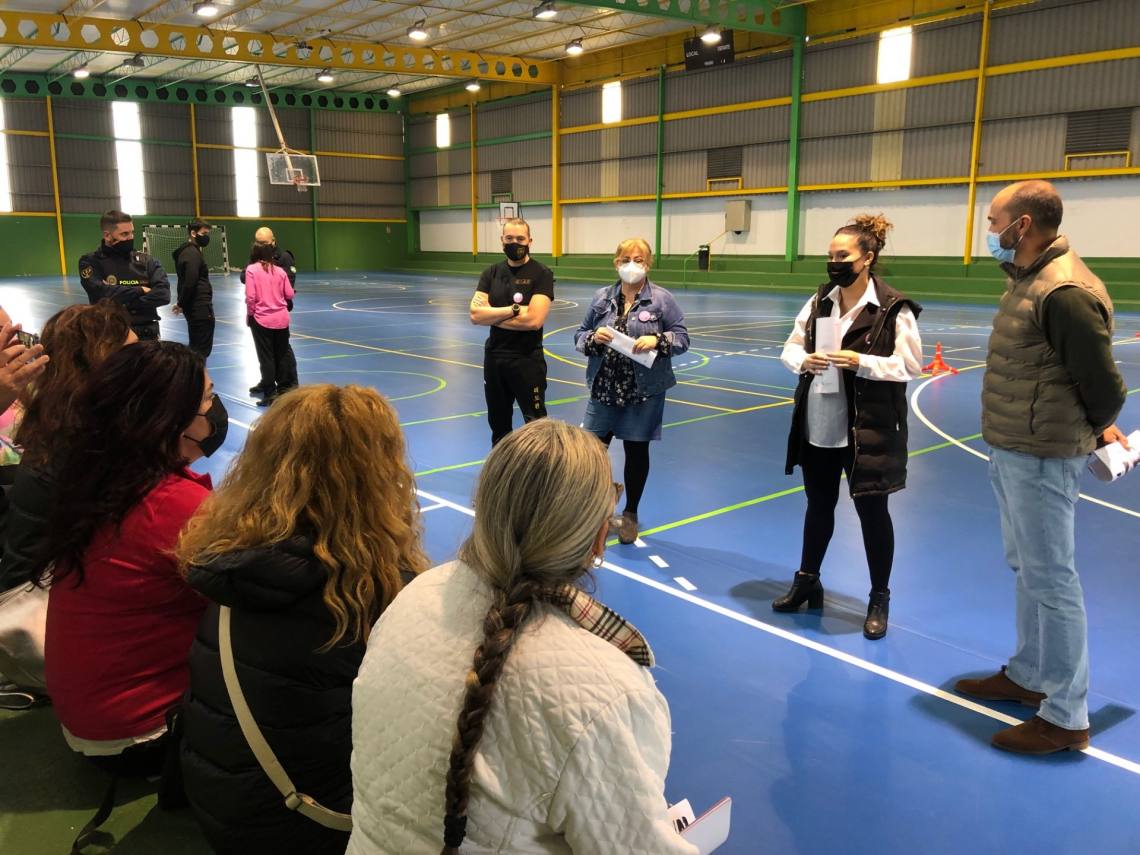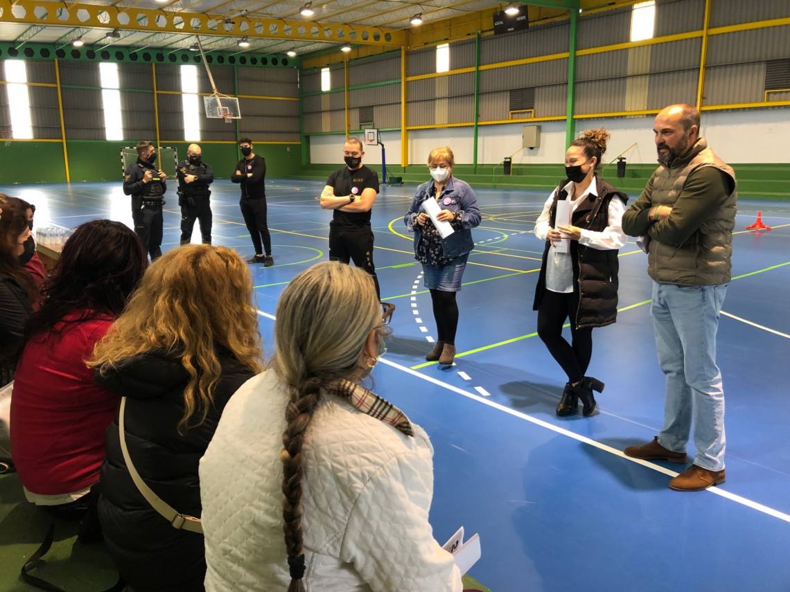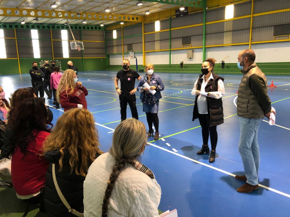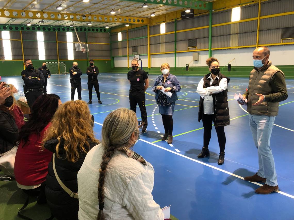 El alcalde de Los Barrios, Miguel Alconchel; junto a la delegada de Políticas de Igualdad, Sara Lobato; y la vicepresidenta del Consejo Local de la Mujer, María José Alconchel, han dado la bienvenida al grupo de mujeres que participan este jueves en una nueva sesión del taller de defensa personal para mujeres, impartido por agentes del Grupo Operativo de Apoyo y Prevención de la Policía Local.