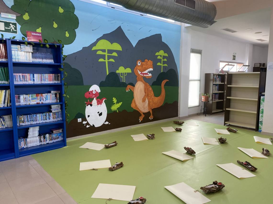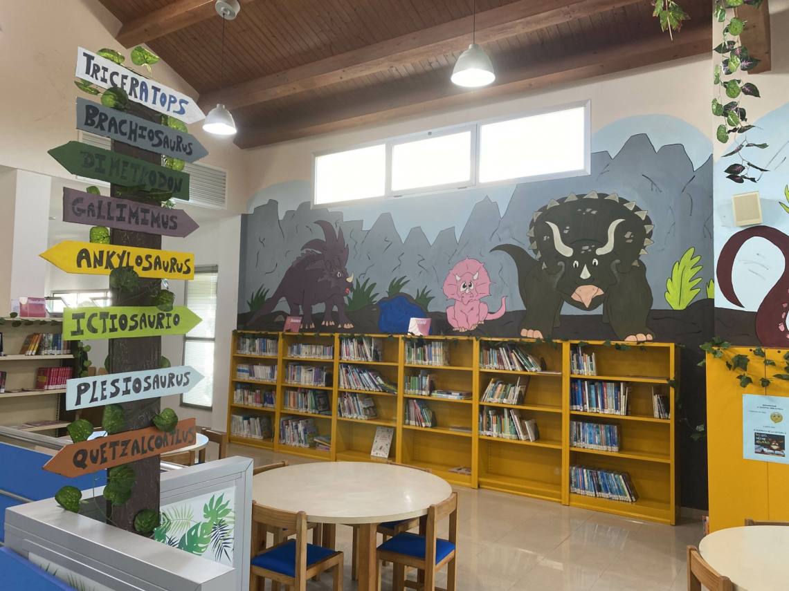 Esta nueva zona infantil recibirá a partir de ahora el nombre de “dinoteca”, por la llamativa ornamentación que adorna sus paredes, con motivos referidos al mundo de los dinosaurios, que, como es sabido, causa furor en la mayoría de niños y niñas. Dibujos de Diplodocus, tyrannosaurus rex, velociraptor, styracosaurus, stegosaurus, triceratops, ictiosaurios, etcétera, en clave de comic o tebeo, ilustran sus paredes. Una obra pictórica que ha sido llevada a cabo por el propio concejal de Bibliotecas, Educación y Cultura, Daniel Pérez Cumbre, personalmente, con la ayuda de los trabajadores municipales adscritos a estas delegaciones del Consistorio barreño y gracias al material donado para tal fin por la empresa de animación ‘Diviértete’.