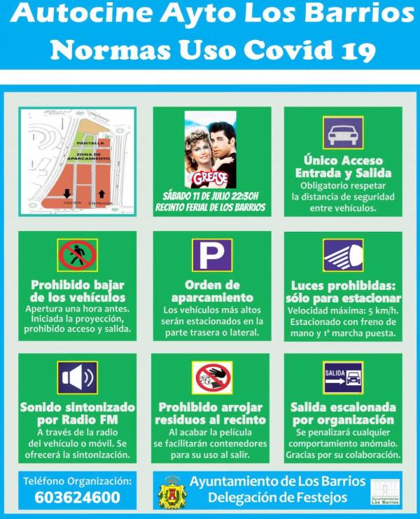 El concejal de Festejos, Daniel Pérez Cumbre, ha dado a conocer este mediodía las medidas y normas de uso para el autocine en el recinto ferial de Los Barrios. Hay que recordar que la mítica película 'Grease' será la que inaugure las proyecciones el próximo 11 de julio a las 22.30 horas. Pérez Cumbre ha señalado que “vamos a seguir [...]