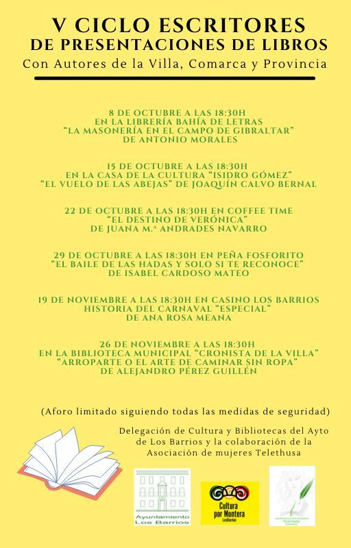 Con la presentación del libro “La Masonería en el Campo de Gibraltar (1902-1942)”, de Antonio Morales, se inaugura mañana el V Ciclo ‘Escritores’ organizado por las delegaciones de Cultura y Bibliotecas, que dirige Daniel Pérez Cumbre, y la Asociación de Mujeres 'Telethusa'. El acto tendrá lugar en la librería ‘Bahía de Letras’ del centro comercial ‘Bahía Plaza’ a las 18:30 [...]