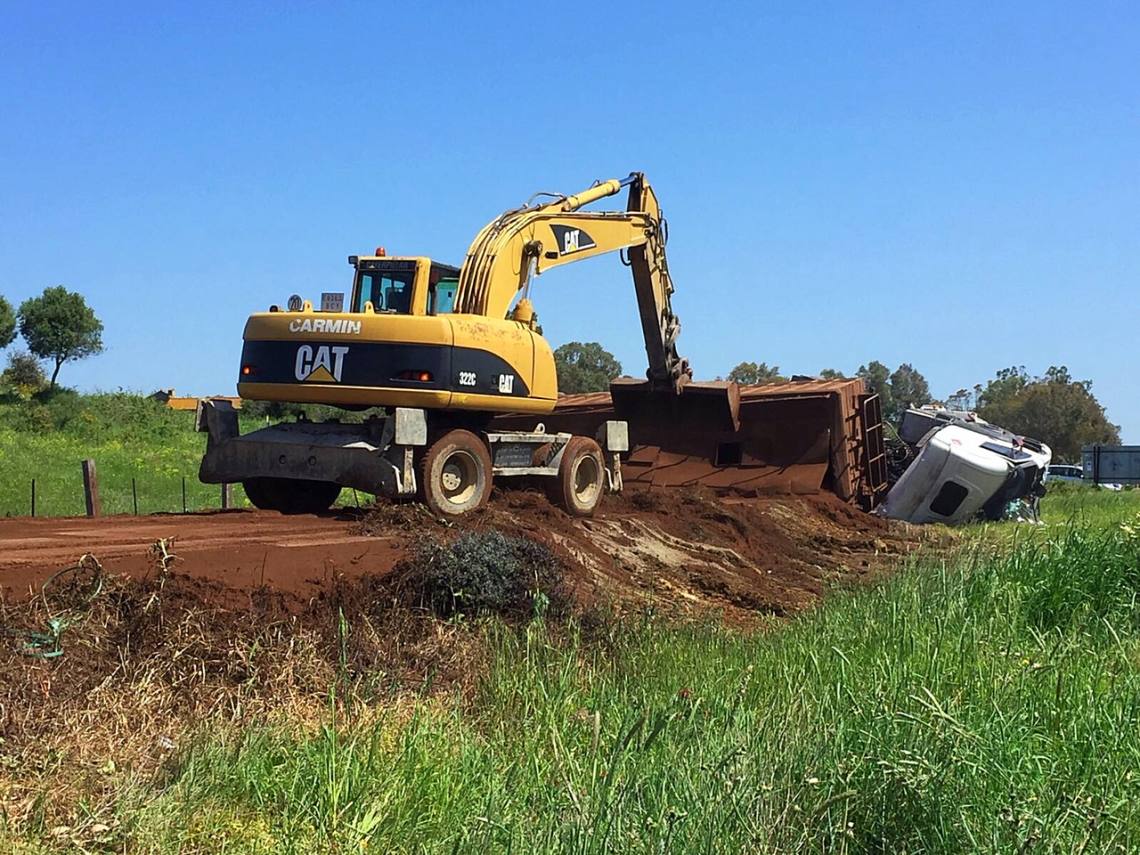 Vuelca un camión cargado de cenizas en la carretera que une Puente Romano y Los Cortijillos en el tramo de la Venta del Carmen