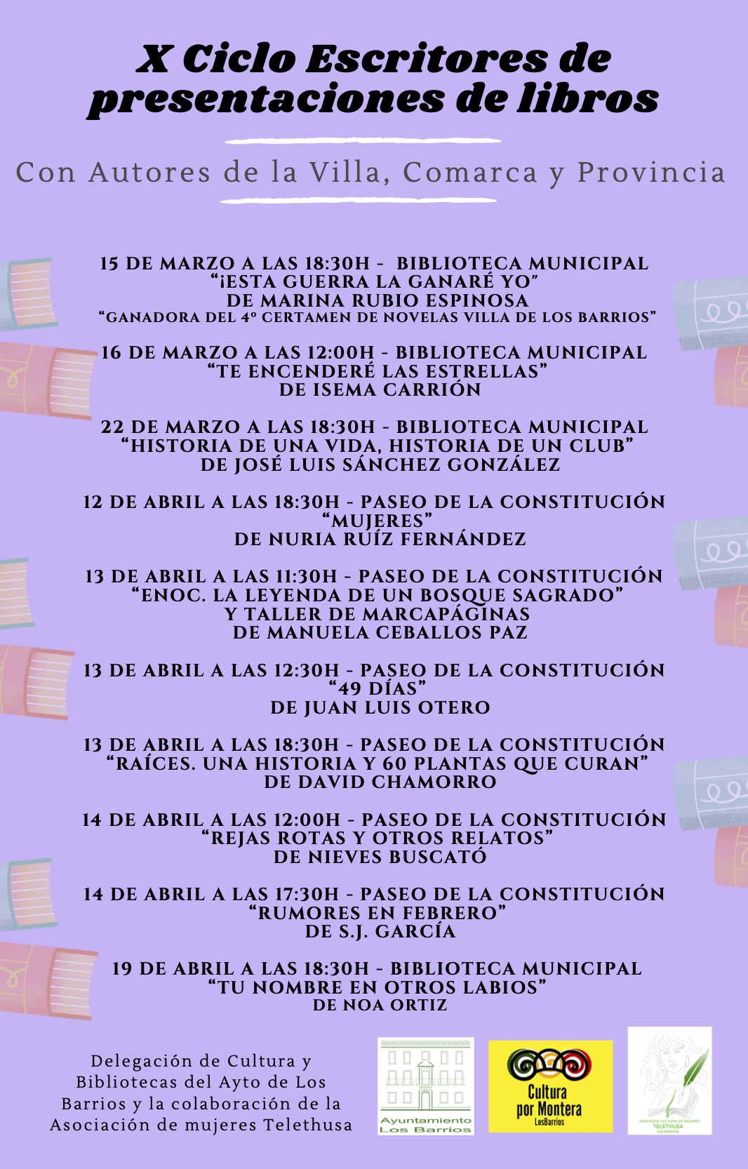 La programación se retomará ya después de la Semana Santa el viernes 12 de abril con la presentación de la obra “Mujeres”, de Nuria Ruiz Fernández, a la misma hora, las 18:30, pero en el Paseo de la Constitución, coincidiendo con la celebración de la IV Feria del Libro.