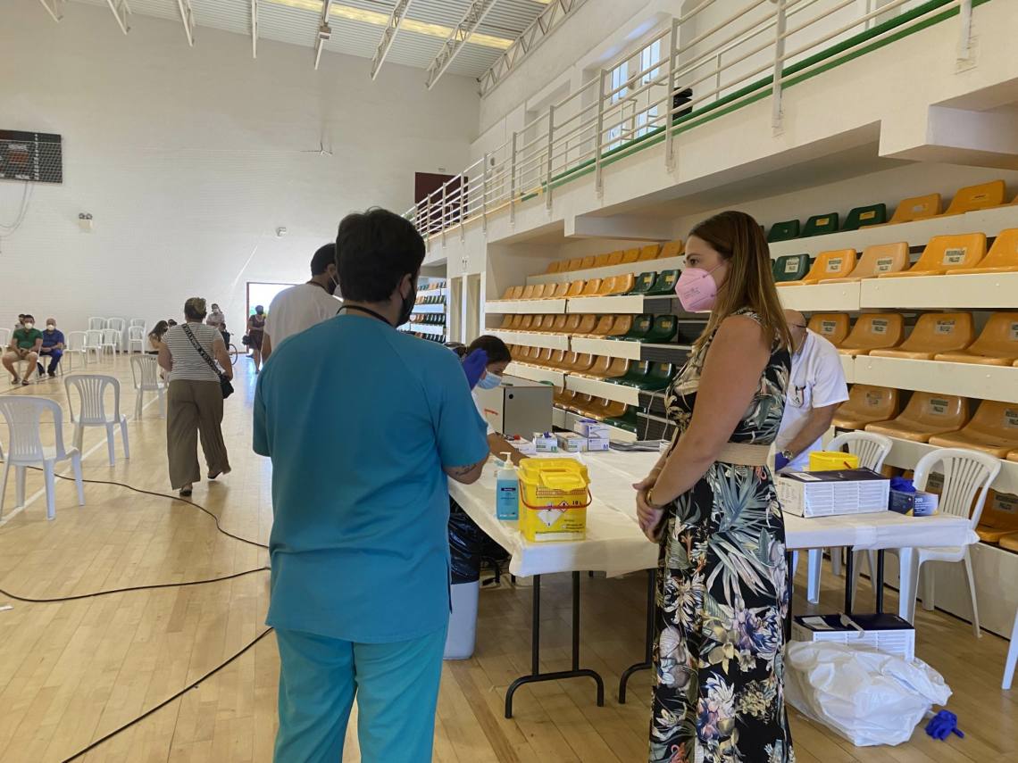 La concejala delegada de Sanidad, Inmaculada Domínguez, ha visitado esta mañana el dispositivo de vacunación masiva contra la covid-19 que ha desplegado, una vez más, la Consejería de Salud y Familias de la Junta de Andalucía en la localidad. Este dispositivo se ha desplegado en las instalaciones del pabellón cubierto ‘Soldado Samuel Aguilar’ y se mantendrá activo hasta las 20:00h.