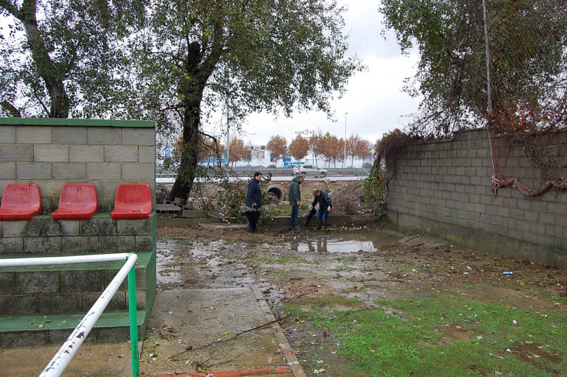 El campo de Los Cortijillos está destrozado completamente tras la tromba de agua de ayer y la caída del muro perimetral. El edil de Urbanismo, Miguel Alconchel, ha visitado el campo de fútbol junto al delegado de Los Cortijillos, José Gómez; y la delegada de Asuntos Sociales, Sara Lobato, además del portavoz del PSOE, Salvador Puerto.