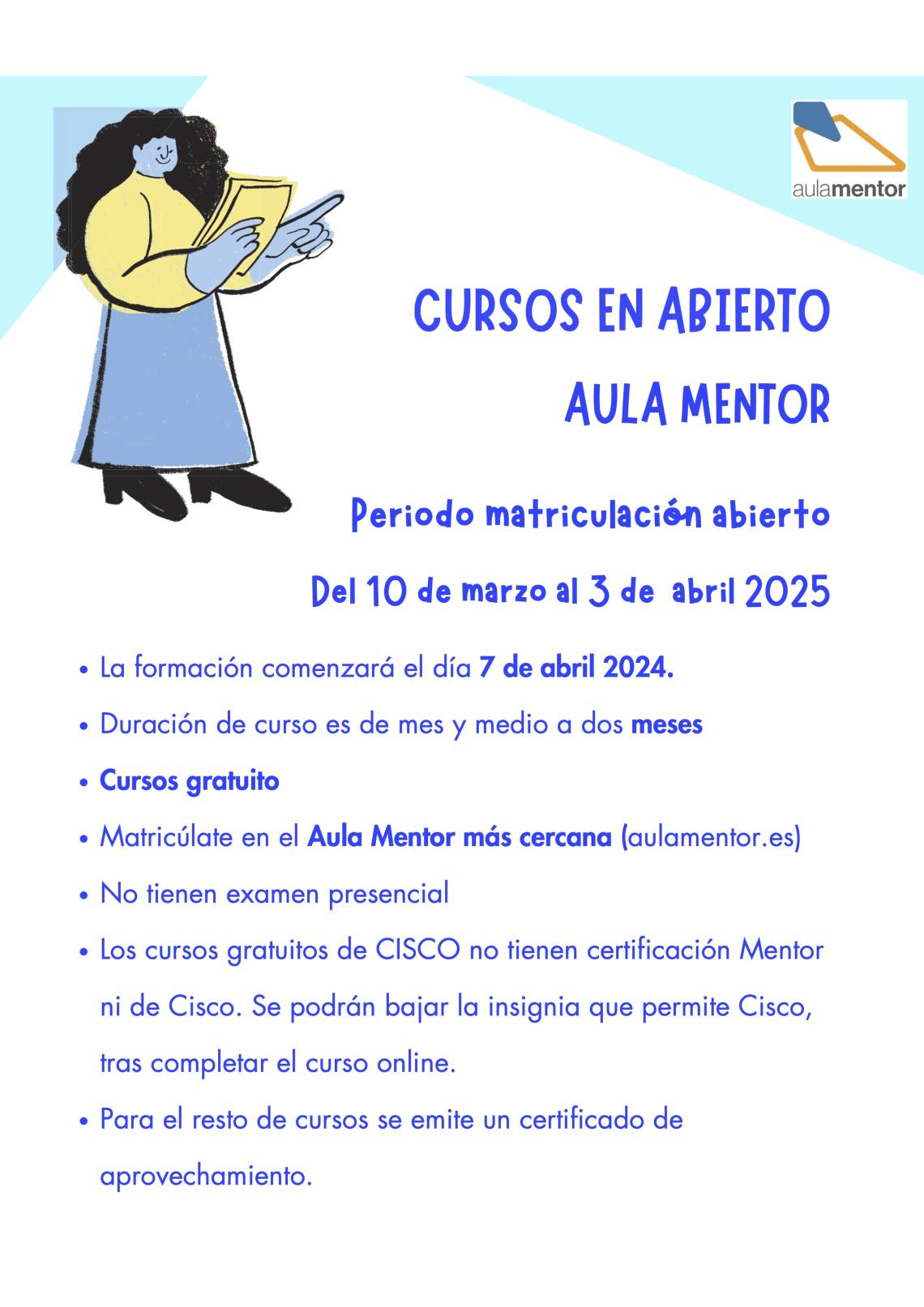 ‘Aula Mentor’ es un sistema de formación online no reglada, flexible y con tutorización personalizada, para adultos mayores de 18 años, que cuenta con un extenso catálogo de talleres para ampliar competencias personales y profesionales. Este sistema está promovido por el Ministerio de Educación y Formación Profesional en colaboración con otras instituciones públicas y privadas tanto nacionales como internacionales.
