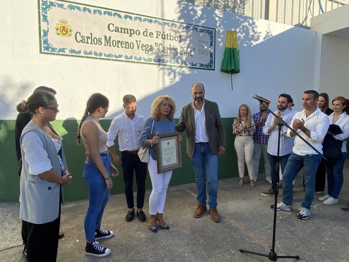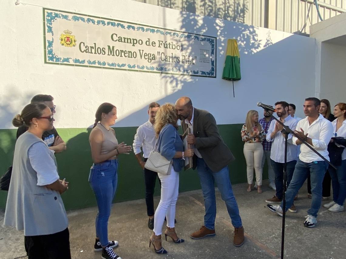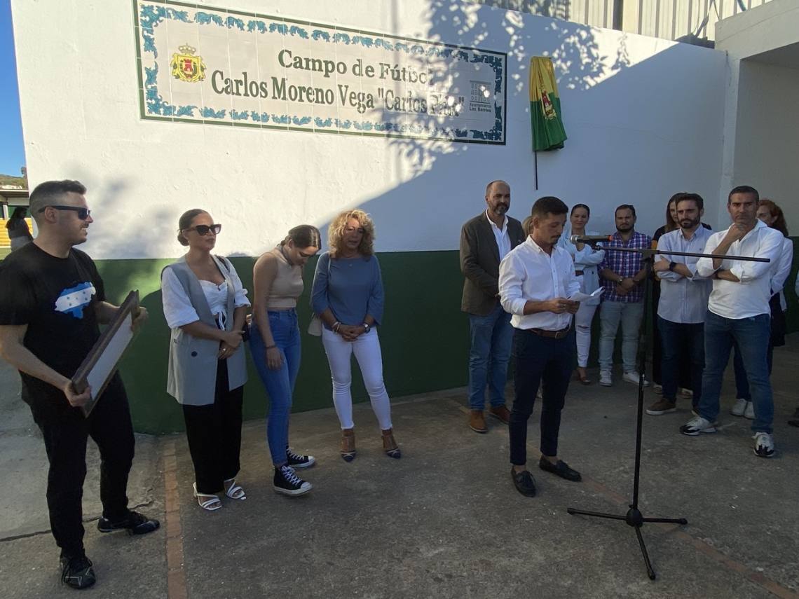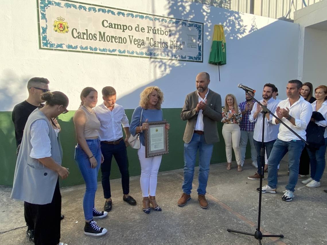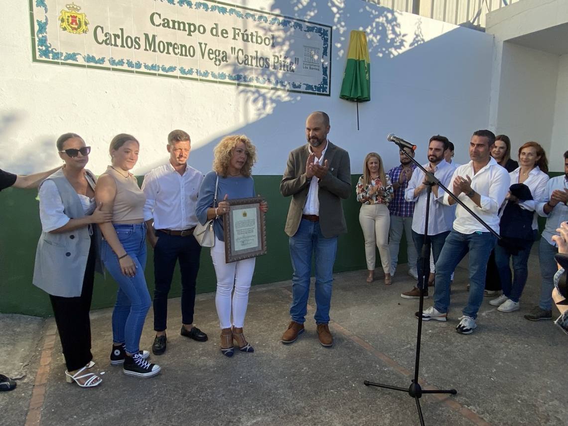 Esta tarde ha tenido lugar el acto de descubrimiento de la placa con la que el actual campo de fútbol del polideportivo San Rafael lleva a partir de ahora, con orgullo, el nombre de Carlos Moreno Vega, más conocido como Carlos Piña.