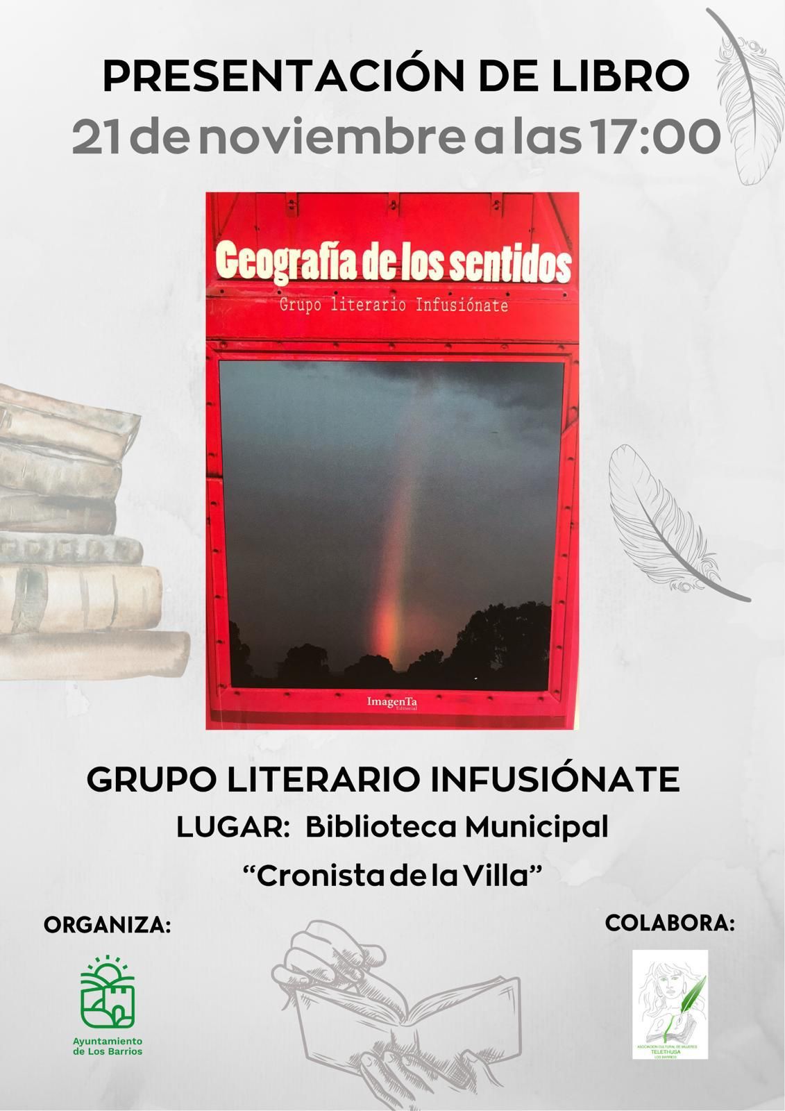 La biblioteca pública municipal ‘Cronista de la Villa’ acogerá el próximo viernes, 21 de noviembre, a partir de las 17:00 horas, la presentación del libro «Geografía de los Sentidos», del Grupo Literario ‘Infusiónate’, dentro del XIII Ciclo ‘Escritores’, organizado por la delegación de Cultura del Ayuntamiento de Los Barrios, que dirige Cristina Marchante, con la colaboración de la Asociación de Mujeres ‘Telethusa’.
