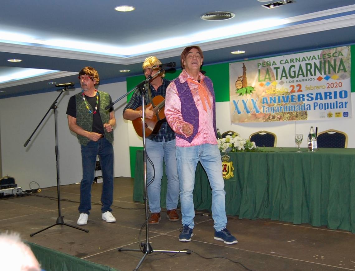 La Peña Cultural Carnavalesca La Tagarnina comenzó anoche a celebrar su XXX aniversario con una genial actuación de los chirigoteros gaditanos ‘El Love’ y ‘El Cabra’, acompañados a la guitarra por el ‘El Lali’, en el hotel Montera Plaza. En un salón abarrotado de público, los artistas gaditanos hicieron reír y recordar coplas de sus históricas chirigotas dando un prólogo de lujo a la celebración mañana sábado 22 de la XXX Tagarninada Popular.