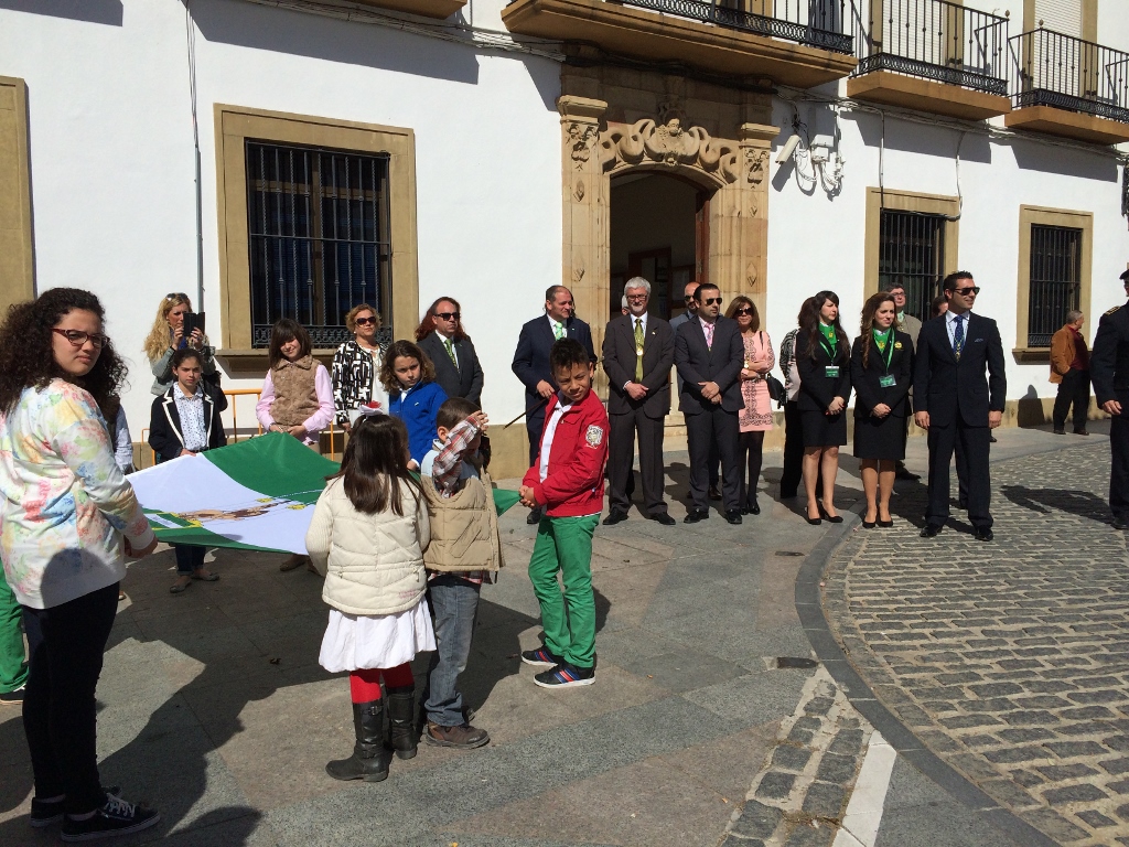 En la Plaza de Blas Infante los niños han izado la bandera bajo el himno de Andalucía y los portavoces municipales han depositado un ramo de flores en la base de la bandera.