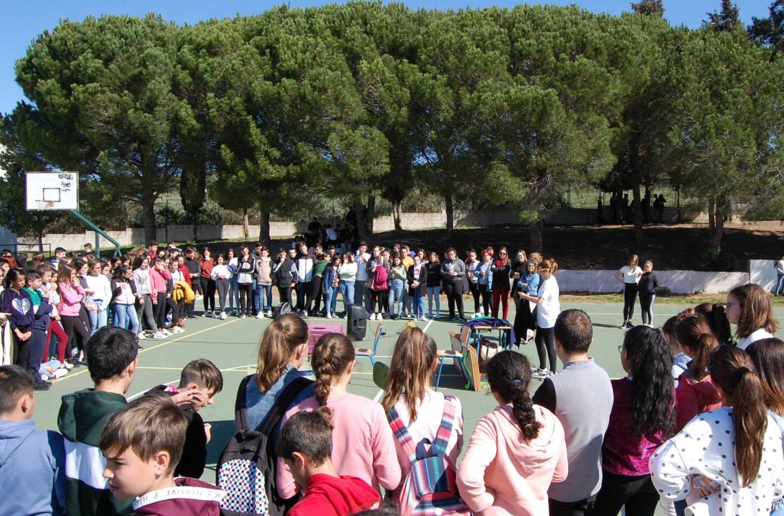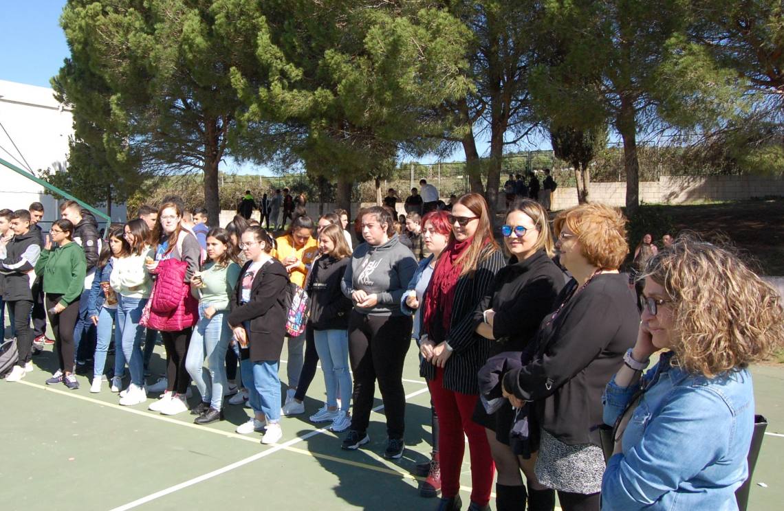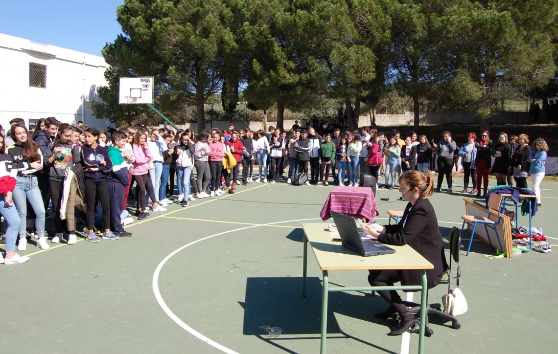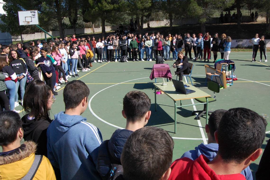 El centro del patio del instituto Sierra Luna acogió durante el horario de recreo la nueva representación de la actriz Carmen Díaz, ante un buen número de alumnos.