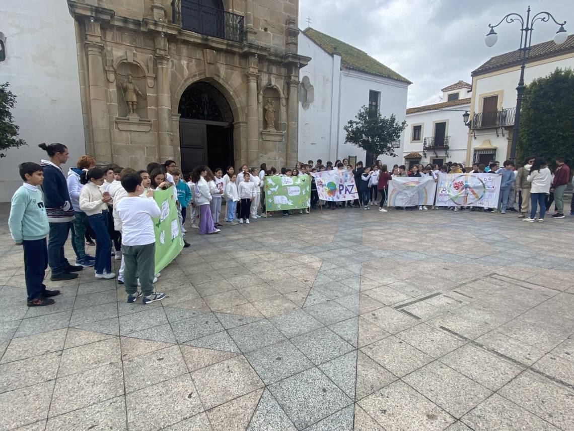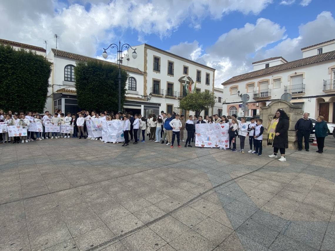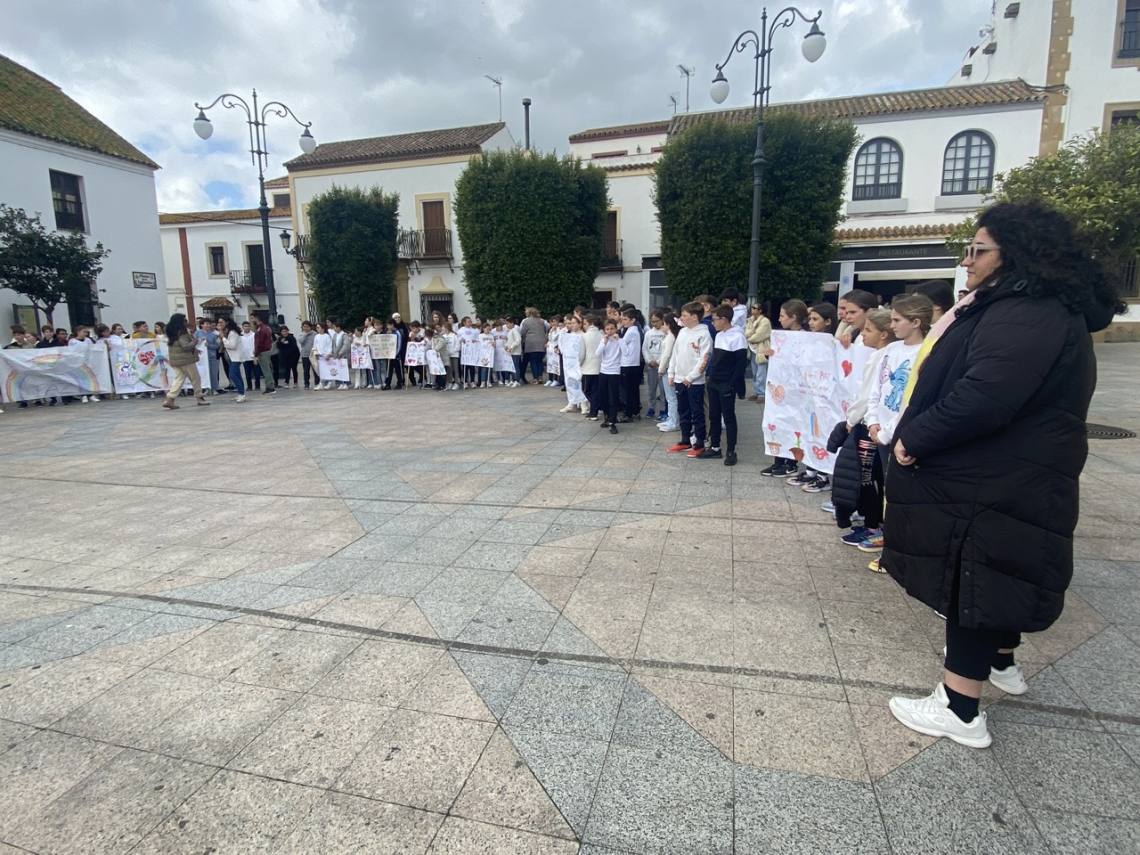 En Los Barrios escolares de los cuatro centros de Primaria se han congregado esta mañana en la Plaza de la Iglesia con proclamas fraternalistas y pacifistas, así como pancartas de elaboración propia, los escolares de la villa han mostrado, una vez más, su rechazo a la guerra y a la violencia.