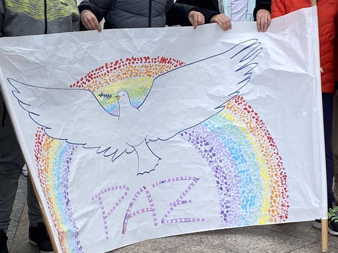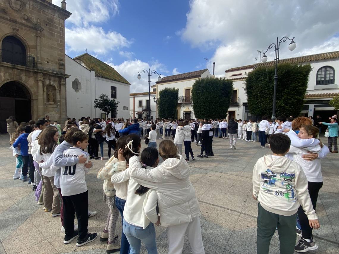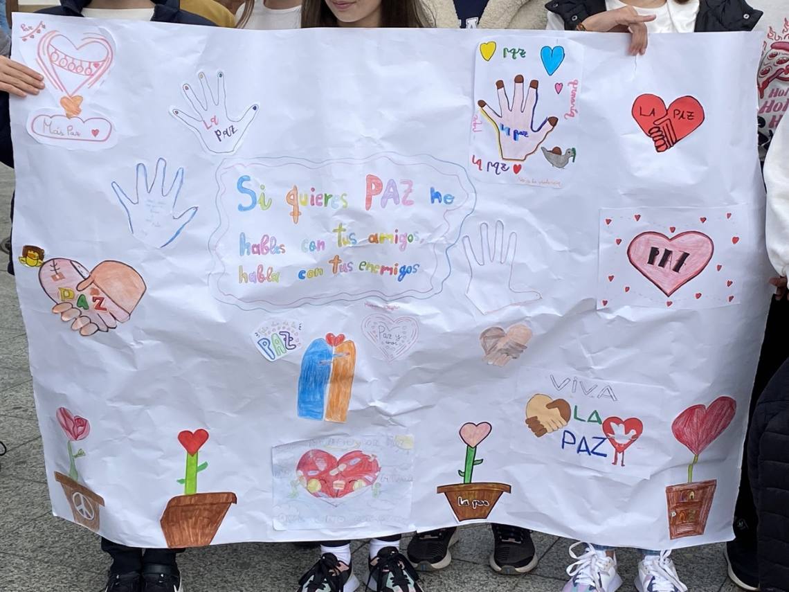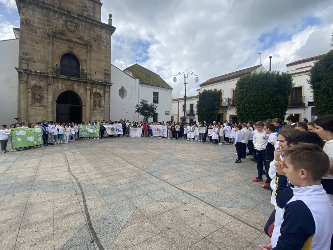 En Los Barrios escolares de los cuatro centros de Primaria se han congregado esta mañana en la Plaza de la Iglesia con proclamas fraternalistas y pacifistas, así como pancartas de elaboración propia, los escolares de la villa han mostrado, una vez más, su rechazo a la guerra y a la violencia.