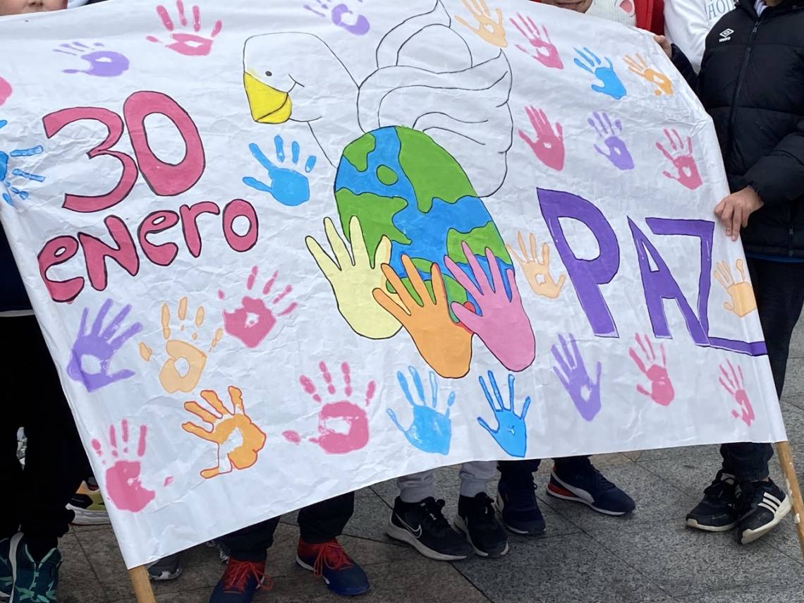 Este año han elegido como lema ‘La Paz está en nuestras Manos’, y donde una representación de alumnos de cada clase ha lanzado su mensaje en favor de la paz. También padres de alumnos de 6º de Primaria y en representación del AMPA han leído un pequeño manifiesto.