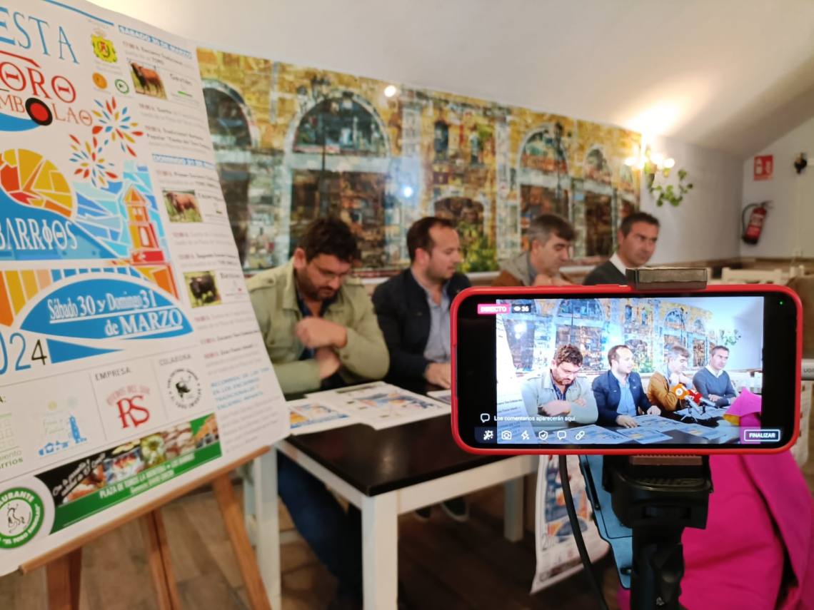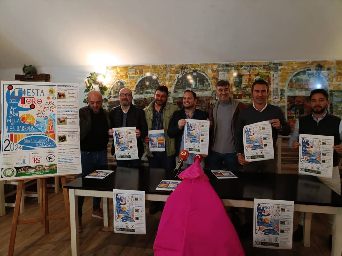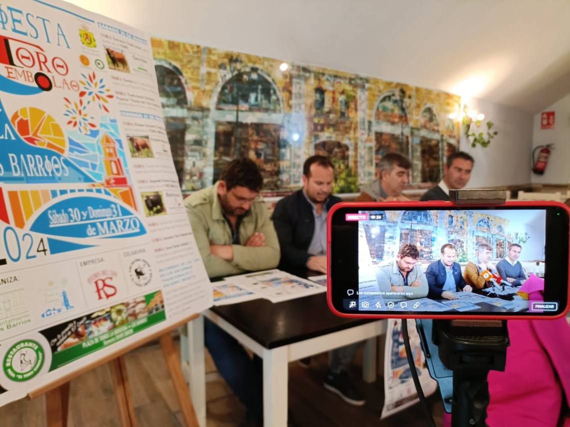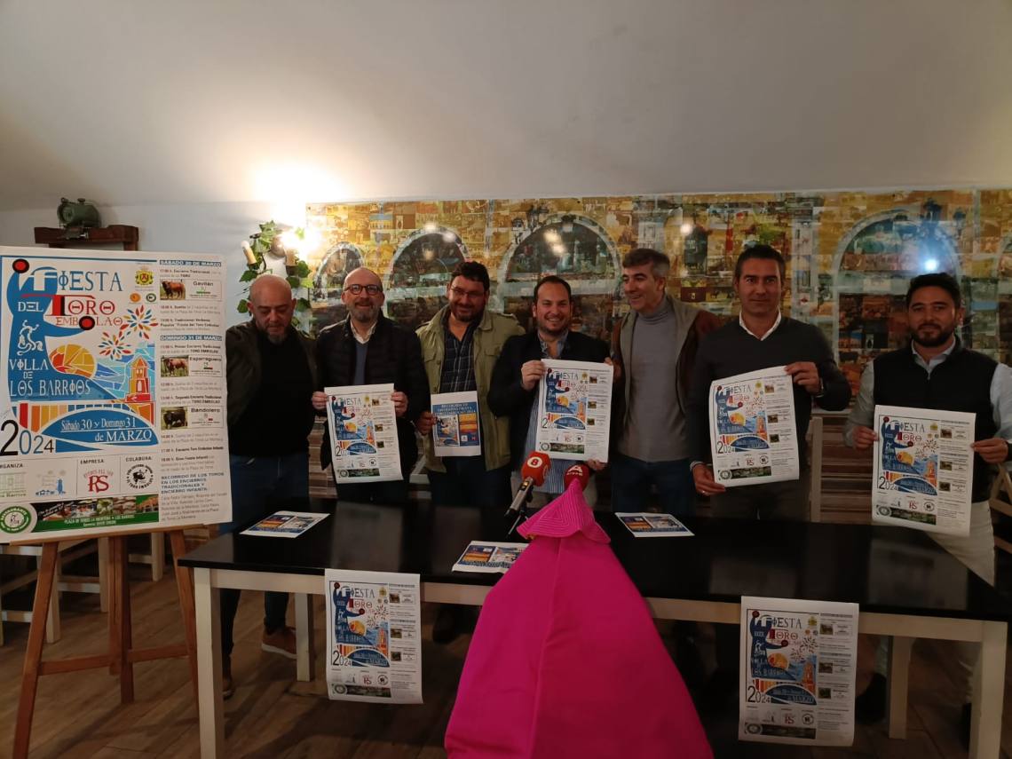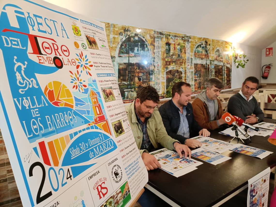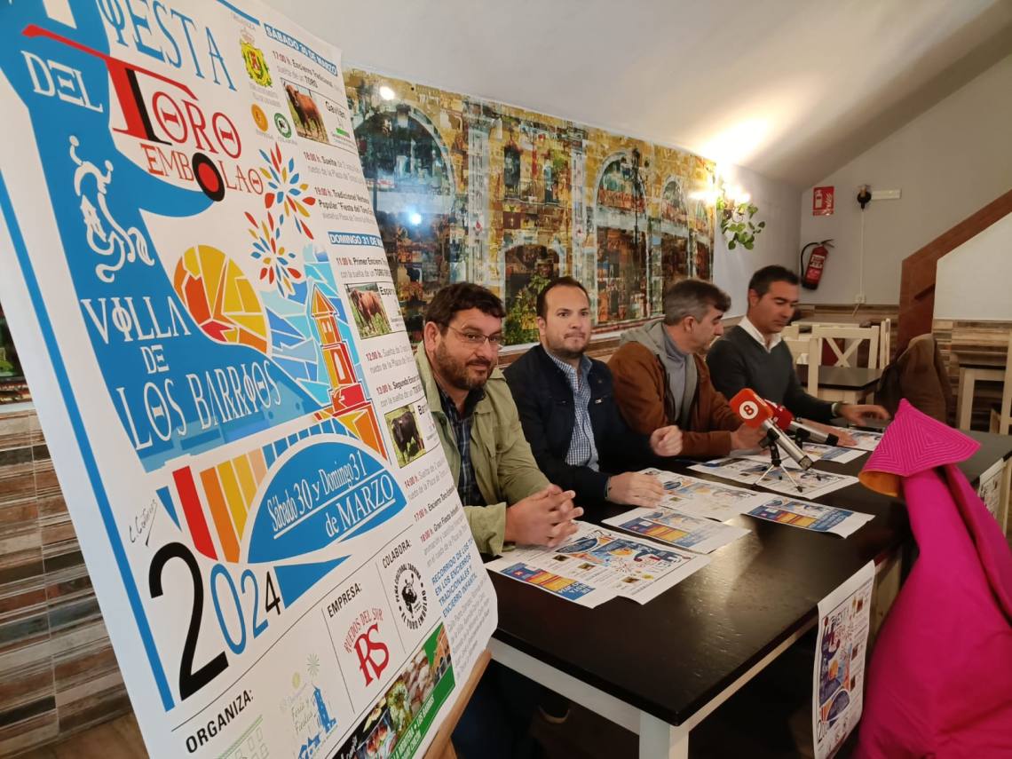 El concejal de Festejos, Daniel Pérez Cumbre; el concejal de Turismo, Pablo García; el presidente de la Peña Toro Embolao, Joaquín Gil; el empresario de Ruedos del Sur, Jesús Santana; han presentado esta tarde en la sede de la entidad, situada en la plaza de toros, el cartel y toda la programación de la Fiesta del Toro Embolao 2024, que se celebrará el sábado 30 y domingo 31 de marzo.