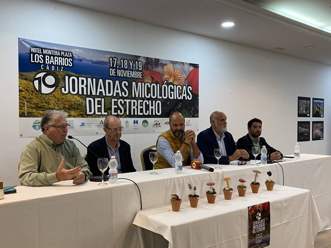 El alcalde de Los Barrios, Miguel Alconchel, junto al delegado de Medio Ambiente, Antonio Dávila; el vicepresidente de la Diputación Provincial, Javier Vidal Pérez, el vicerrector en funciones del Campus Bahía de Algeciras de la Universidad de Cádiz, D. Jesús Verdú Baeza, y el presidente de la Asociación Micológica del Estrecho ‘Mairei’, José Antonio Valle Viana, han abierto esta tarde en el hotel ‘Montera Plaza’ de la localidad las X Jornadas Micológicas del Estrecho.