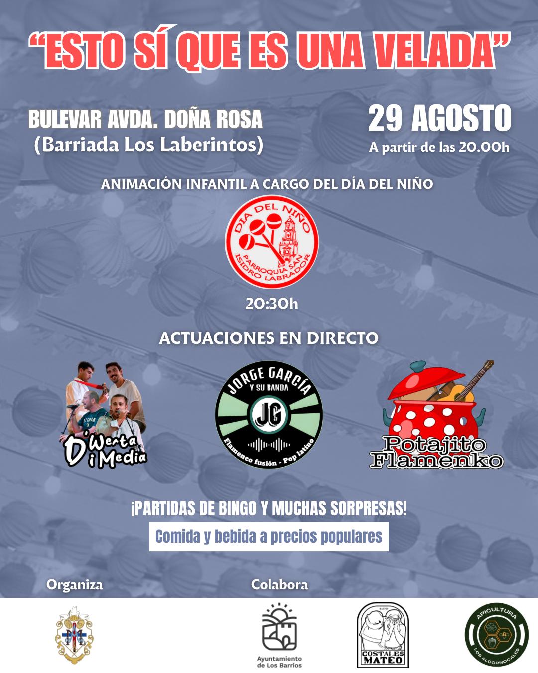 El próximo 29 de agosto, el bulevar de la barriada ‘Los Laberintos’ de Los Barrios se vestirá de fiesta para una celebración muy especial bajo el lema “Esto sí que es una velada”. Un evento que comenzará a partir de las 20:00 horas y que promete ser una jornada llena de diversión para toda la familia con música en vivo, actividades para los más pequeños y sorpresas.