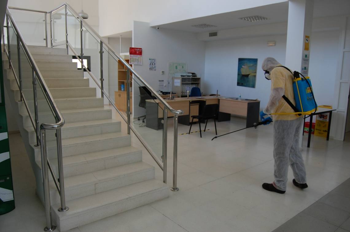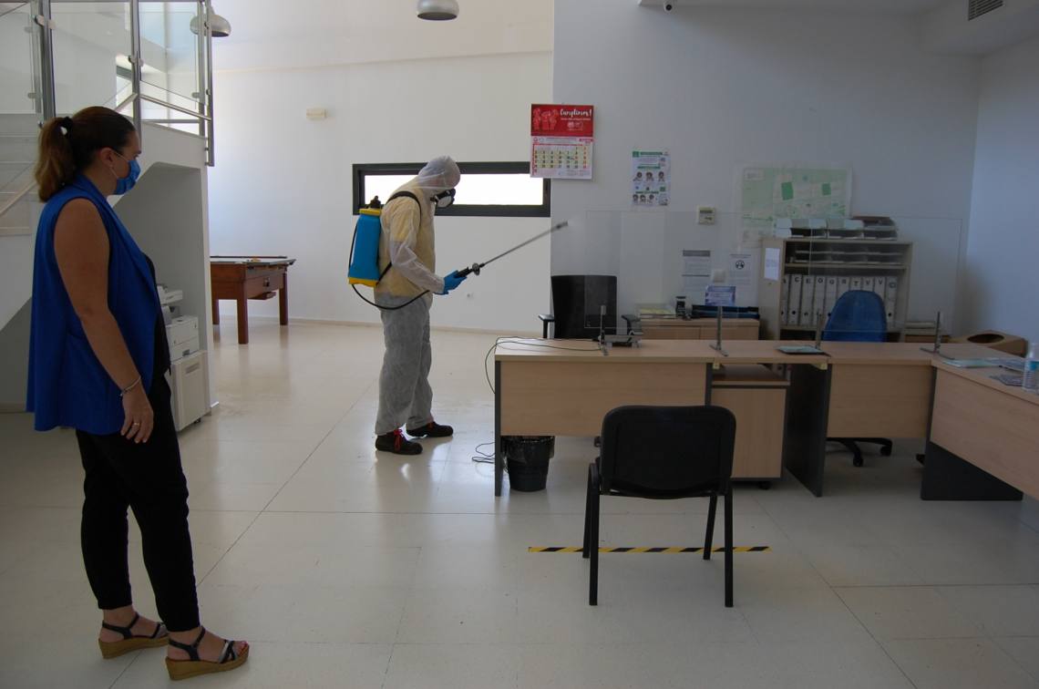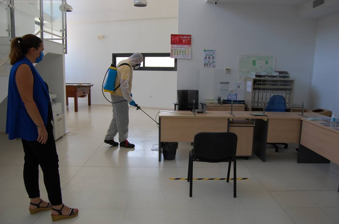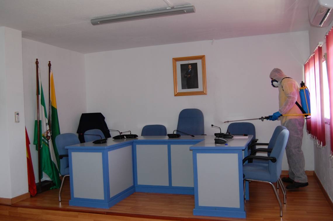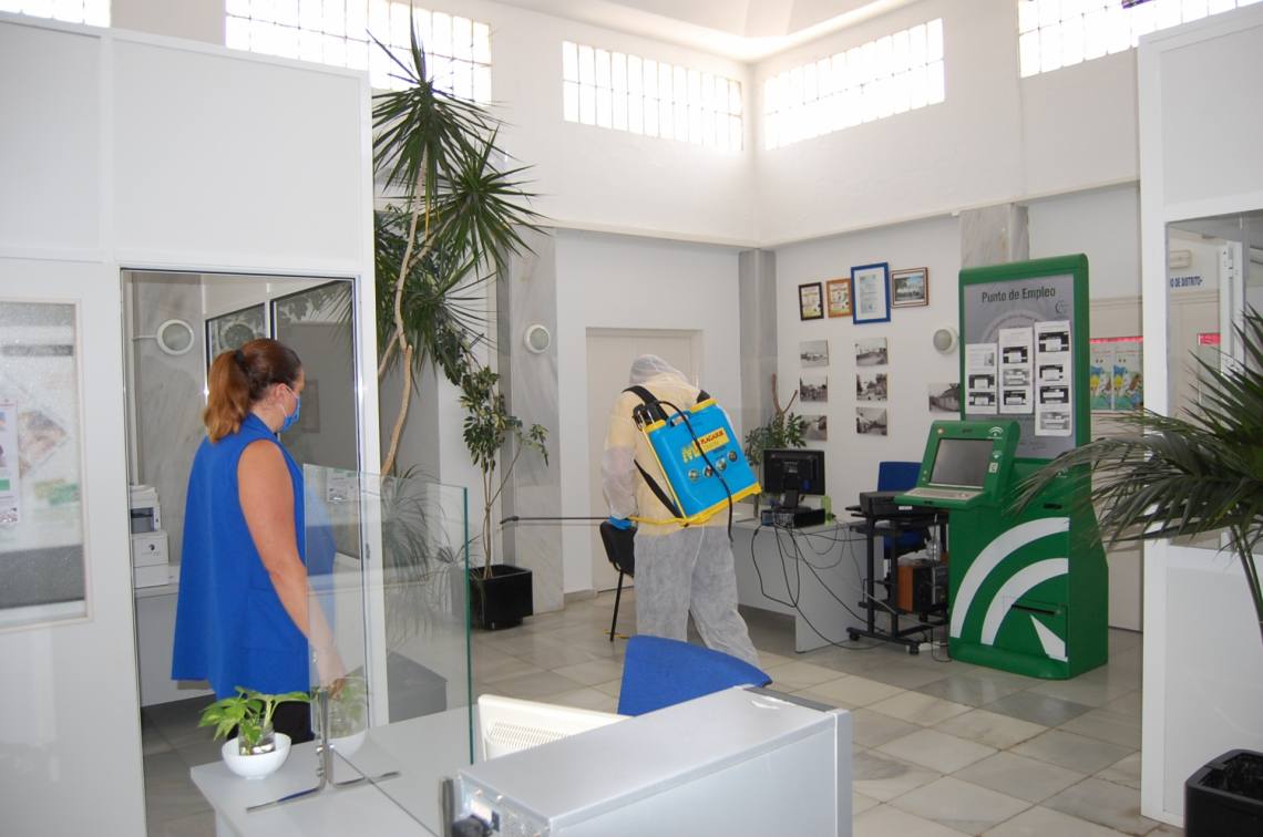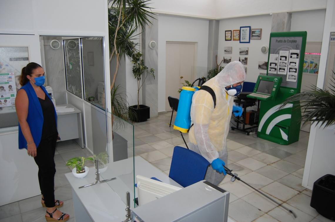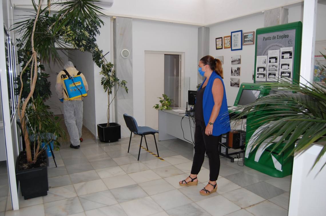 Inmaculada Domínguez señala “tras varios días esta semana de labores de desinfección en calles y plazas del casco urbano y en edificios municipales, el miércoles una empresa especializada contratada por el consistorio se ha desplazado a los núcleos de Los Cortijillos y Palmones para continuar los trabajos de desinfección con un producto especializado desinfectante en las dependencias interiores del Edificio Municipal de Los Cortijillos y en la Junta de Distrito de Palmones”.