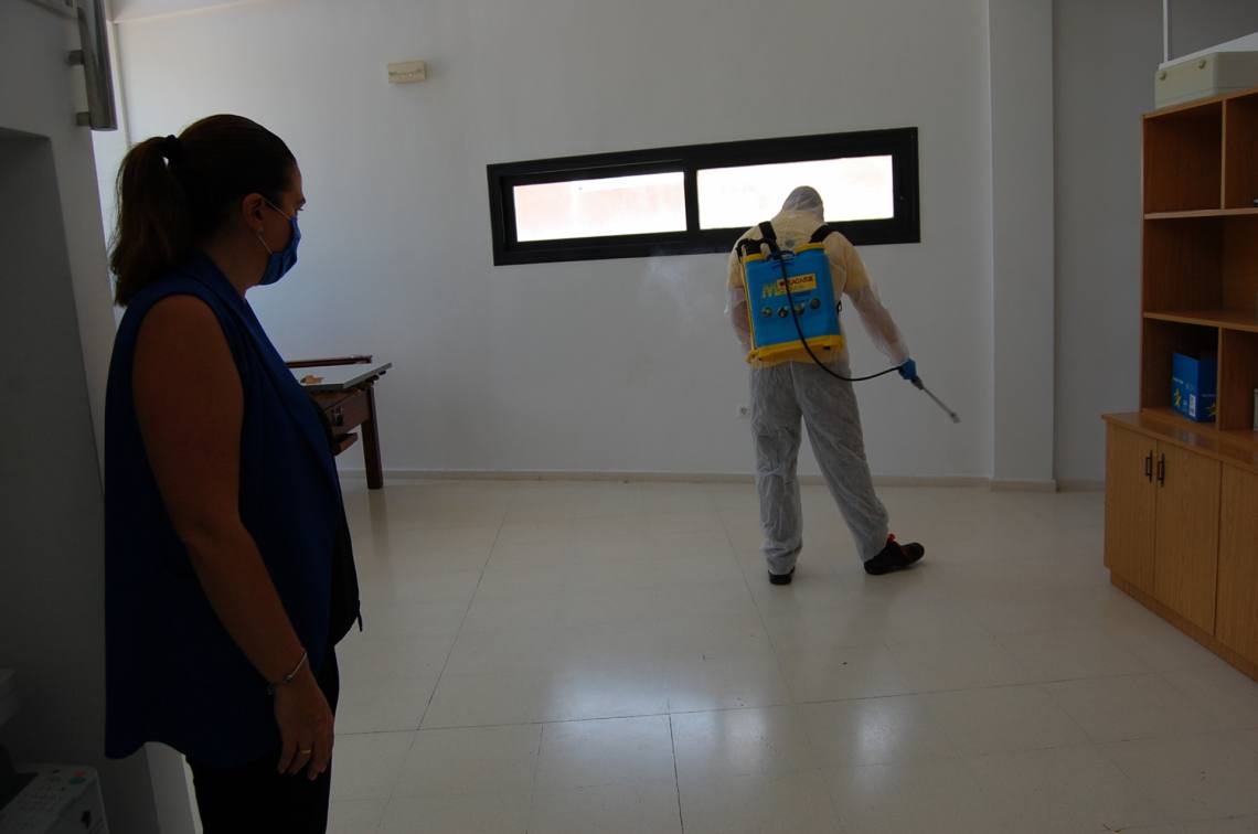 La delegada de Sanidad del Ayuntamiento de Los Barrios, Inmaculada Domínguez, ha visitado los núcleos poblacionales de Palmones y Los Cortijillos para supervisar nuevos trabajos de desinfección en los edificios municipales como medida de prevención contra el coronavirus.