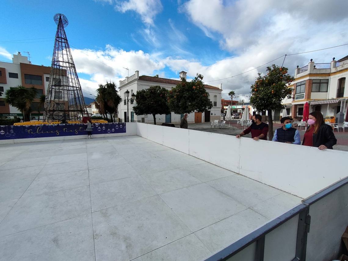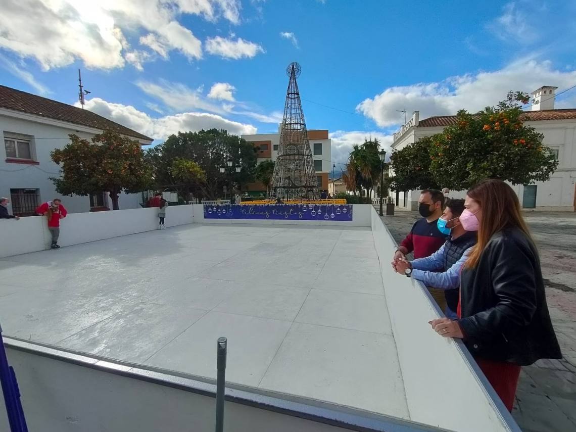 El delegado de Cultura y Festejos, Daniel Pérez Cumbre, la delegada de Participación Ciudadana, Inmaculada Domínguez, y el delegado de Juventud y Turismo, Antonio Dávila, han inaugurado hoy la apertura al público en Los Barrios de la gran pista sintética de patinaje que a lo largo de estas fiestas navideñas está recorriendo los diferentes núcleos de población del término municipal barreño.