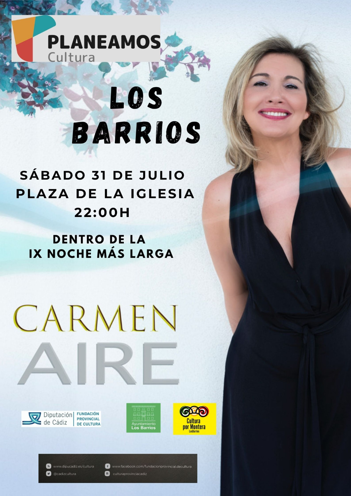 Además, en esta ocasión, la velada, que estará amenizada con música de charangas y pasacalles recorriendo el centro de la población y llevando consigo alegría y diversión, trae consigo un concierto excepcional como el que ofrecerá en la Plaza de la Iglesia, el mismo sábado 31 de julio, a partir de las 22:00 h., la artista barreña Carmen Rodríguez Camacho, que regresa a su tierra para presentar su último trabajo musical titulado “Aire”, con el que ya está cosechando muchos éxitos.