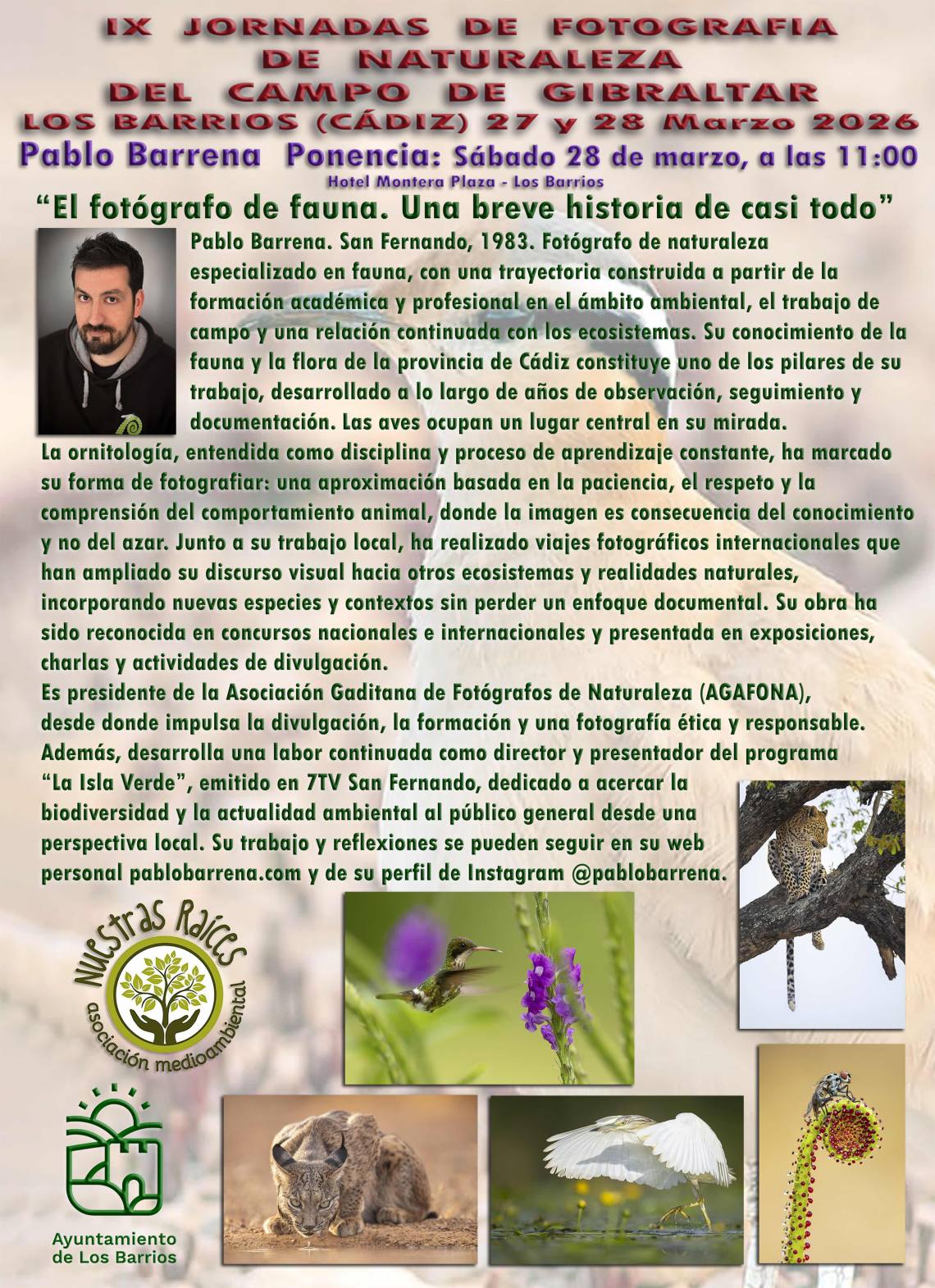 La programación central se desarrollará el sábado 28 de marzo en el Hotel Montera Plaza. La jornada comenzará a las 10:00 h con la ponencia «Fotografiando momentos. La vida secreta de los animales» a cargo de Jero Milán, ornitólogo y escritor extremeño con una dilatada trayectoria en la divulgación del patrimonio natural. A las 11:00 h será el turno de Pablo Barrena, fotógrafo especializado en fauna y presidente de la Asociación Gaditana de Fotógrafos de Naturaleza (AGAFONA), quien presentará «El fotógrafo de fauna. Una breve historia de casi todo». Tras un descanso, a las 12:30 h, el biólogo y especialista en macrofotografía Antonio J. Ortiz Ruiz cerrará el ciclo con la conferencia «Fotografía de naturaleza macro. Técnica, arte y ética en el mundo de lo pequeño».