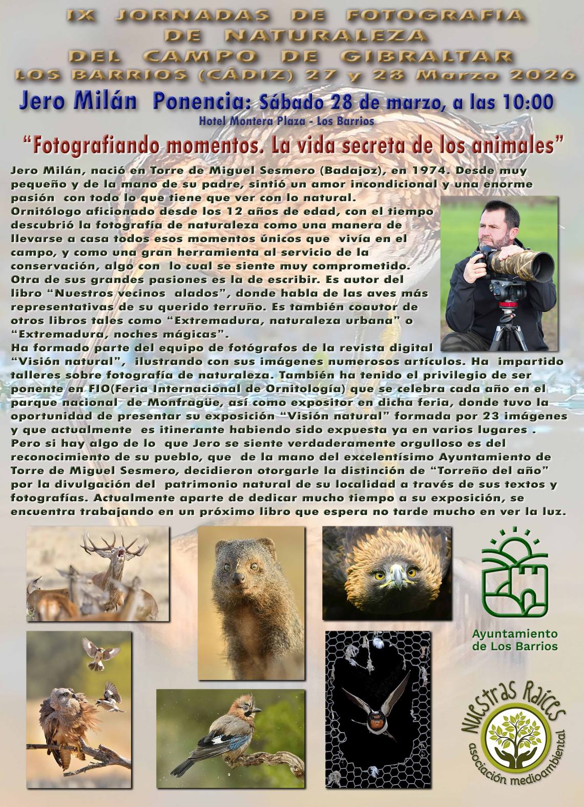 La programación central se desarrollará el sábado 28 de marzo en el Hotel Montera Plaza. La jornada comenzará a las 10:00 h con la ponencia «Fotografiando momentos. La vida secreta de los animales» a cargo de Jero Milán, ornitólogo y escritor extremeño con una dilatada trayectoria en la divulgación del patrimonio natural. A las 11:00 h será el turno de Pablo Barrena, fotógrafo especializado en fauna y presidente de la Asociación Gaditana de Fotógrafos de Naturaleza (AGAFONA), quien presentará «El fotógrafo de fauna. Una breve historia de casi todo». Tras un descanso, a las 12:30 h, el biólogo y especialista en macrofotografía Antonio J. Ortiz Ruiz cerrará el ciclo con la conferencia «Fotografía de naturaleza macro. Técnica, arte y ética en el mundo de lo pequeño».