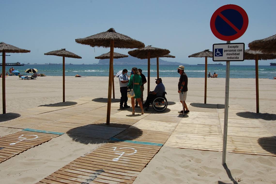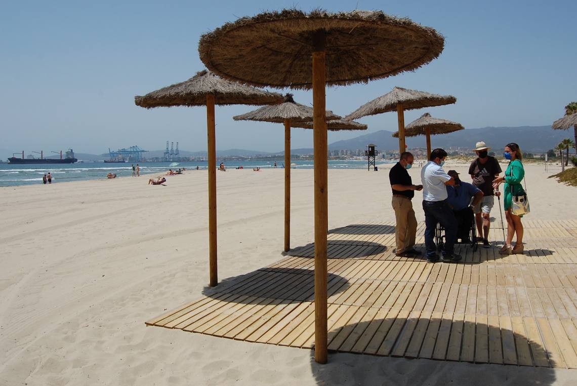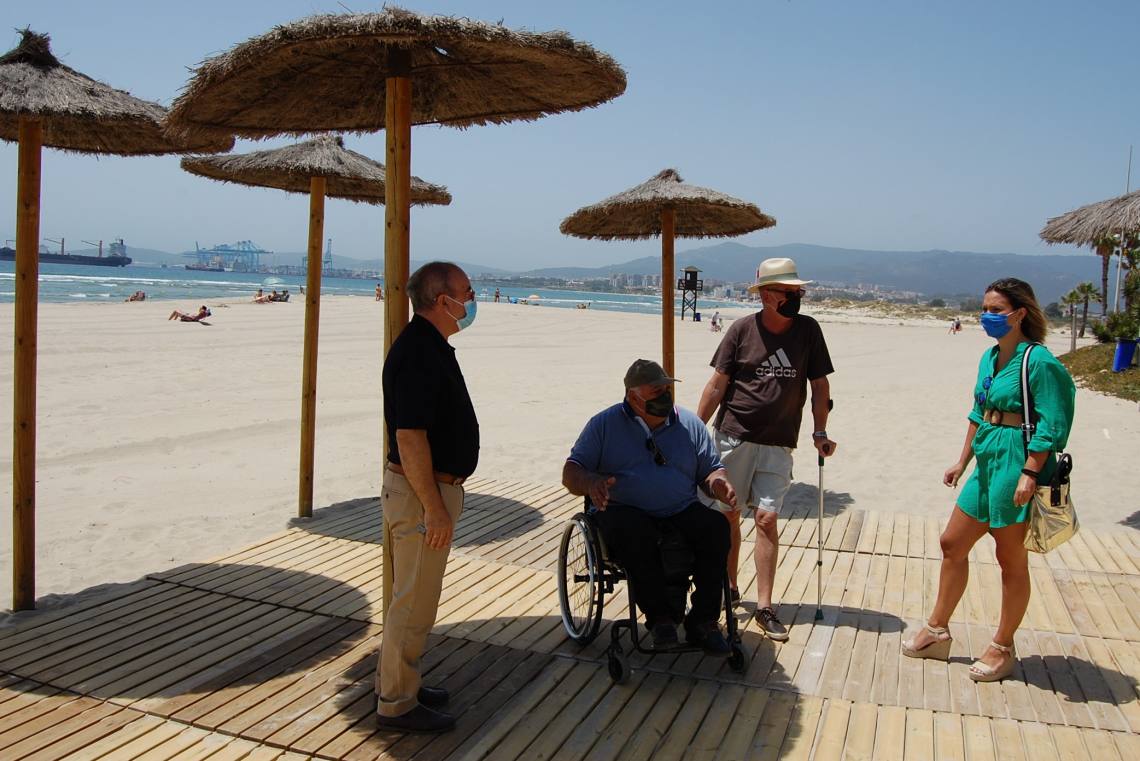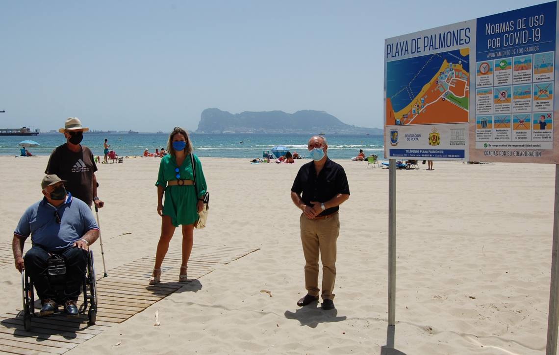 La primera teniente de alcalde, Sara Lobato, y el delegado de Playas del Ayuntamiento de Los Barrios, José Antonio Gómez, han visitado este mediodía junto a miembros de la Asociación de Discapacitados La Montera, con su presidente, Juan Antonio Muñoz, la zona que se ha adaptado para personas con discapacidad en la playa de Palmones.