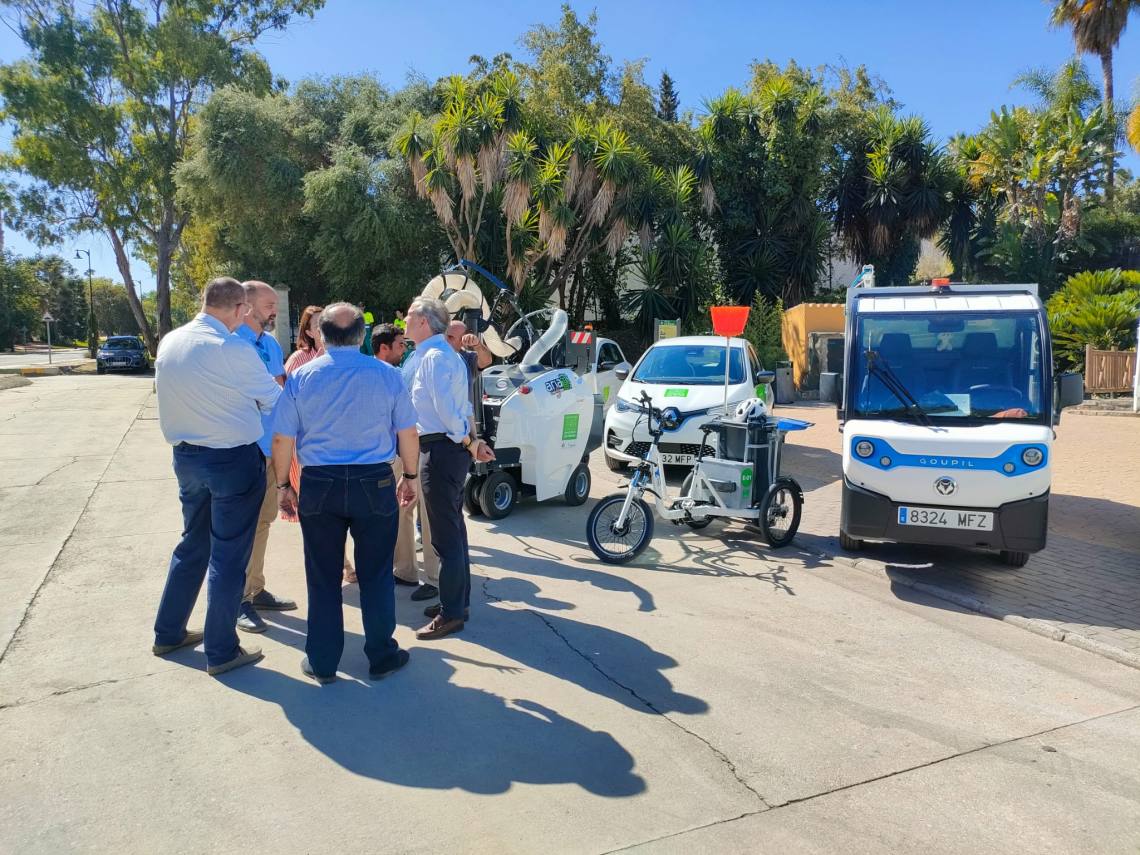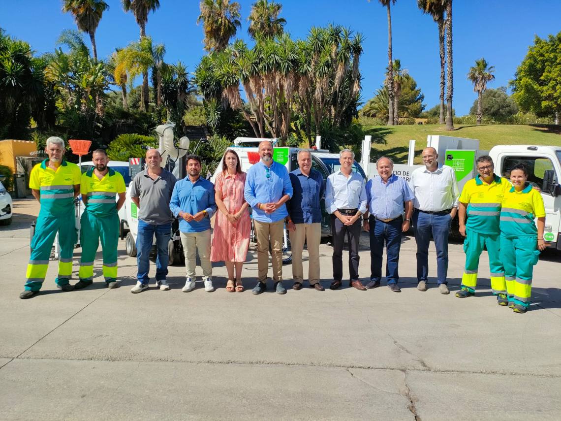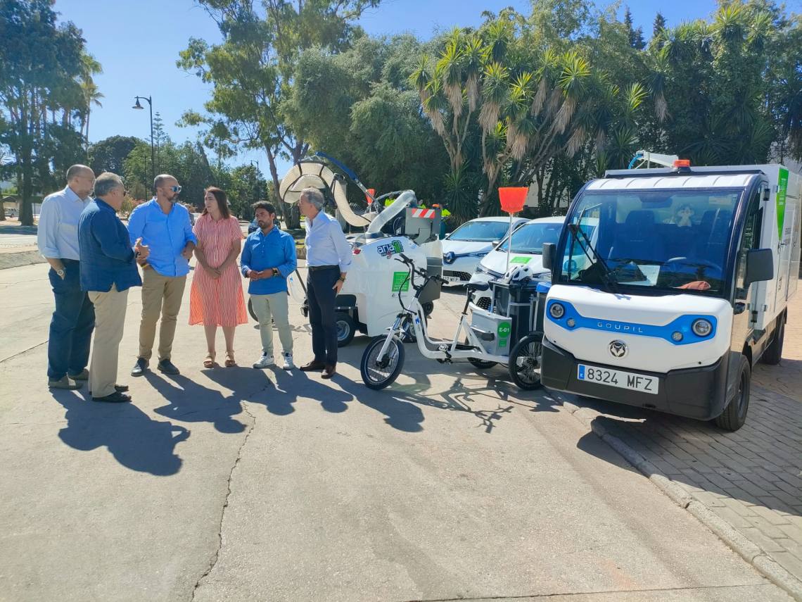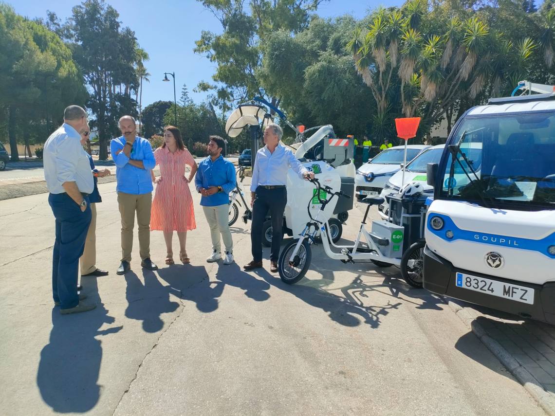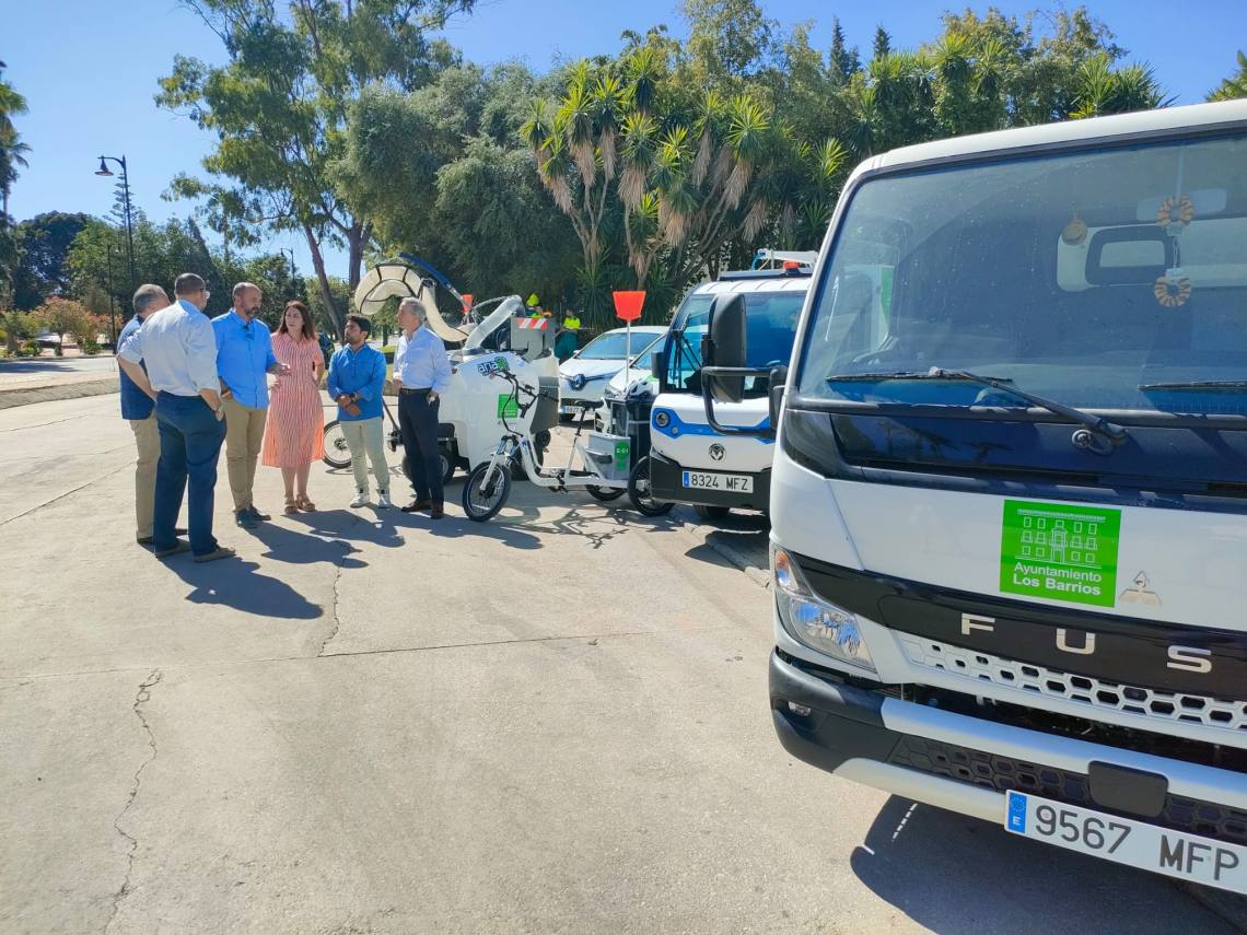 El alcalde de Los Barrios, Miguel Alconchel; la delegada de Limpieza, Cristina Silva; el delegado de Medio Ambiente, Antonio Dávila, y responsables de la empresa concesionaria han presentado los nuevos vehículos y maquinaria que se incorporan al servicio de limpieza viaria.