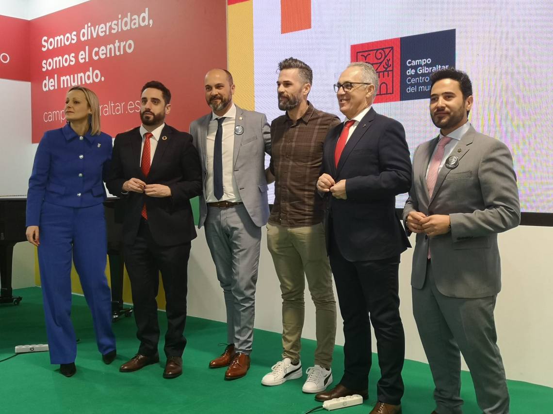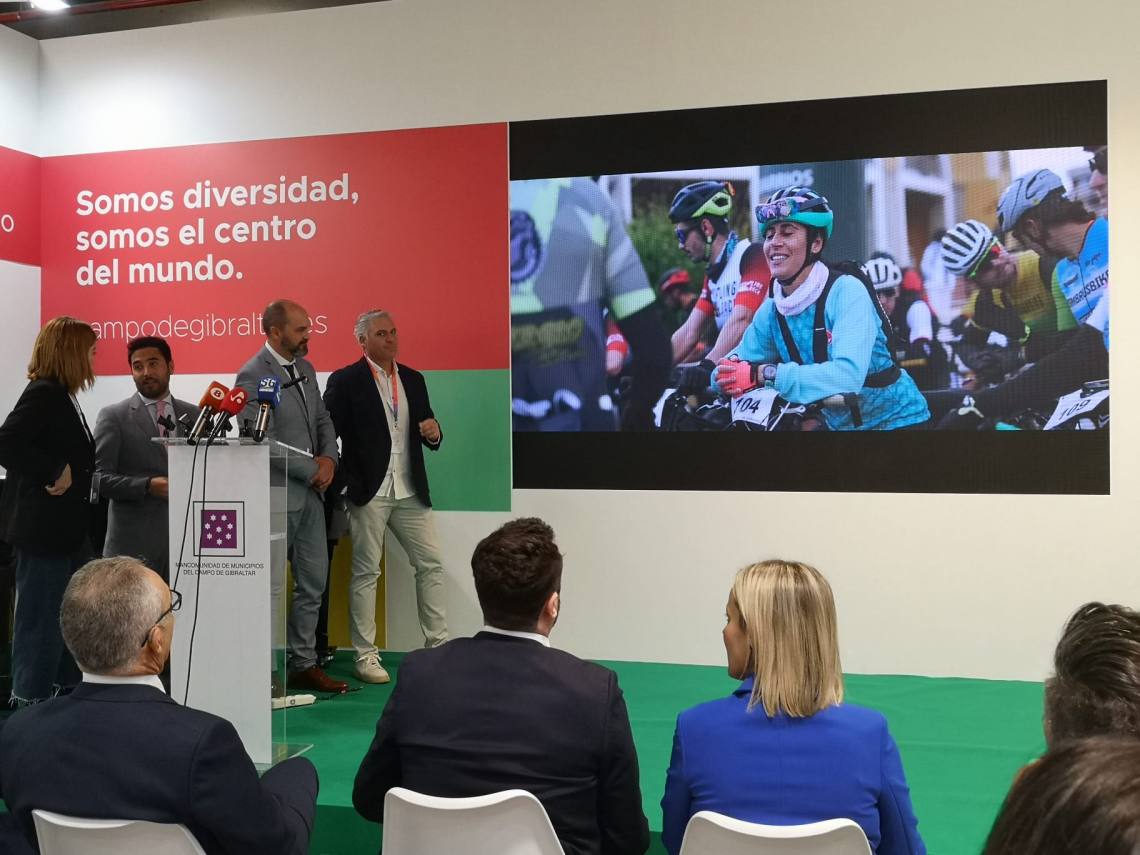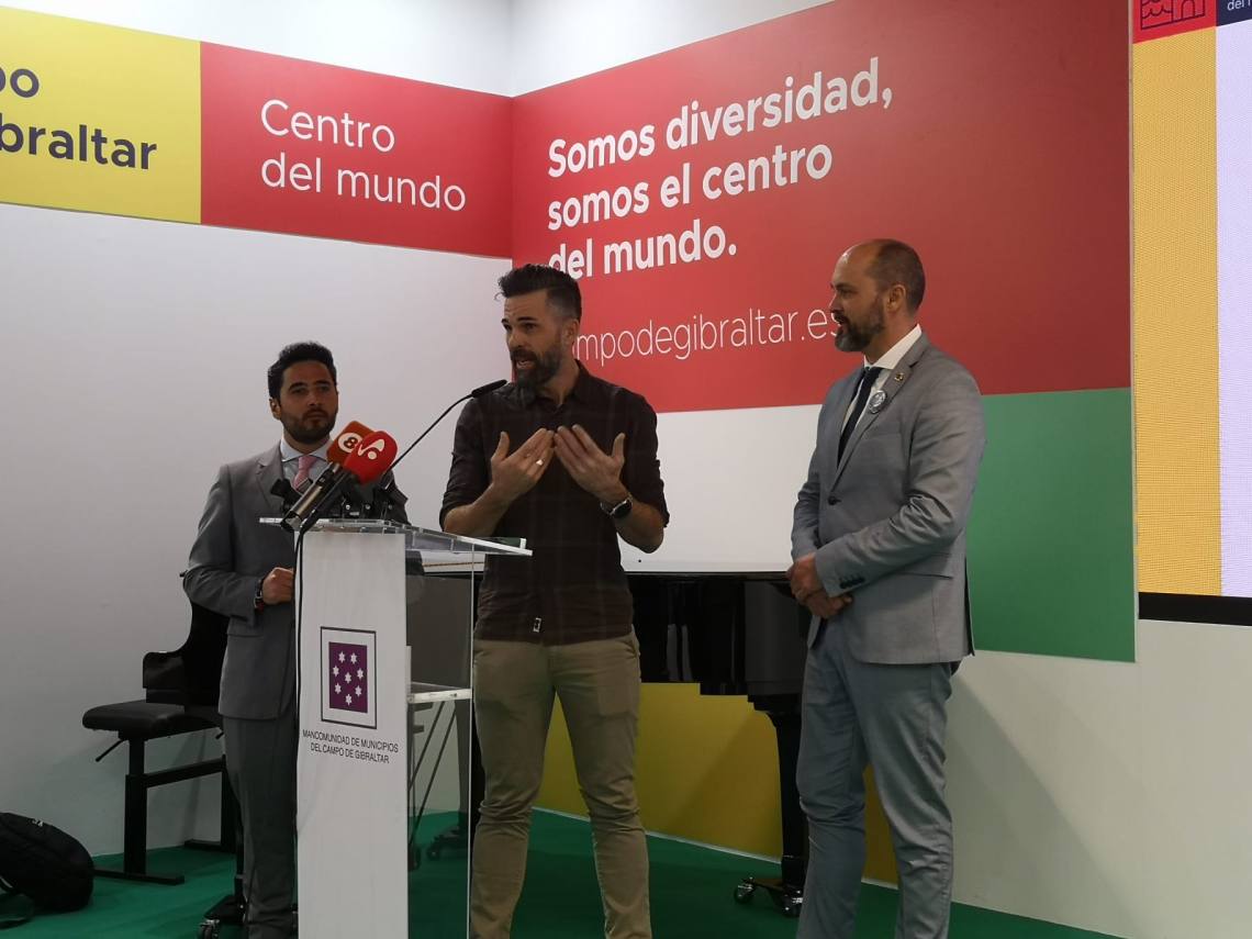 El alcalde de Los Barrios, Miguel Alconchel; y el delegado de Turismo, Dávila, han presentado esta mañana en el estand de la Mancomunidad de Municipios del Campo de Gibraltar en FITUR la oferta de turismo activo y de naturaleza centrada este año en dos pruebas deportivas y una nueva ruta entre las dos bahías.