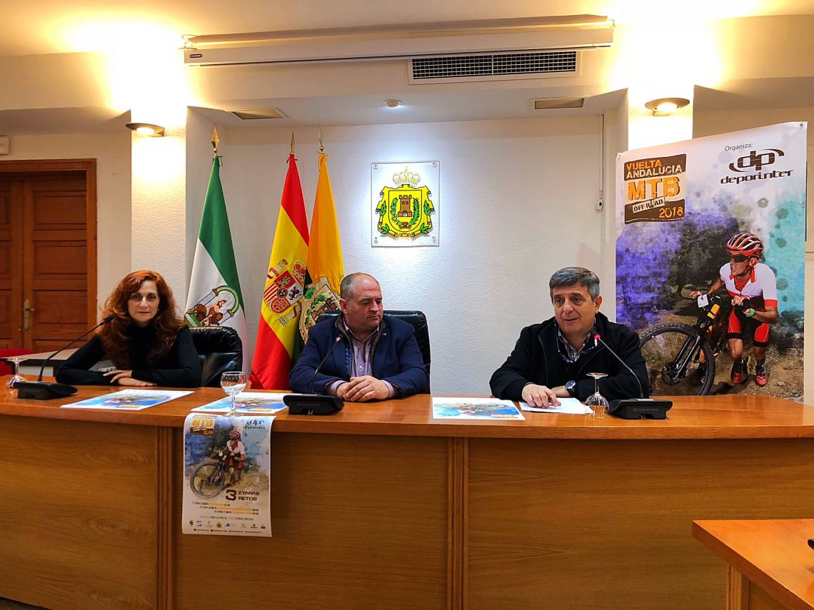 El alcalde de Los Barrios, Jorge Romero, junto a la delegada de Turismo, Isabel Calvente; y el director general de Deporinter, Joaquín Cuevas, han presentado este mediodía la etapa de Los Barrios de la Vuelta Andalucía MTB 2018 y en la que el municipio será protagonista.