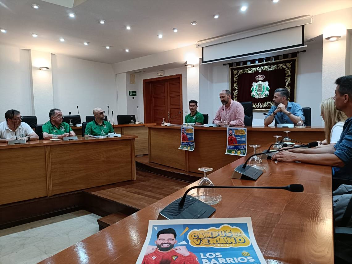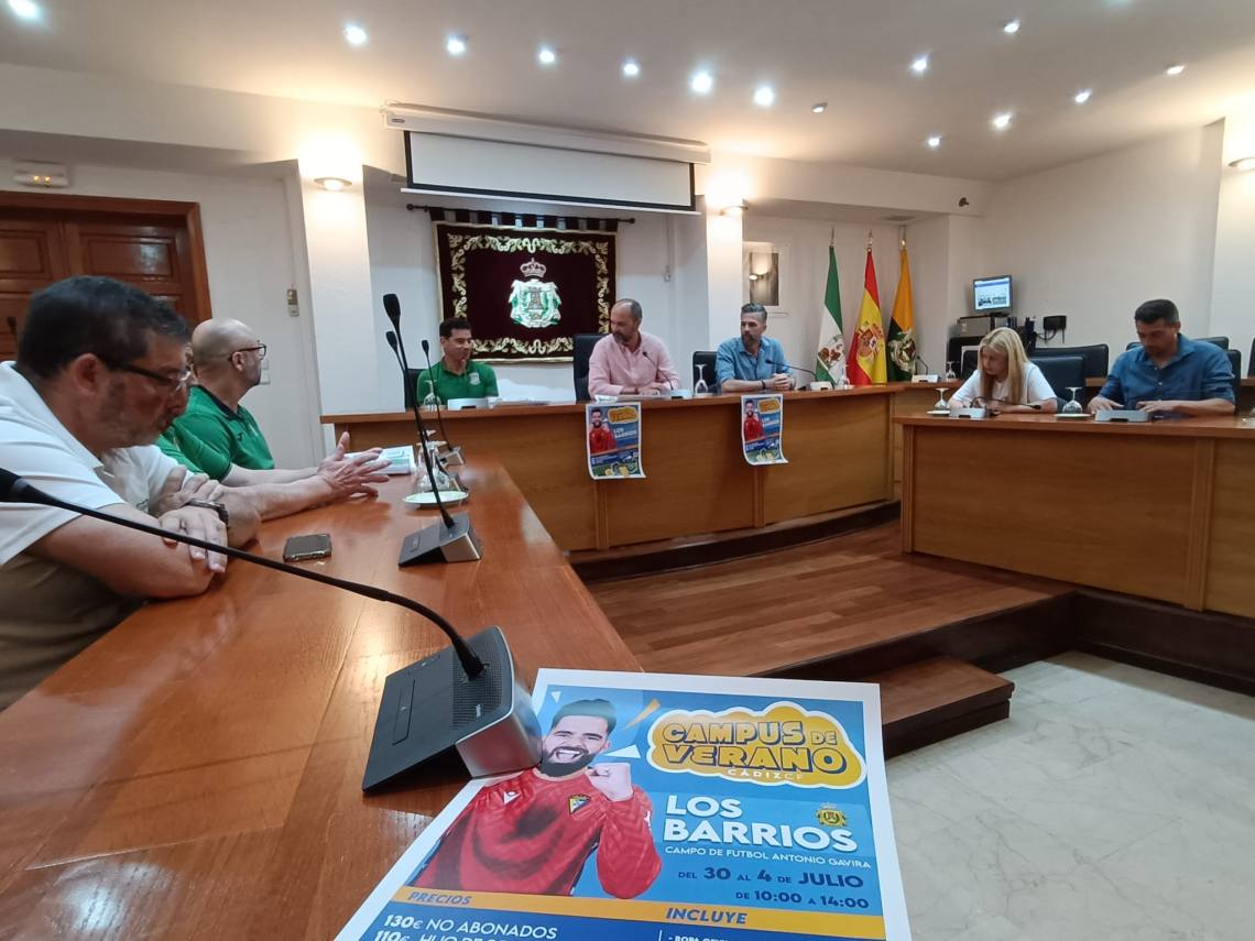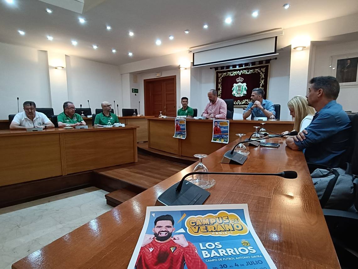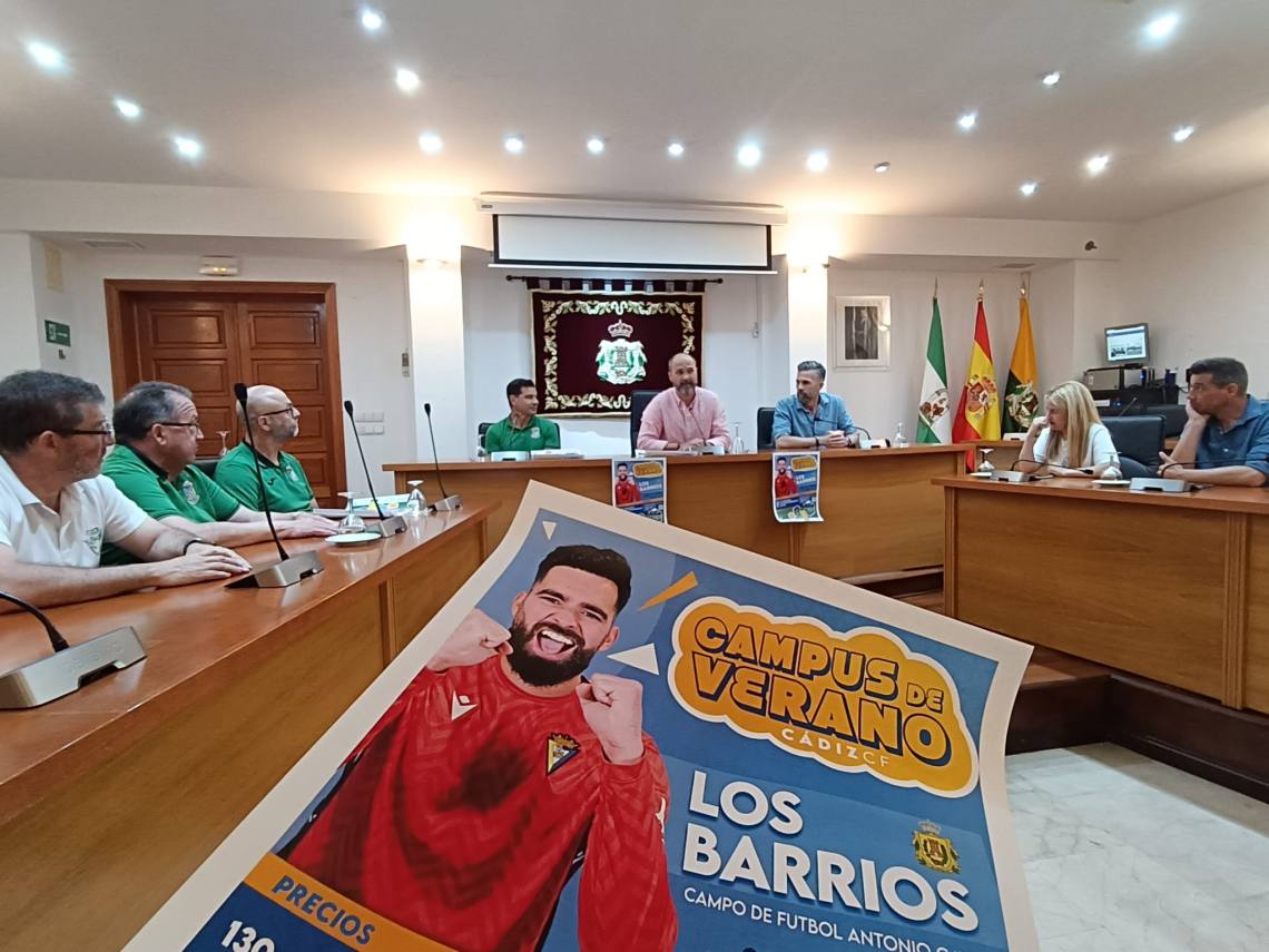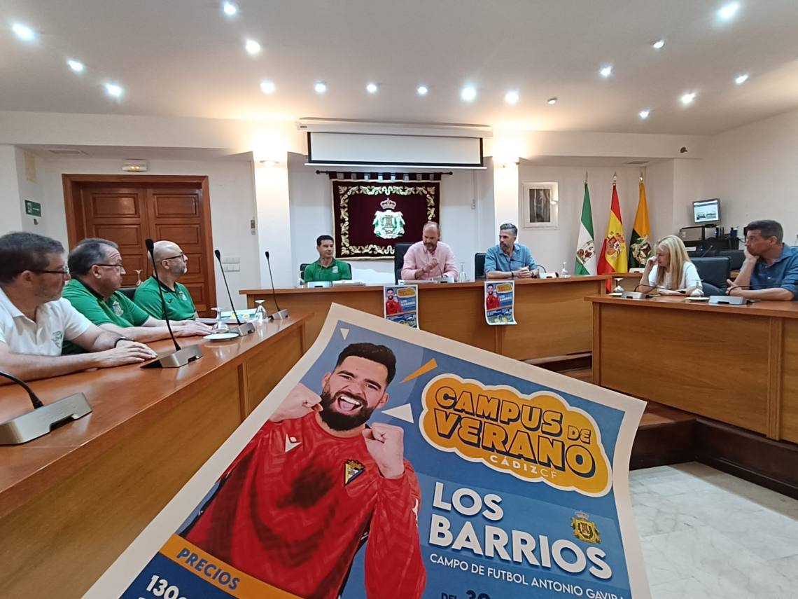 El alcalde de Los Barrios, Miguel Alconchel; el concejal de Deportes, Raúl Álvarez, y la concejala delegada de Los Cortijillos, May Gallego, han presentado esta mañana en el Ayuntamiento barreño el Campus de Verano, que organiza el Cádiz CF y que se celebrará en el campo ‘Antonio Gavira’ de Los Cortijillos del 30 de junio al 4 de julio.