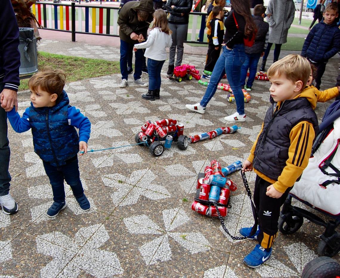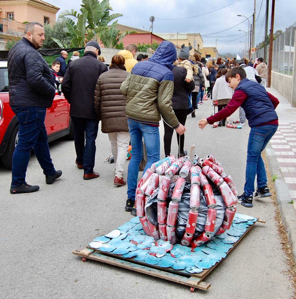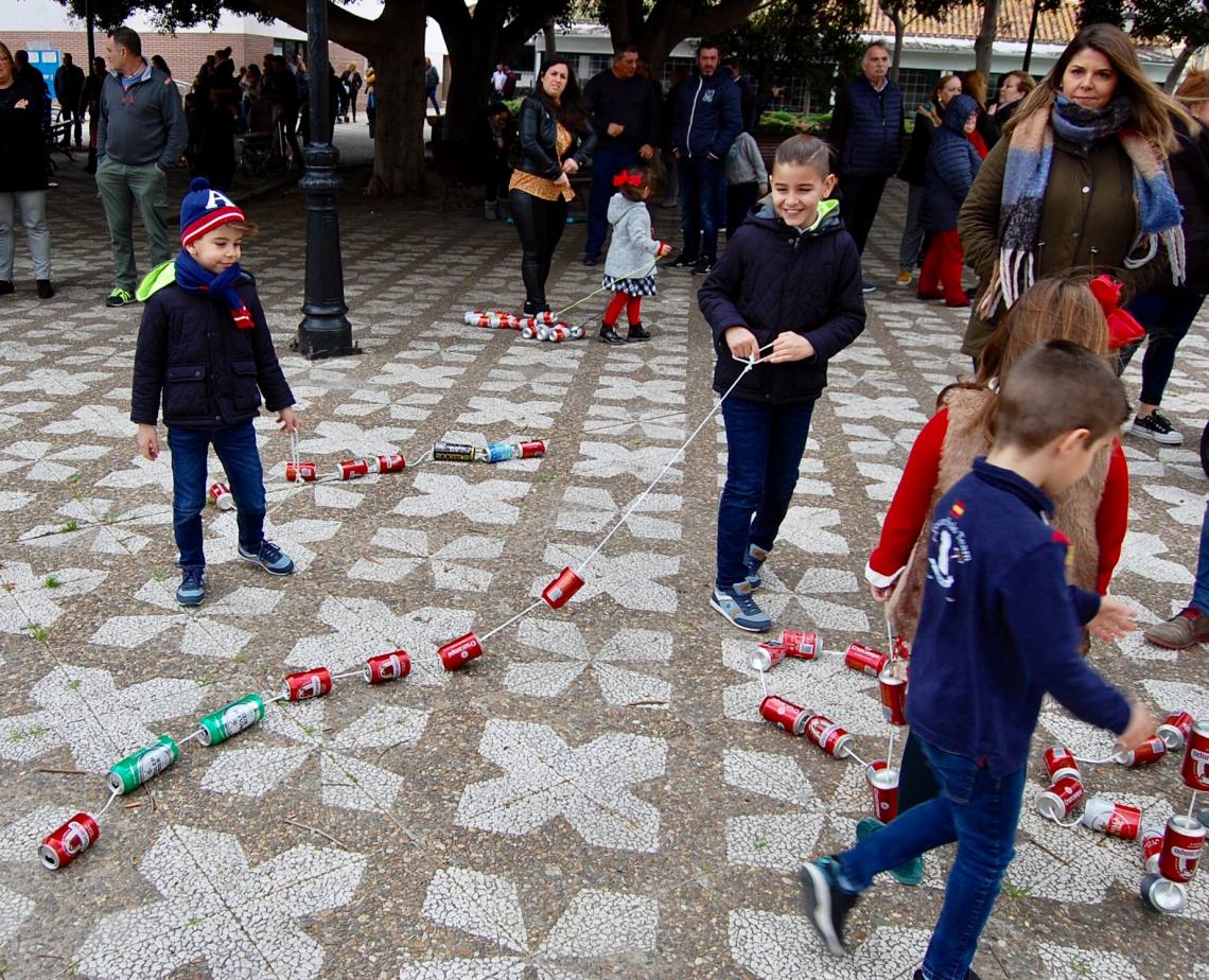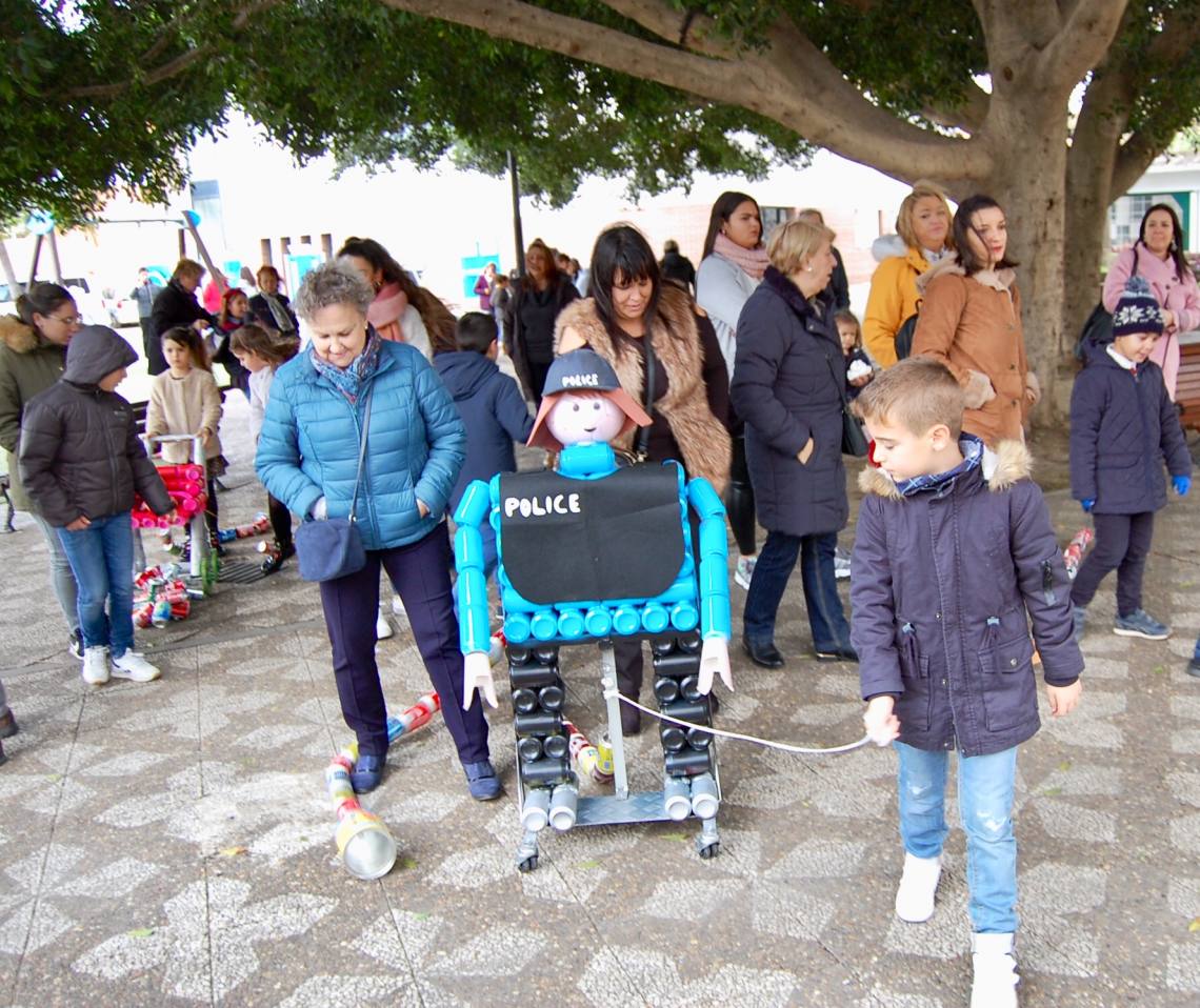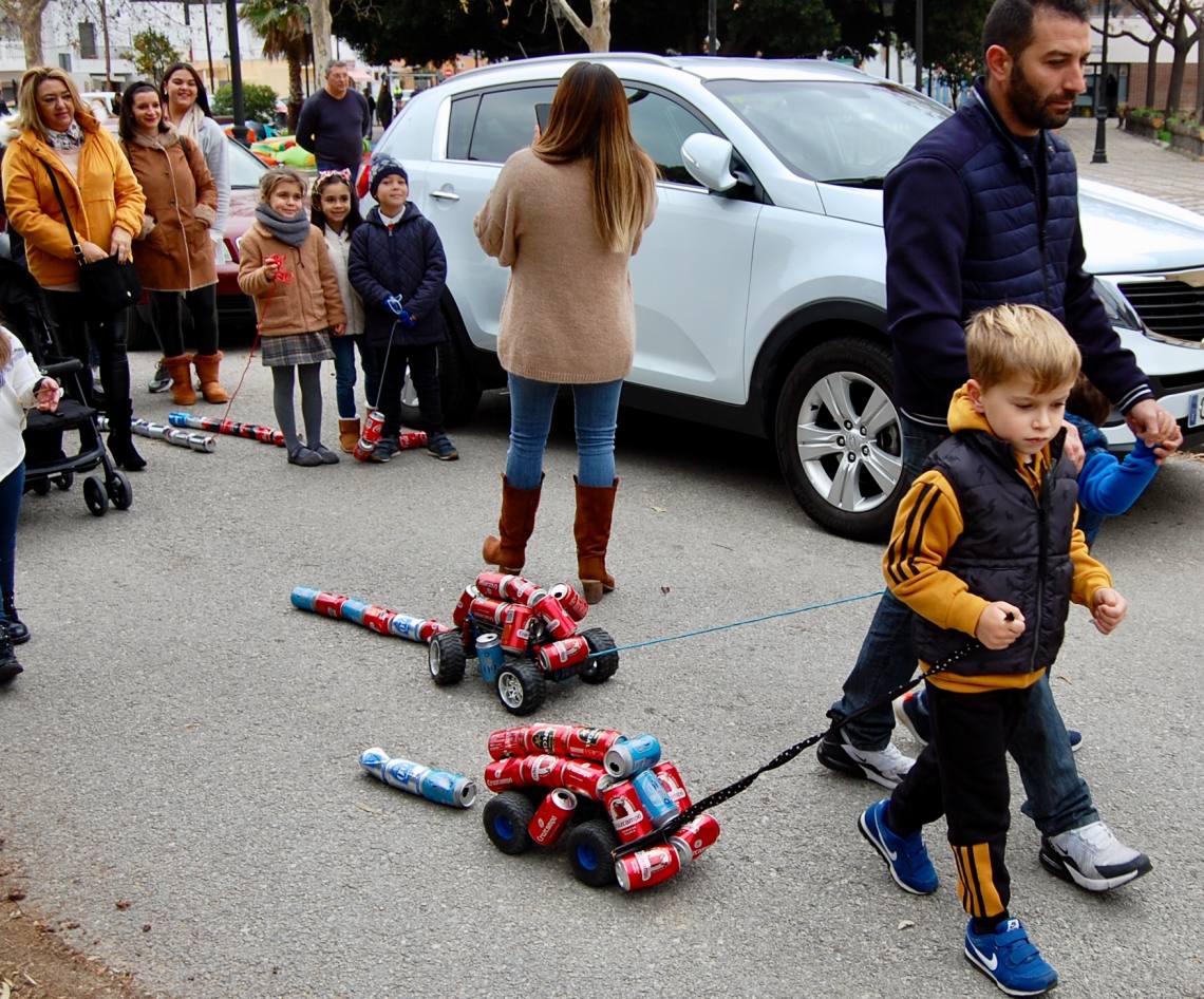 Y luego el día de Reyes ha continuado con la celebración de un animado pasacalles de arrastre de latas donde ha participado un centenar de niños y padres, que han exhibido ingeniosas construcciones de latas. La delegada May Gallego junto a la primera teniente de alcalde, Sara Lobato; y la Comisión de Festejos han entregado obsequios a los tres mejores construcciones de latas: un policía, un carrito y un cocodrilo.
