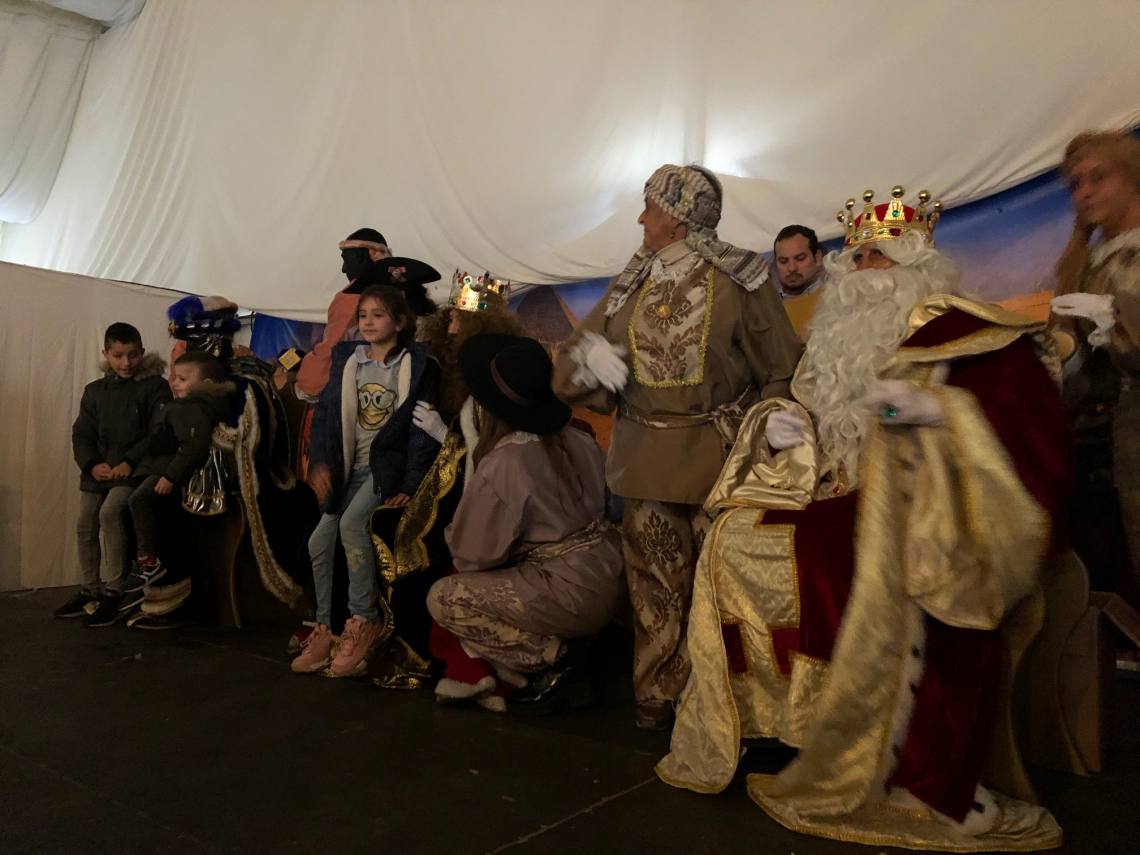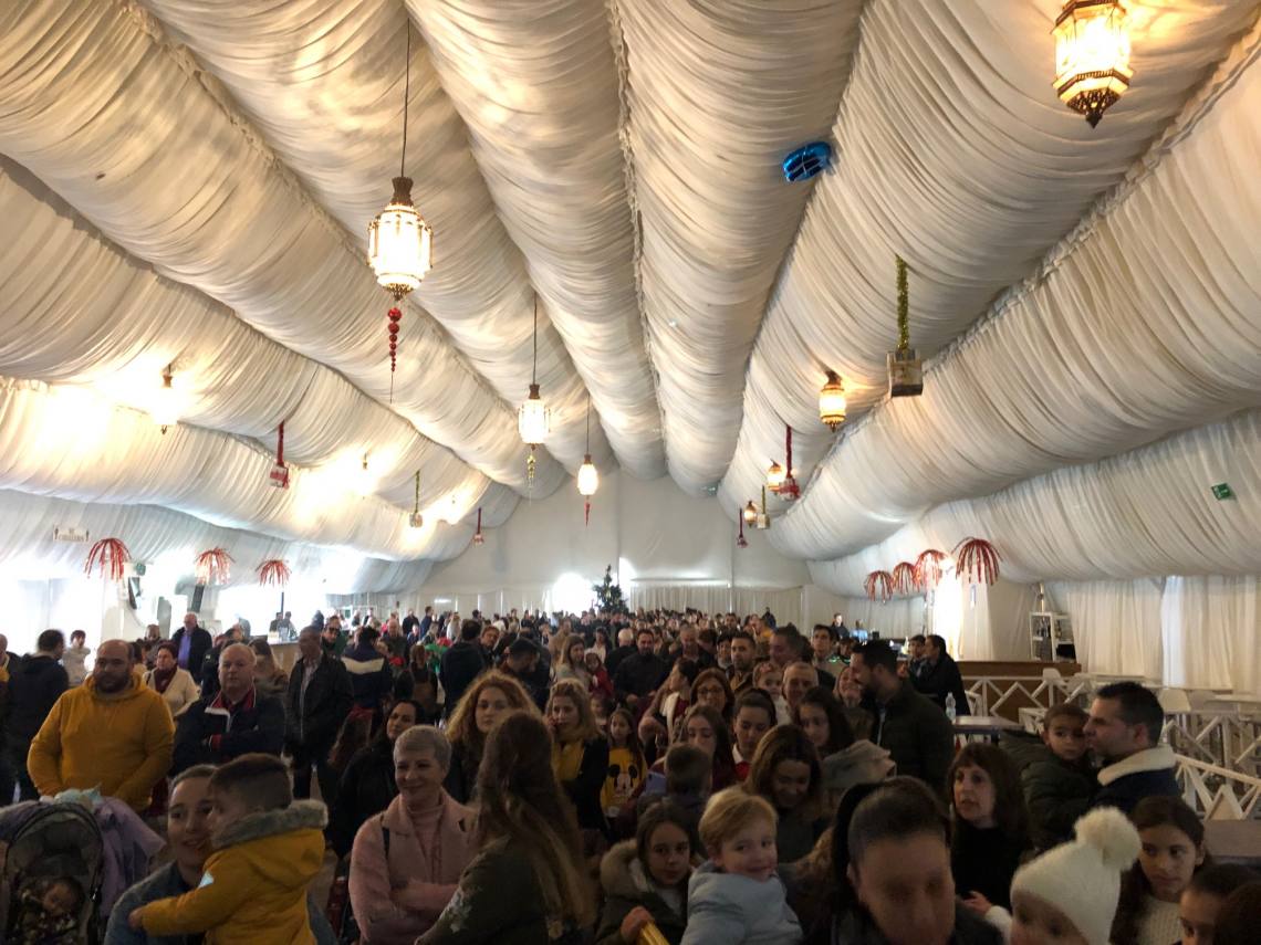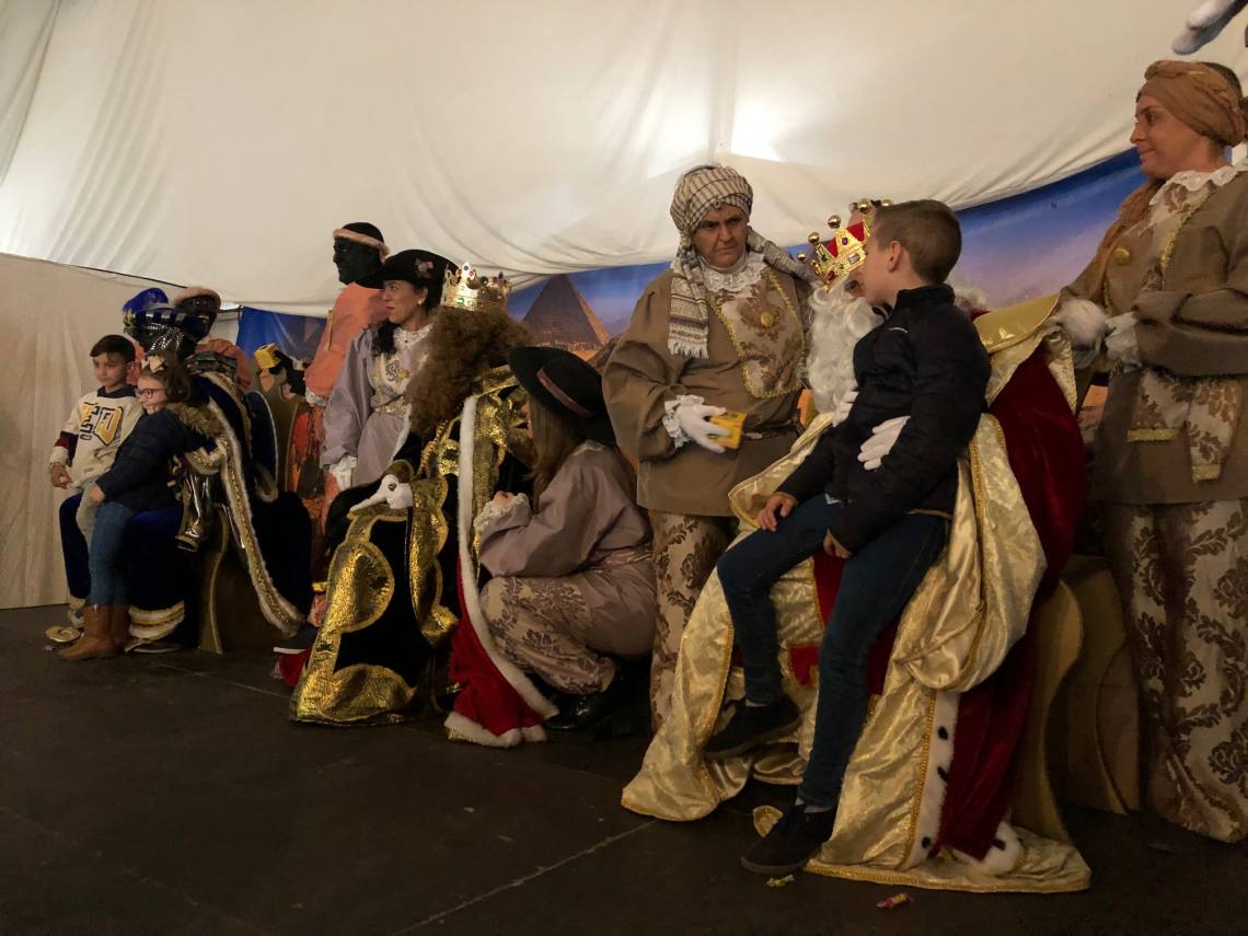 La mirada atónita de los niños que esperaban con ansia a Sus Majestades abría la recepción de los Magos de Oriente en la carpa del recinto ferial, quienes sentados en sus tronos reales han recibido a todos los niños y sentados en sus rodillas, les han contado sus peticiones y entregaron sus cartas.