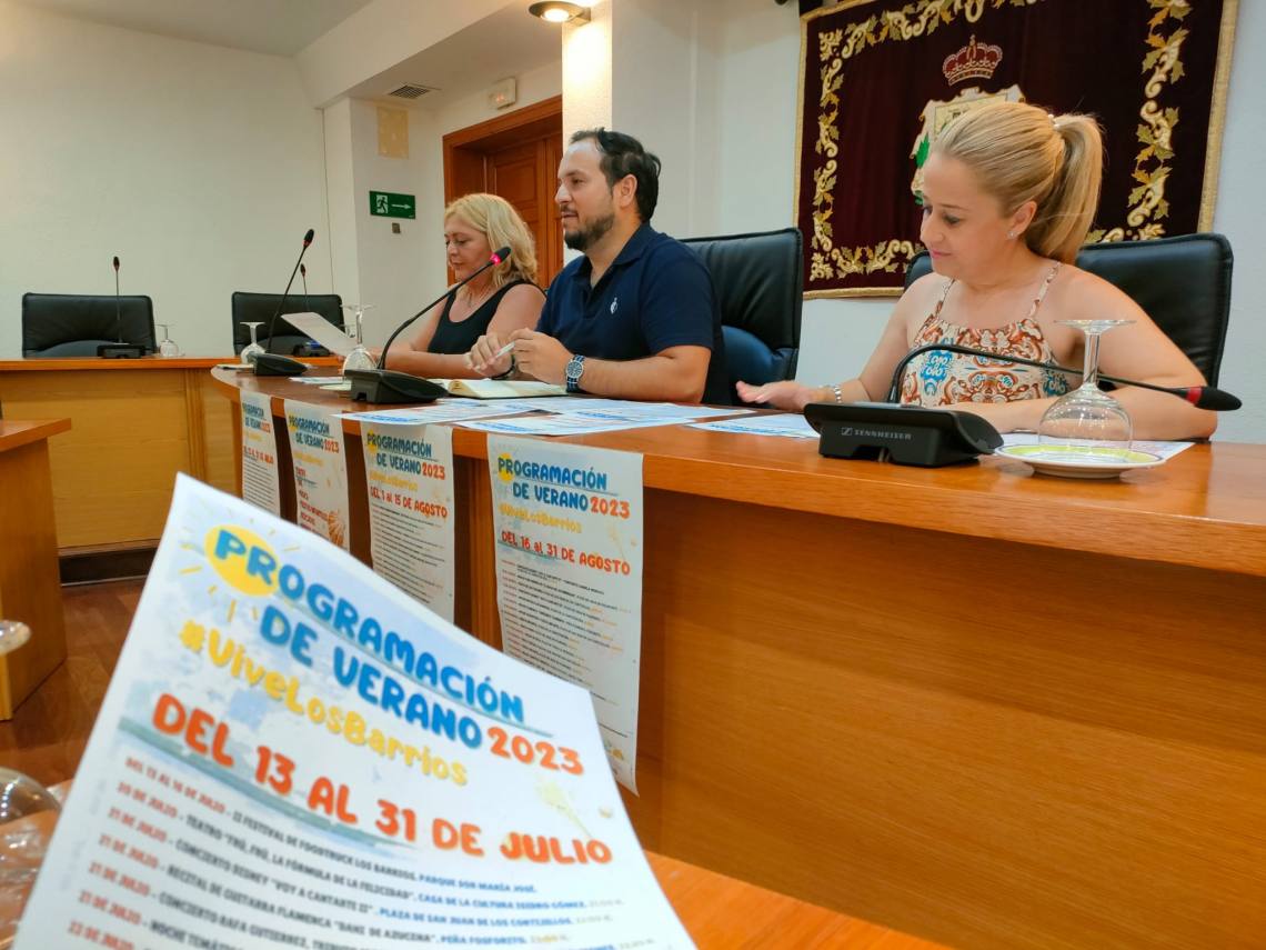 El concejal delegado de Festejos, Daniel Pérez Cumbre, la delegada de Los Cortijillos, May Gallego; y la concejala de Guadacorte, Geli Ferral, han presentado en rueda de prensa el contenido de la programación de verano 2023 organizada por el Ayuntamiento barreño.