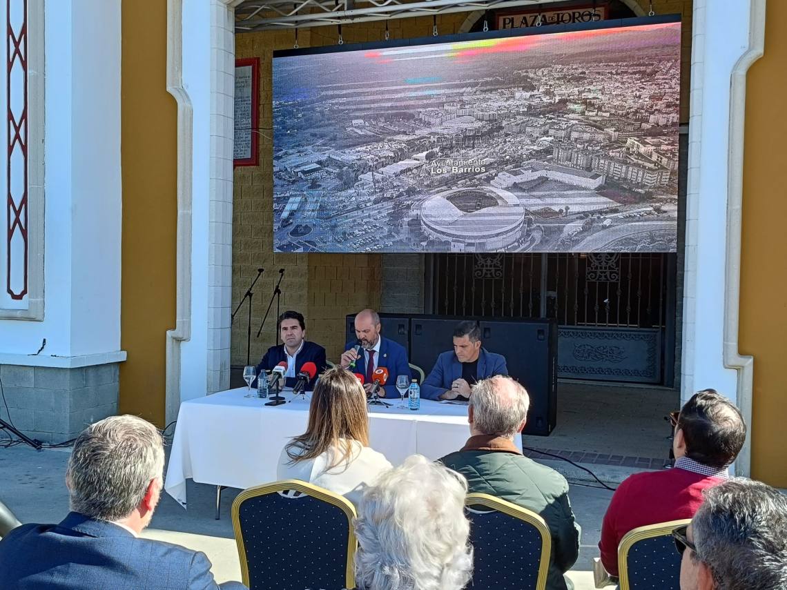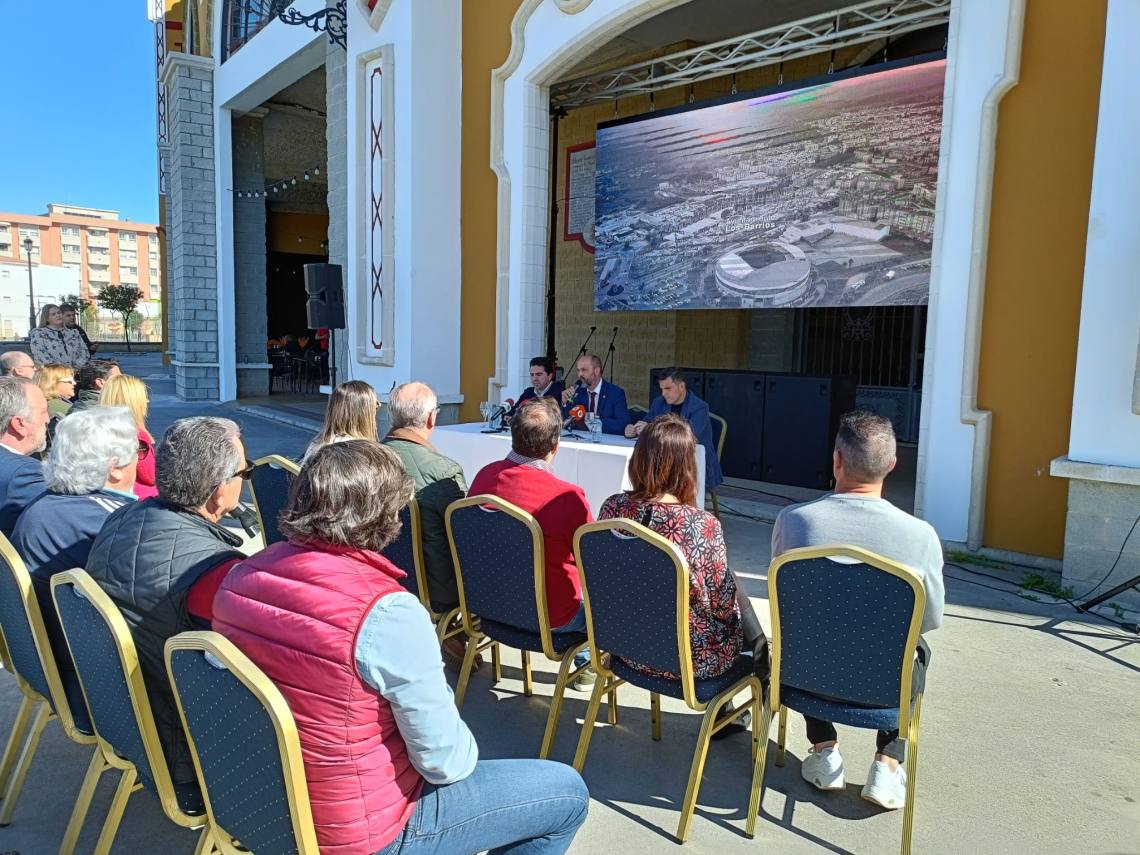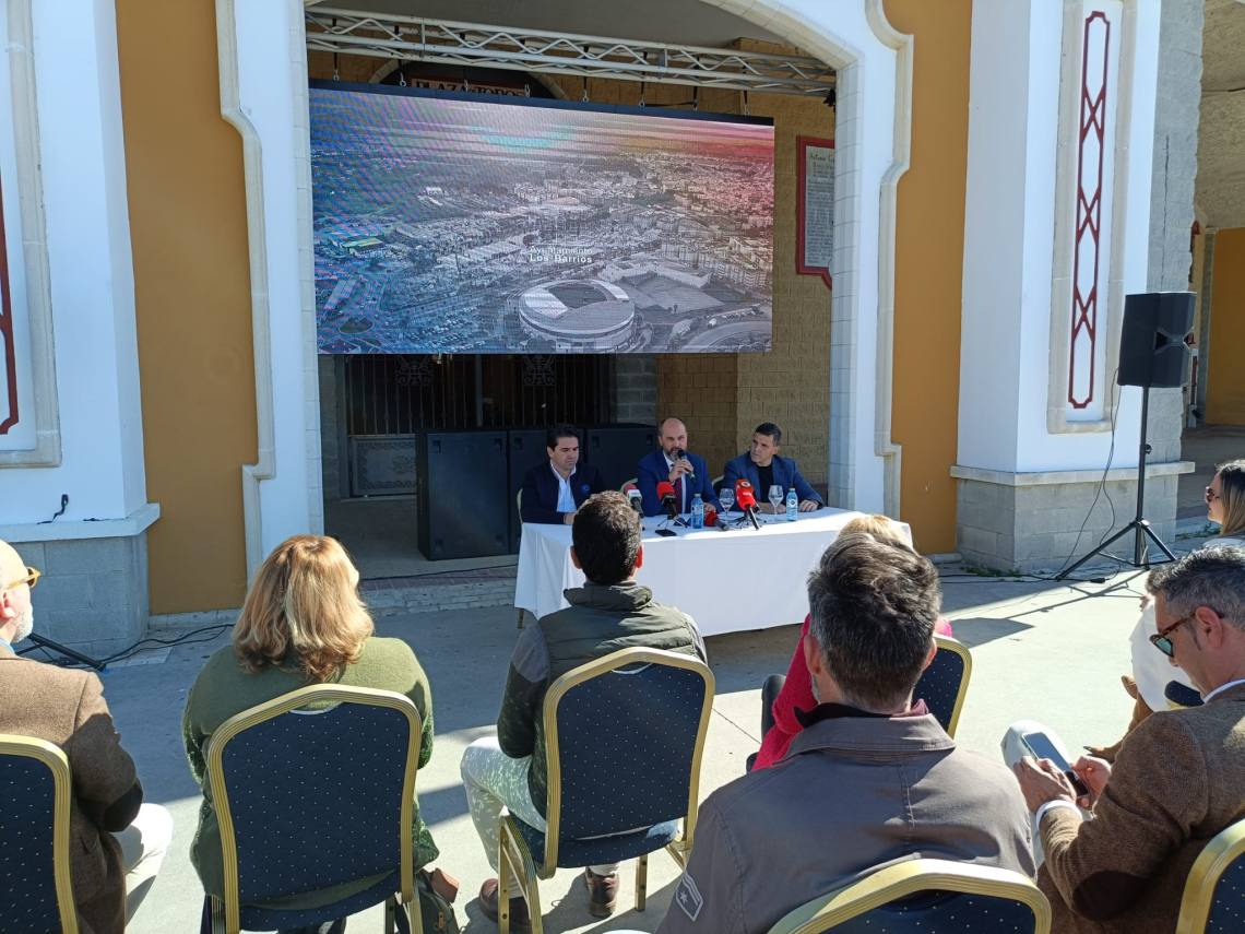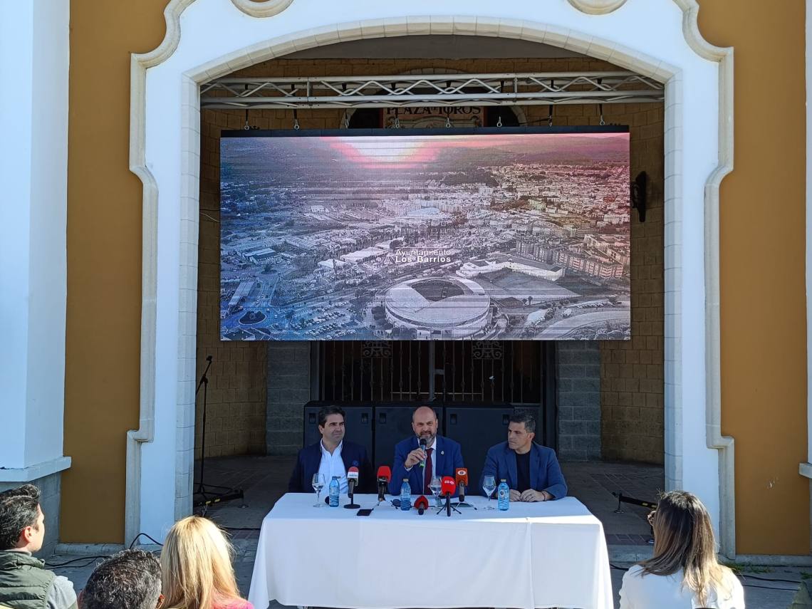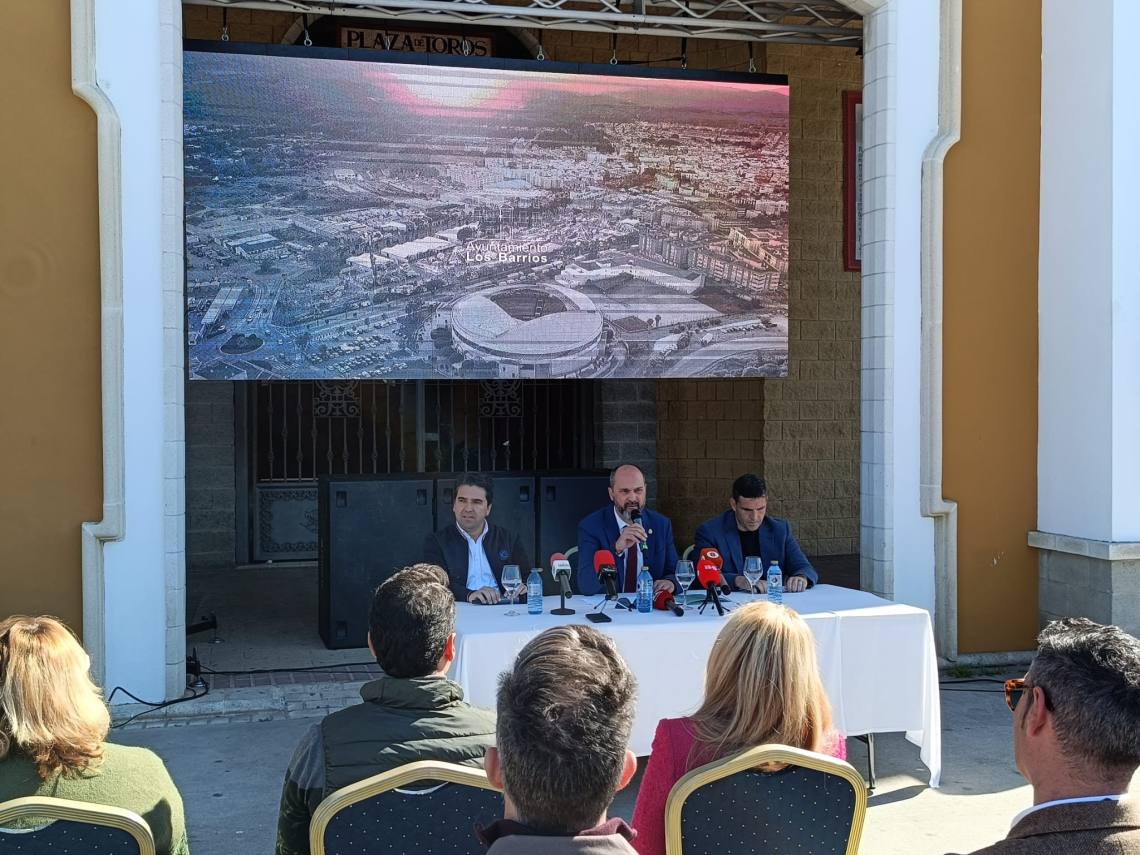 El alcalde de Los Barrios, Miguel Alconchel, ha presentado este mediodía en la puerta grande de la plaza de toros el proyecto Montera Forum, el nuevo espacio eventos de ocio, musicales y culturales, toros y fiestas tradicionales en el que se convierte la plaza toros de Los Barrios, tras finalizar las obras de la cubierta.
