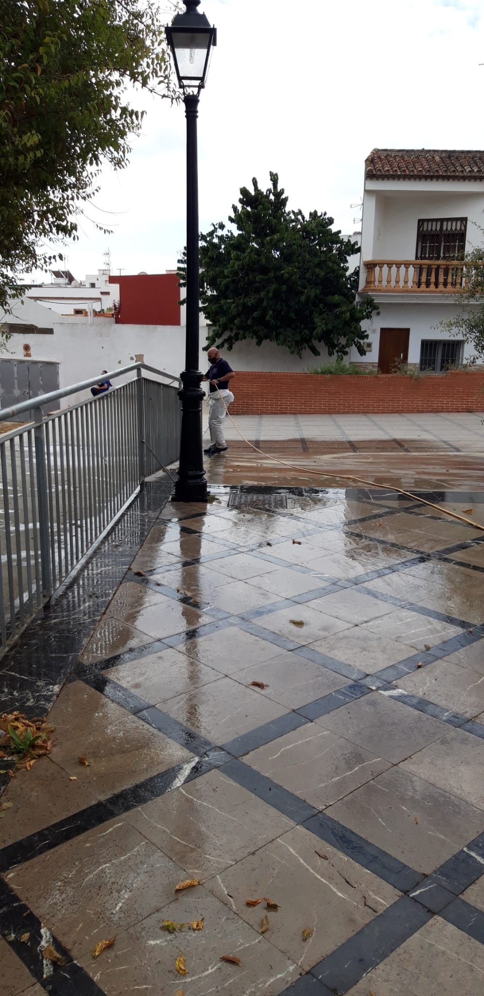 Desde primeras horas de la jornada operarios de la plantilla municipal han comenzado a desinfectar en los lugares más concurridos y de mayor afluencia del municipio, además de los parques infantiles. Para ello están pulverizando los suelos y las superficies de todos los elementos, así como el mobiliario urbano, con una mezcla de agua y lejía específicamente adecuada para tal fin.