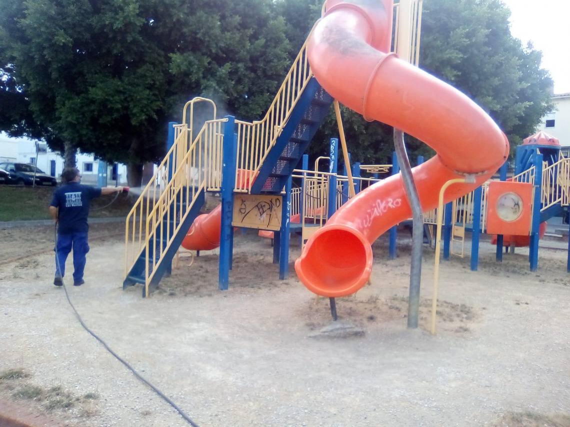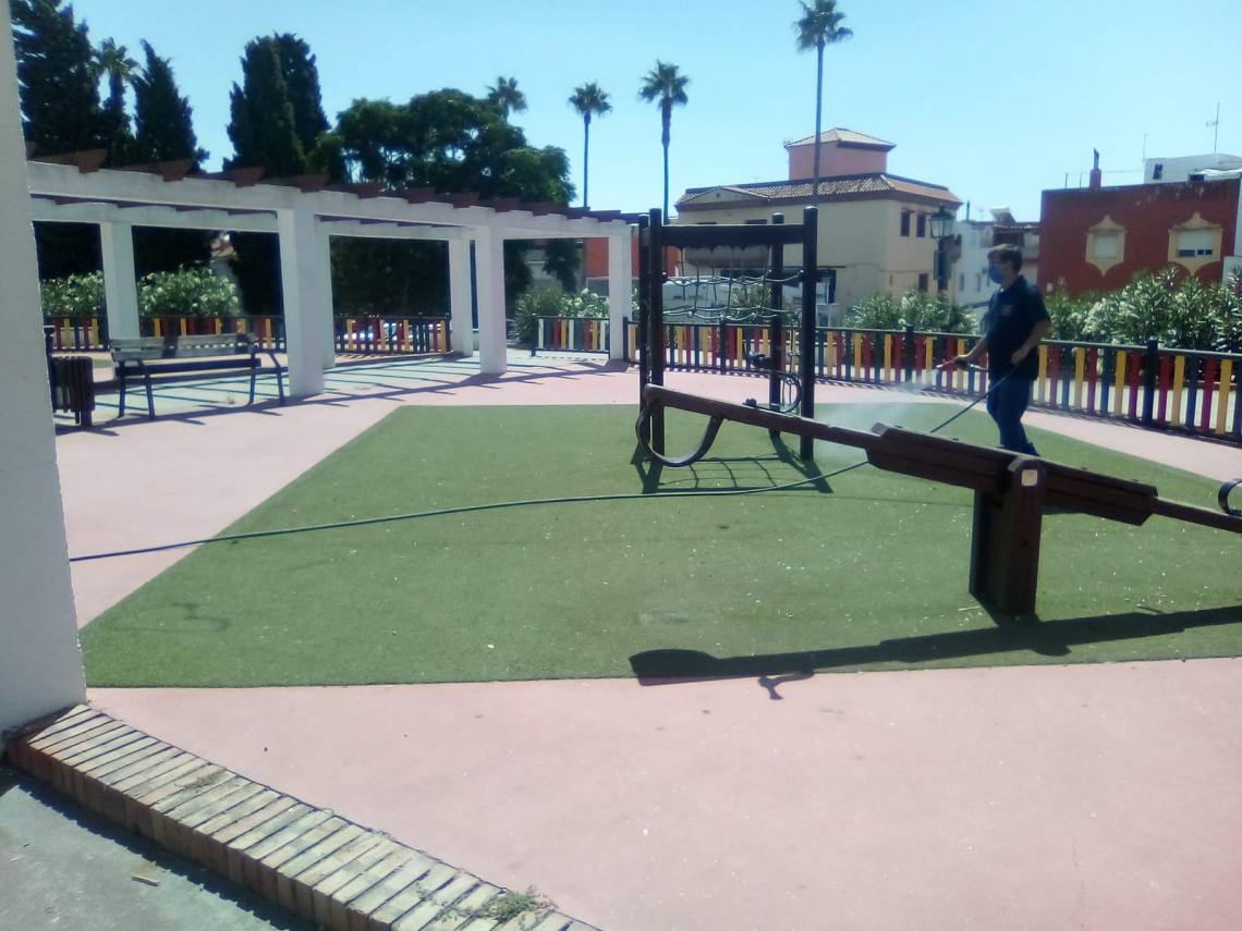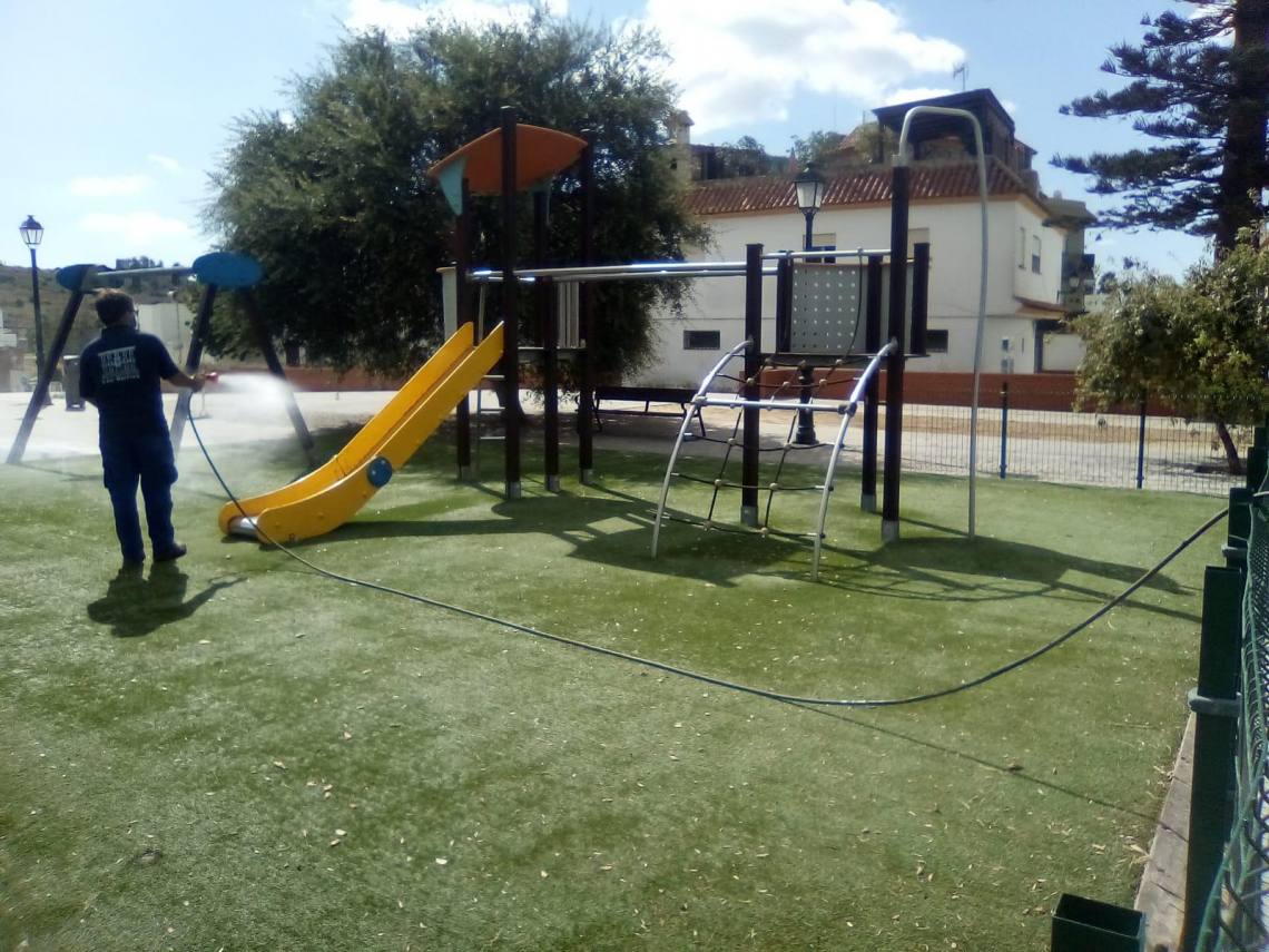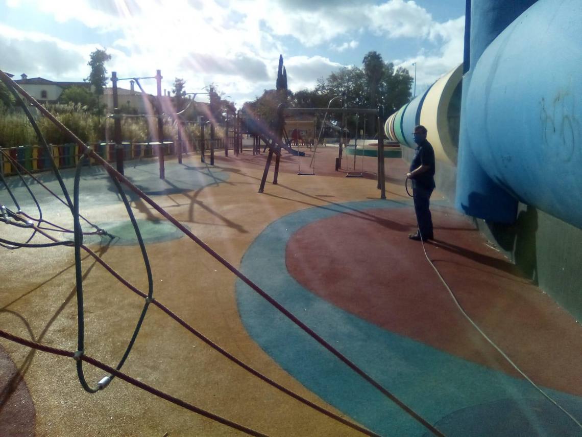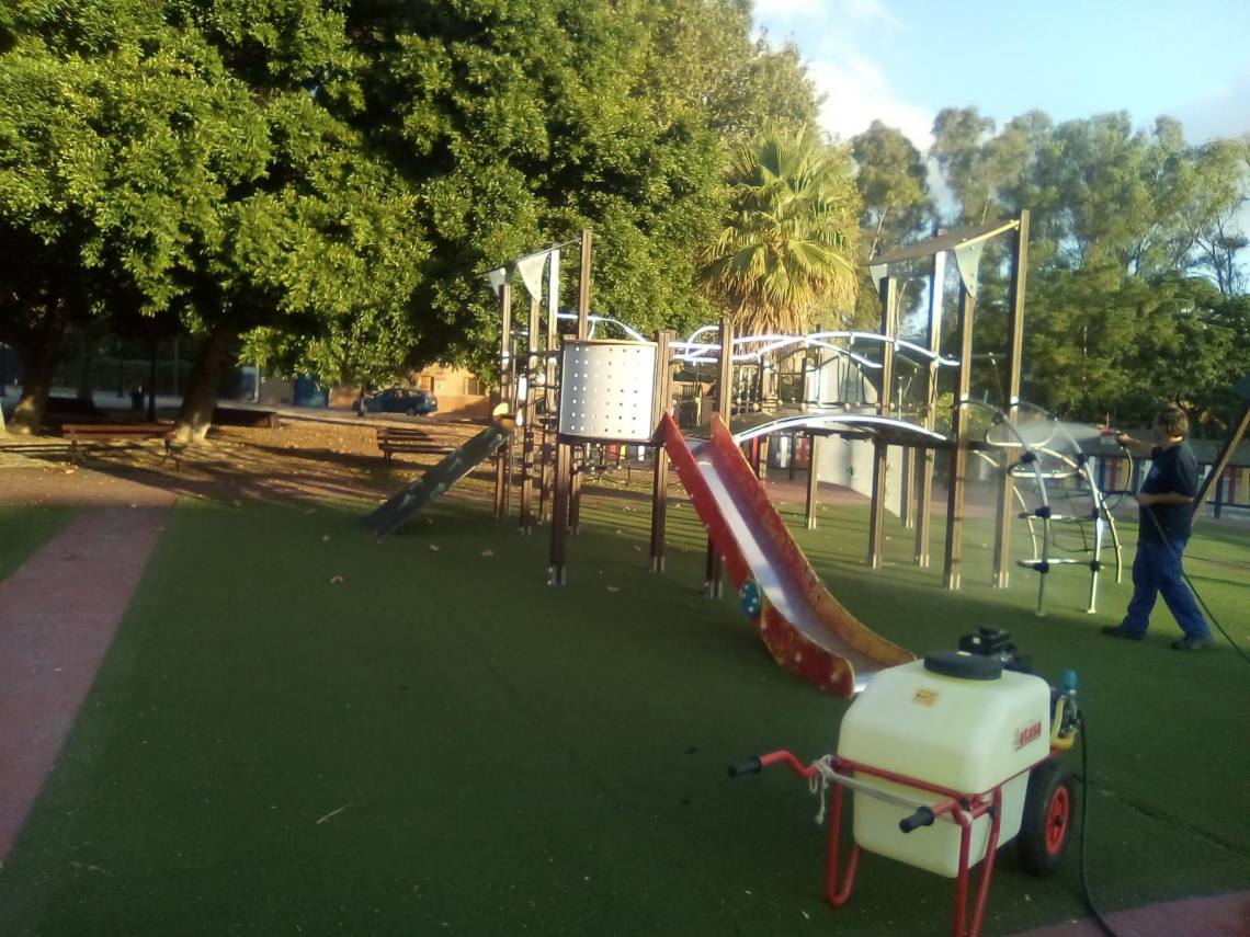 La delegación de Obras y Servicios, que dirige el concejal Evaristo Delgado, continúa con los trabajos de desinfección que se llevan a cabo en todos los parques infantiles del municipio dos veces por semana desde que se levantó el estado de alarma.