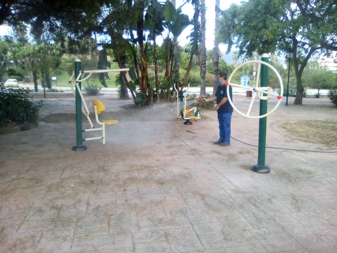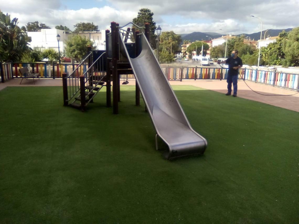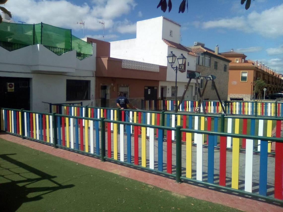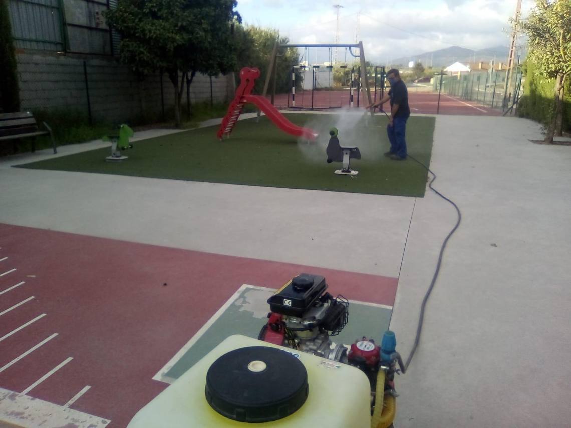 La delegación de Obras y Servicios, que dirige el concejal Evaristo Delgado, continúa con los trabajos de desinfección que se llevan a cabo en todos los parques infantiles del municipio dos veces por semana desde que se levantó el estado de alarma.