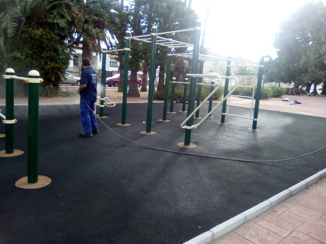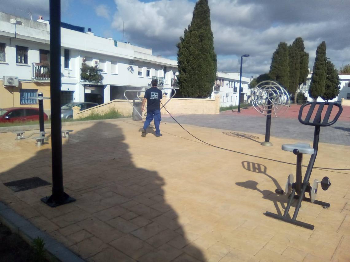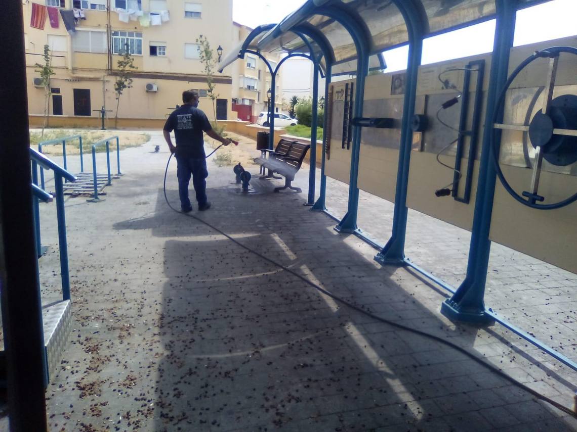 Desde primeras horas de la jornada operarios de la plantilla del Ayuntamiento han comenzado a limpiar y desinfectar estos espacios públicos. Para ello están pulverizando los suelos y las superficies de todos los elementos, así como el mobiliario urbano, con una mezcla de agua y lejía específicamente adecuada para este fin.