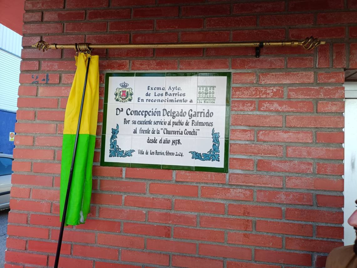 Una placa donde se recoge: ‘El Ayuntamiento de Los Barrios en reconocimiento a Doña Concepción Delgado Garrido por su excelente servicio al pueblo de Palmones al frente de la Churrería Conchi.