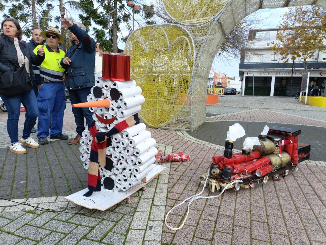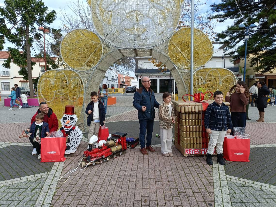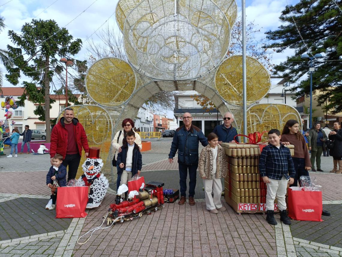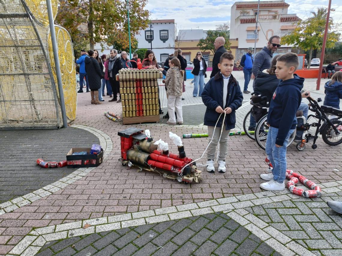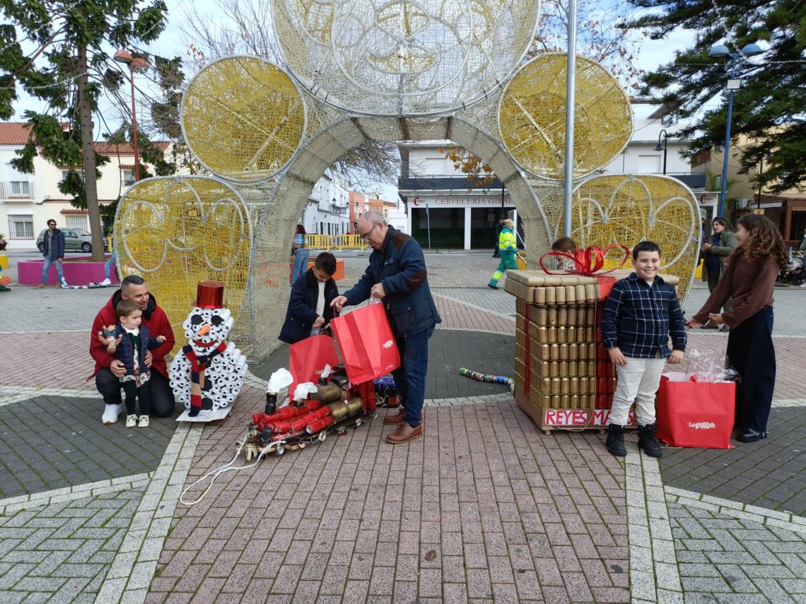 Esculturas de latas en forma de regalo de Navidad, muñeco de nieve o un tren han sido algunas de las figuras que han paseado junto a sus familias los cientos de niños y niñas que se han dado cita esta mañana en Palmones.