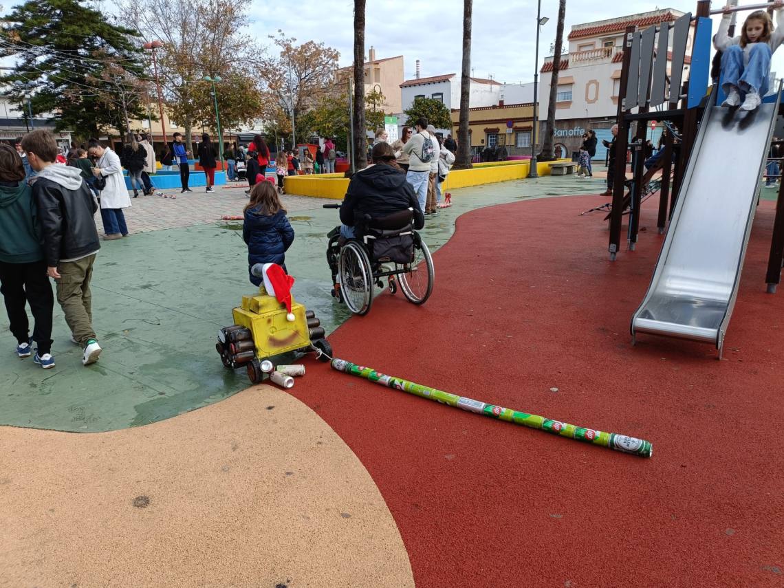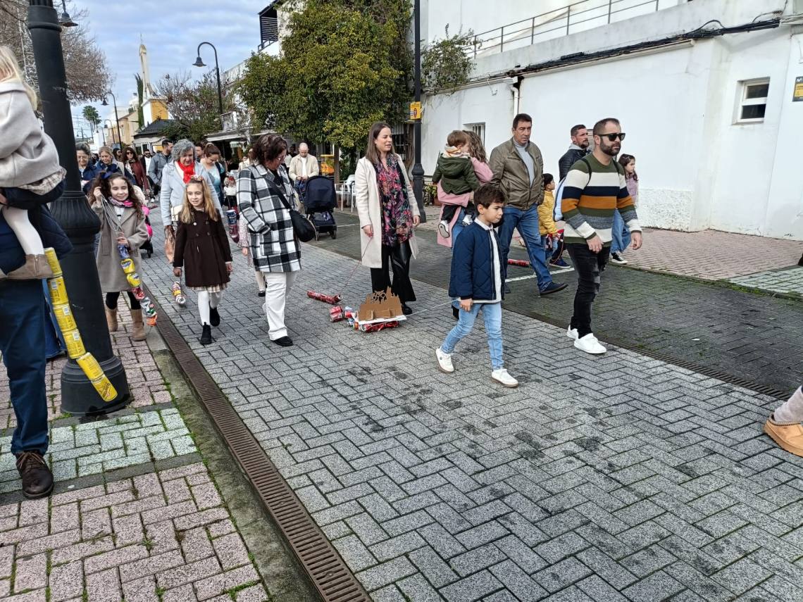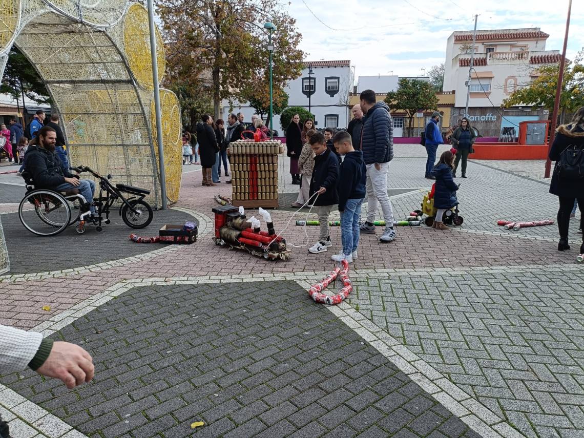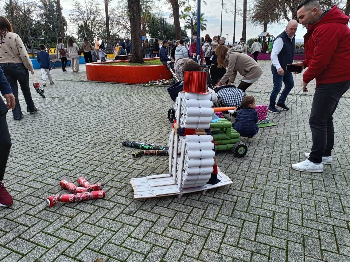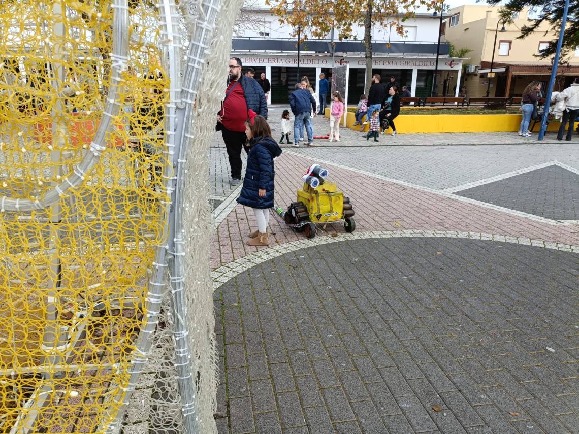 Esculturas de latas en forma de regalo de Navidad, muñeco de nieve o un tren han sido algunas de las figuras que han paseado junto a sus familias los cientos de niños y niñas que se han dado cita esta mañana en Palmones.