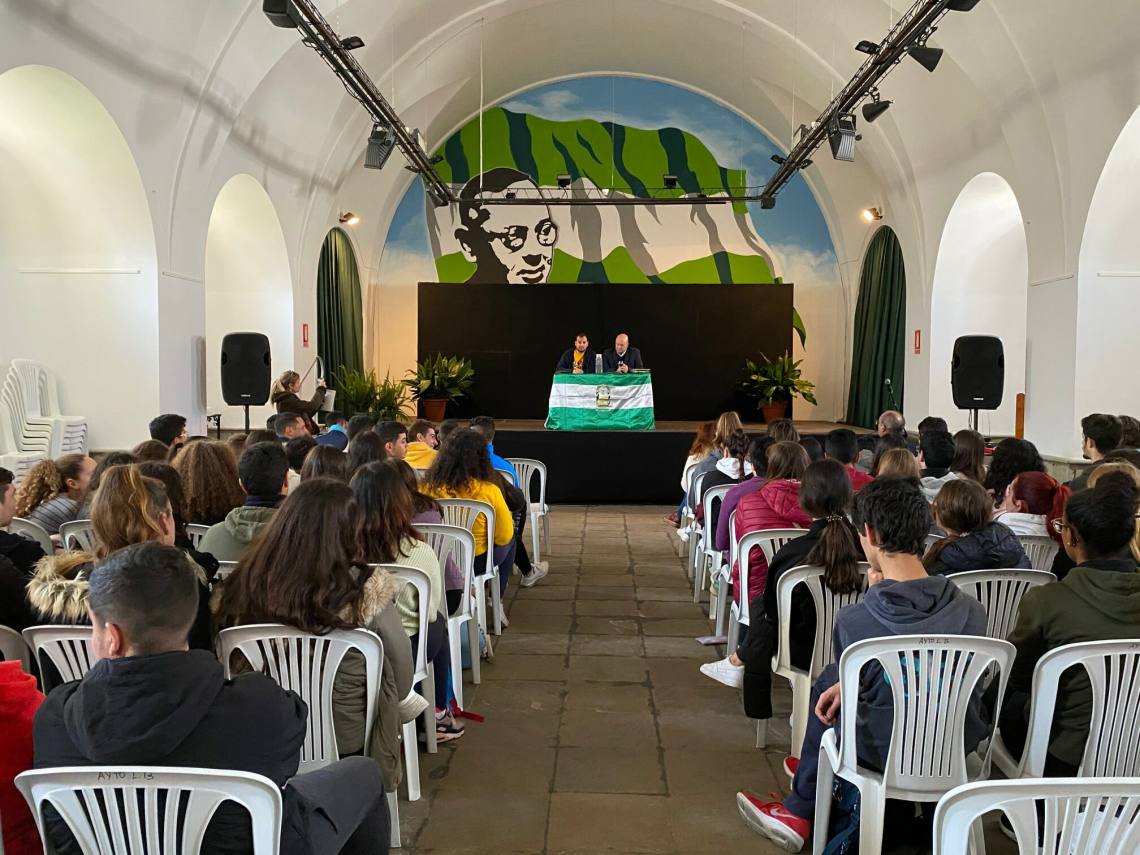 El exalcalde, escritor y articulista algecireño ha sido el protagonista hoy de las VII Jornadas Culturales Andaluzas que se celebran en Los Barrios con la conferencia sobre el habla andaluza, impartida en la sala del edificio pósito, para alumnos de 4º de ESO del Instituto ‘Sierra Luna’ y 1º de Bachiller del Instituto ‘Carlos Cano’.